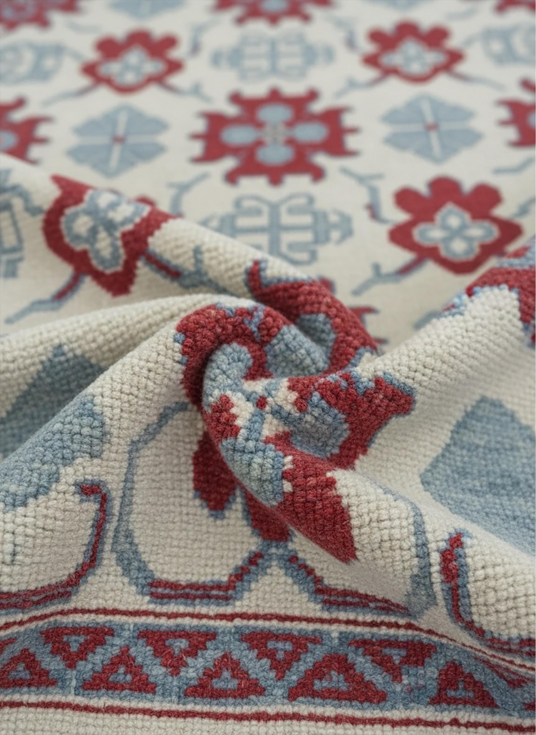 • Natural Dye Variability: The use of natural dyes means colors can vary slightly from one batch to another. Maintaining consistent shades of teal, off-white, and sage green across a large rug is a significant challenge.