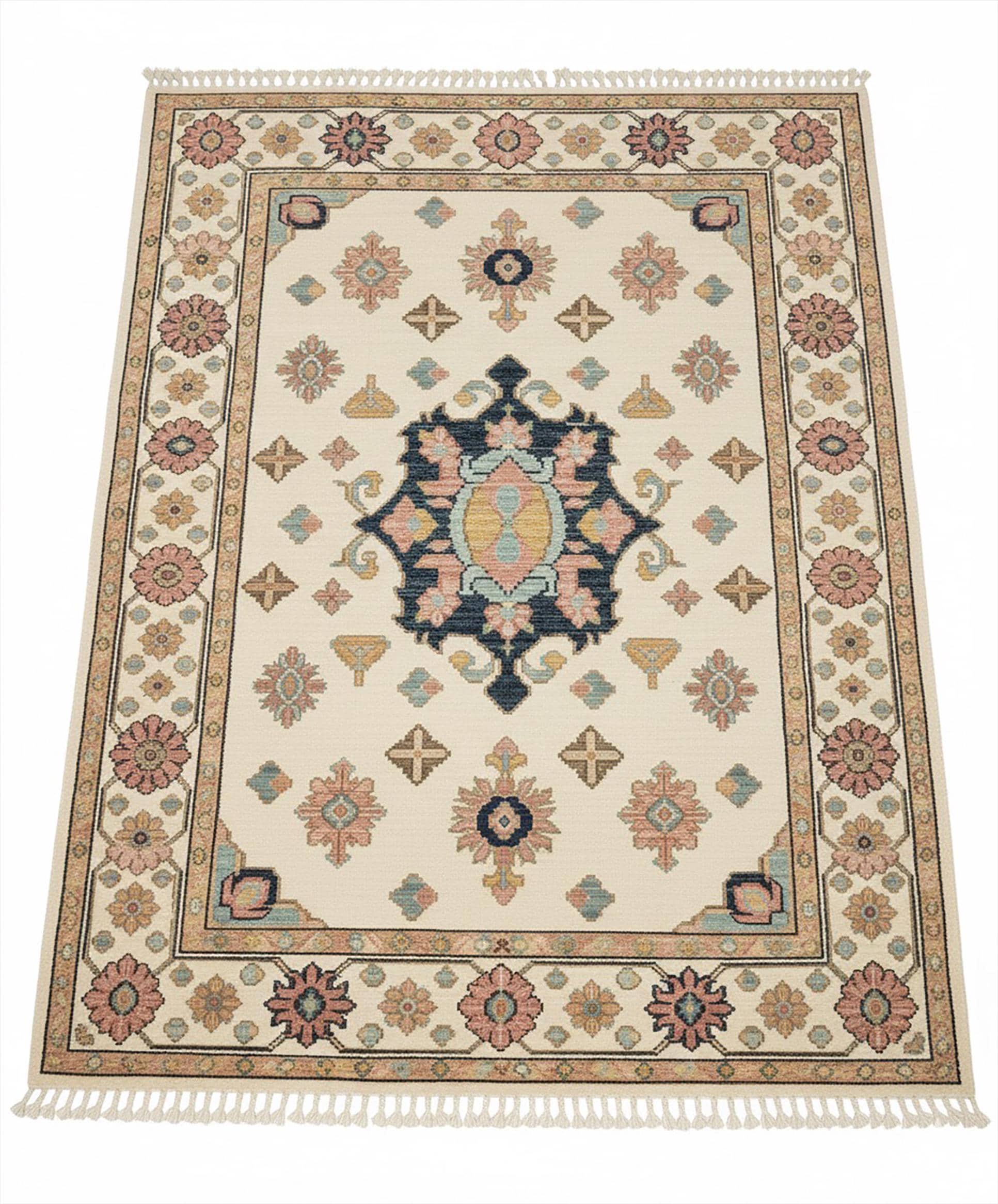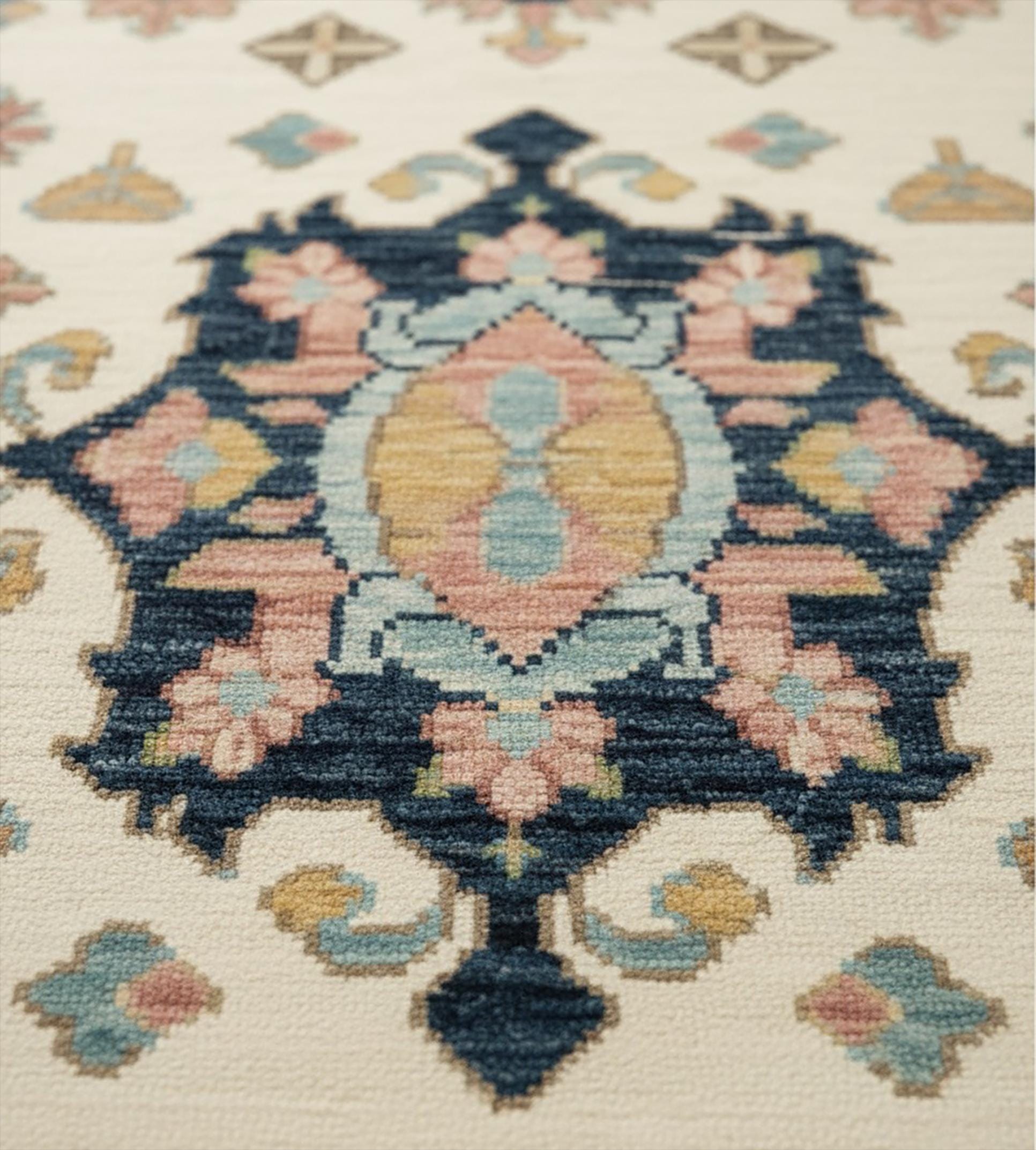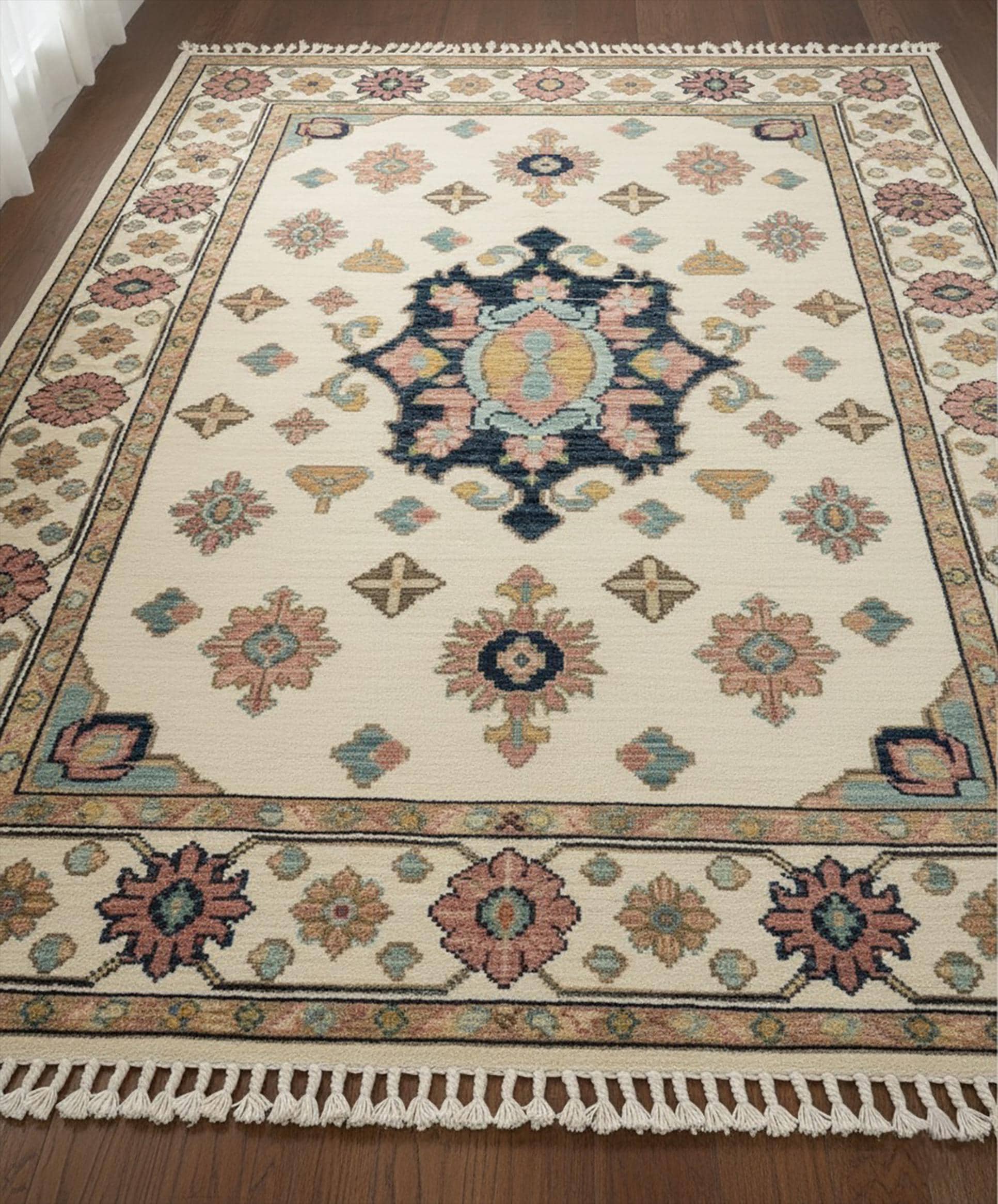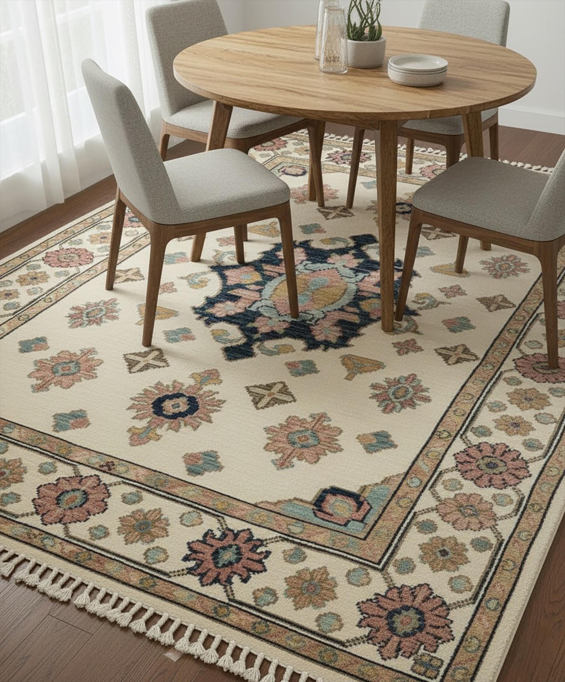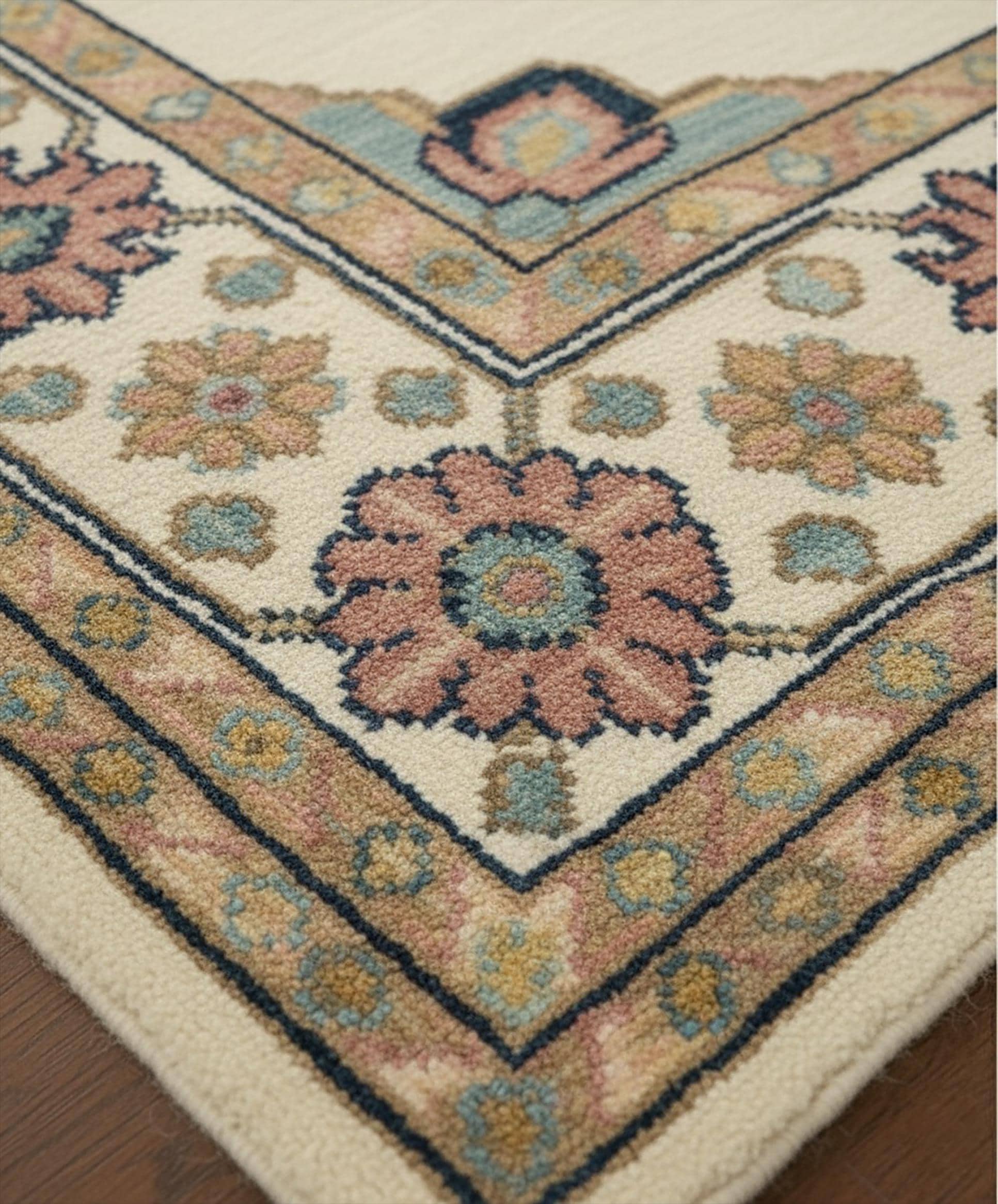 This hand knotted Oushak rug features a soothing ivory base accented with soft blush, sage, and dusty blue tones, forming an elegant floral medallion surrounded by balanced geometric and botanical motifs. Its traditional design and refined craftsmanship evoke warmth, serenity, and timeless charm, transforming any space into a cozy, sophisticated retreat. With its durable texture and artisanal character, this rug adds both comfort and heritage-inspired beauty to your home, inviting a feeling of harmony and effortless elegance.