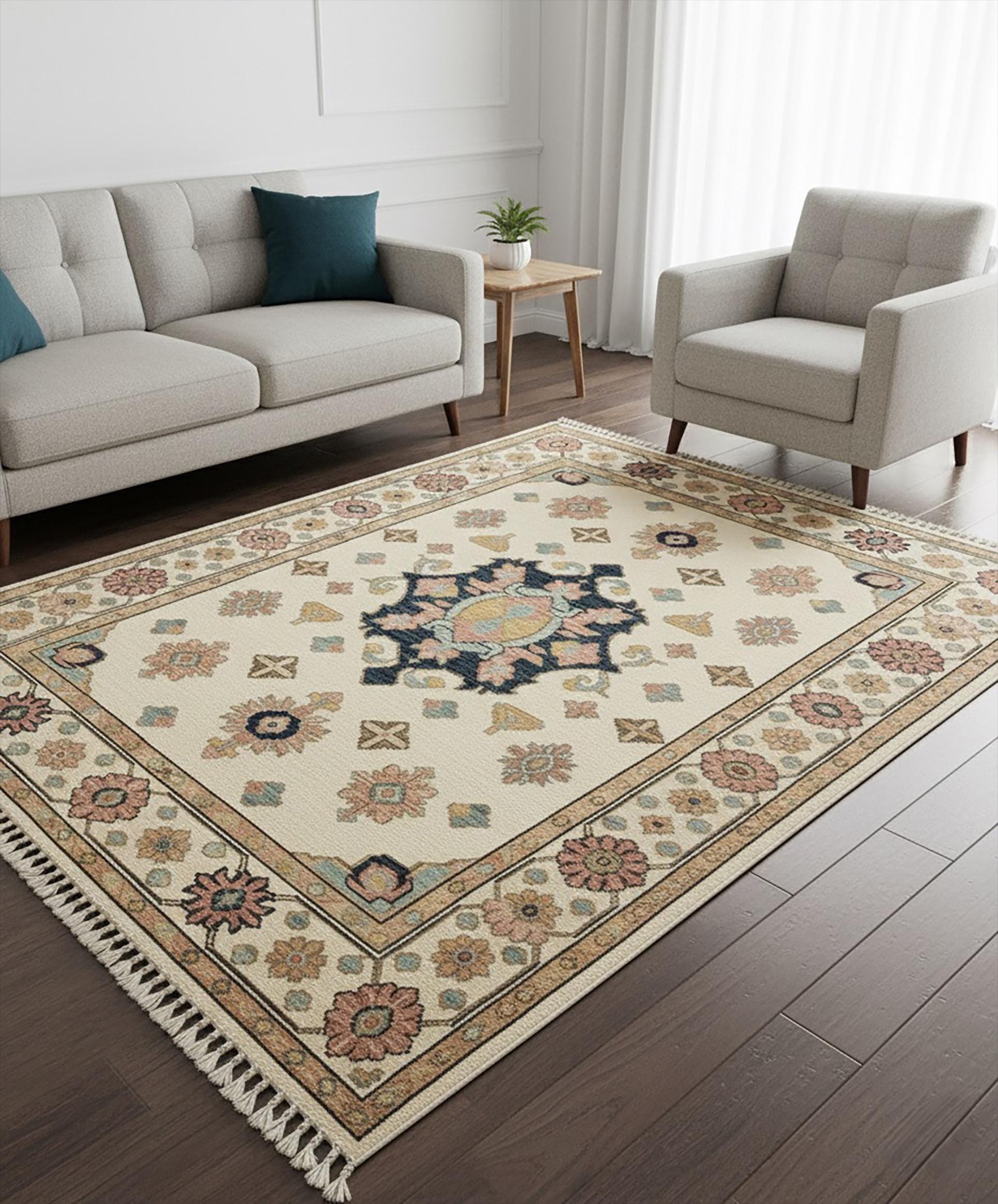 • Soft ivory base beautifully complemented by muted tones of blush pink, dusty blue, sage green, and warm beige, creating a calm and timeless aesthetic