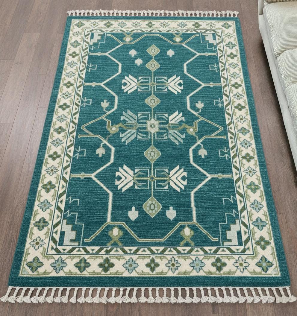 Teal Geometric Oushak Rug, 5x8, 6x9, 7x10, 9x12, 8x10 Living Room Rug, Ivory Border Sage Green Accent Hand Knotted Wool Rug For Bedroom