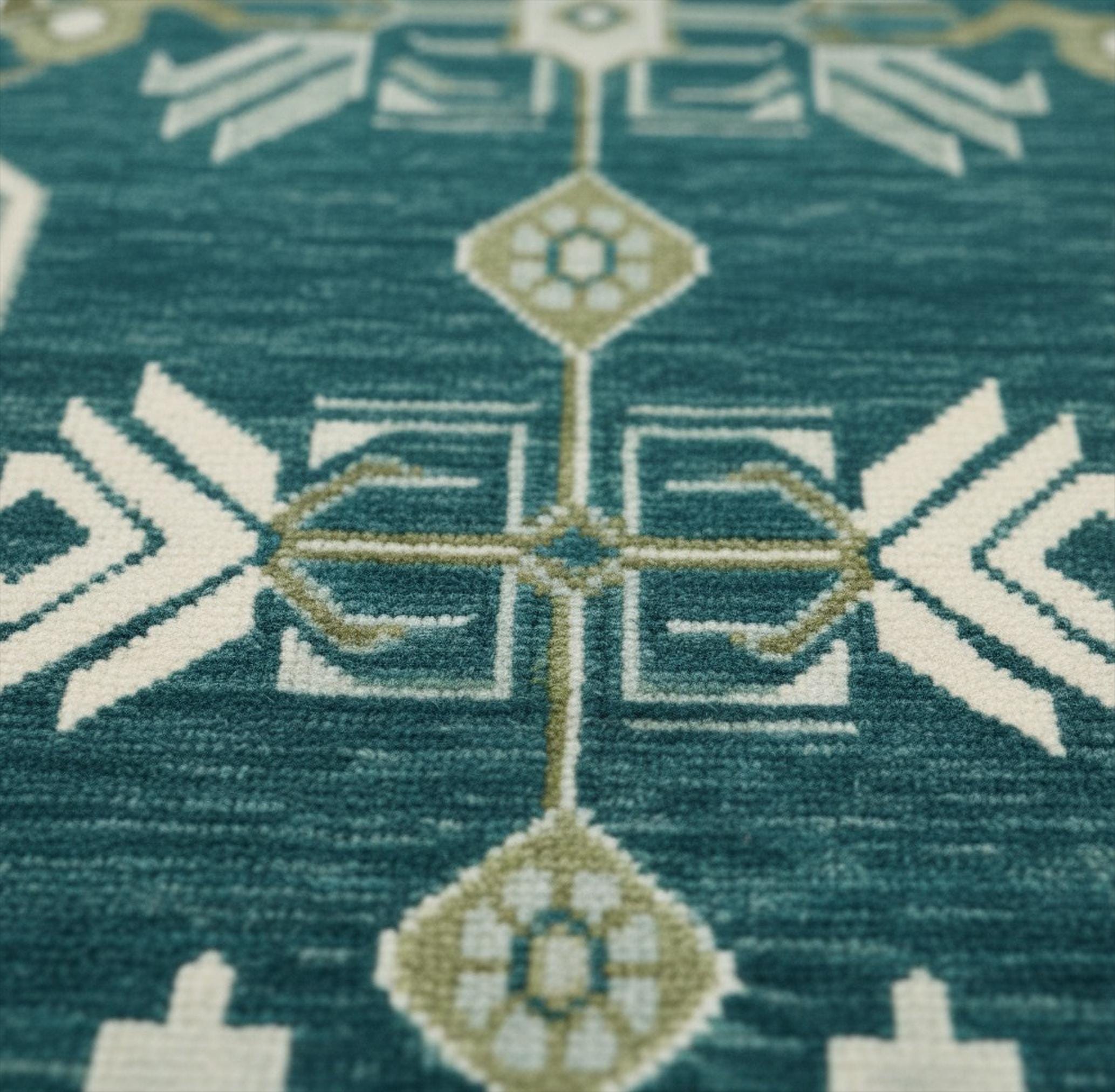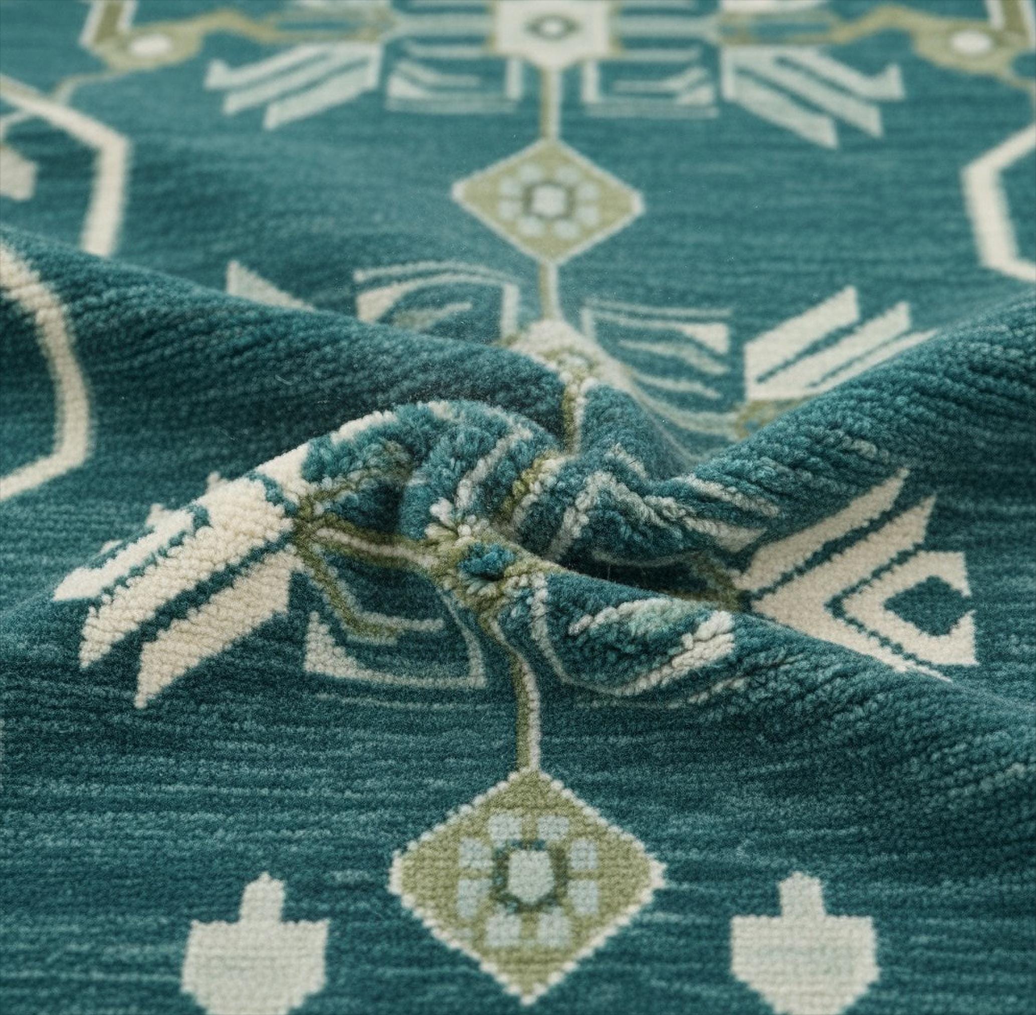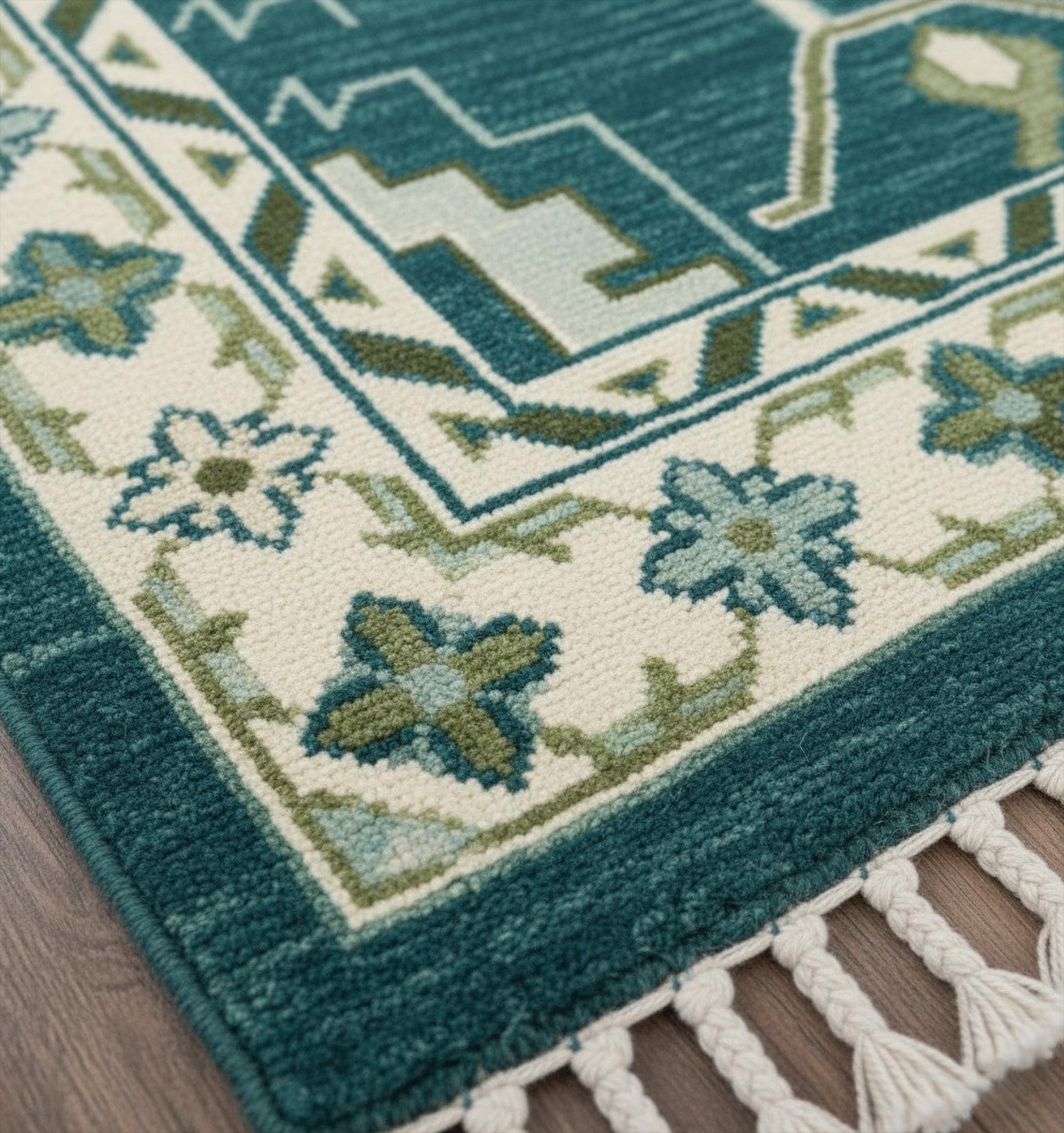 • Natural Dye Variability: The use of natural dyes means colors can vary slightly from one batch to another. Maintaining consistent shades of teal, off-white, and sage green across a large rug is a significant challenge.