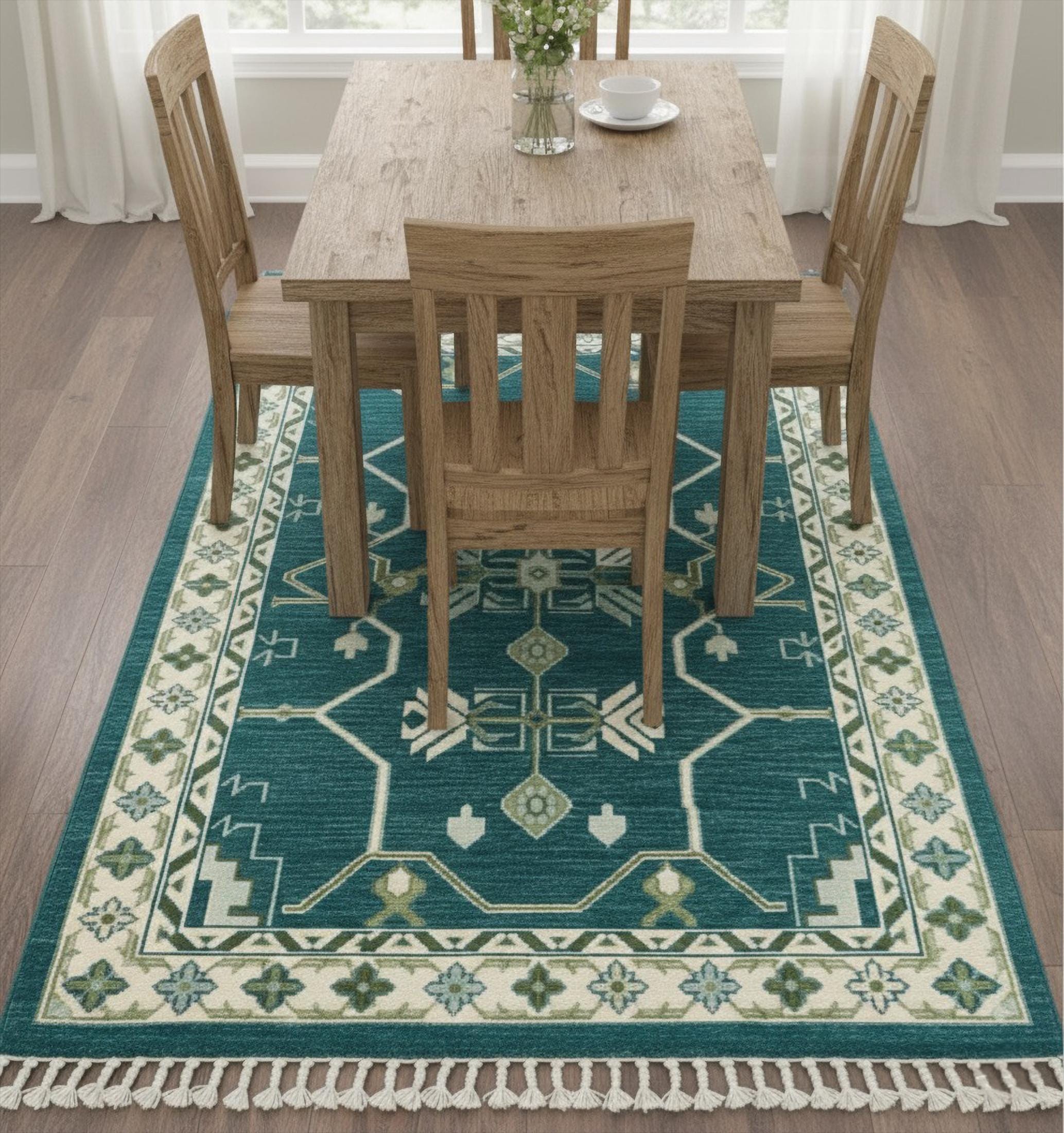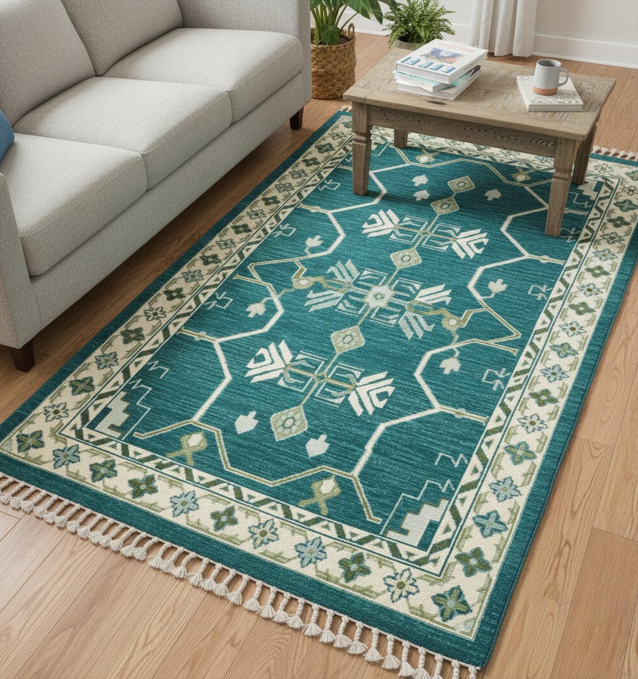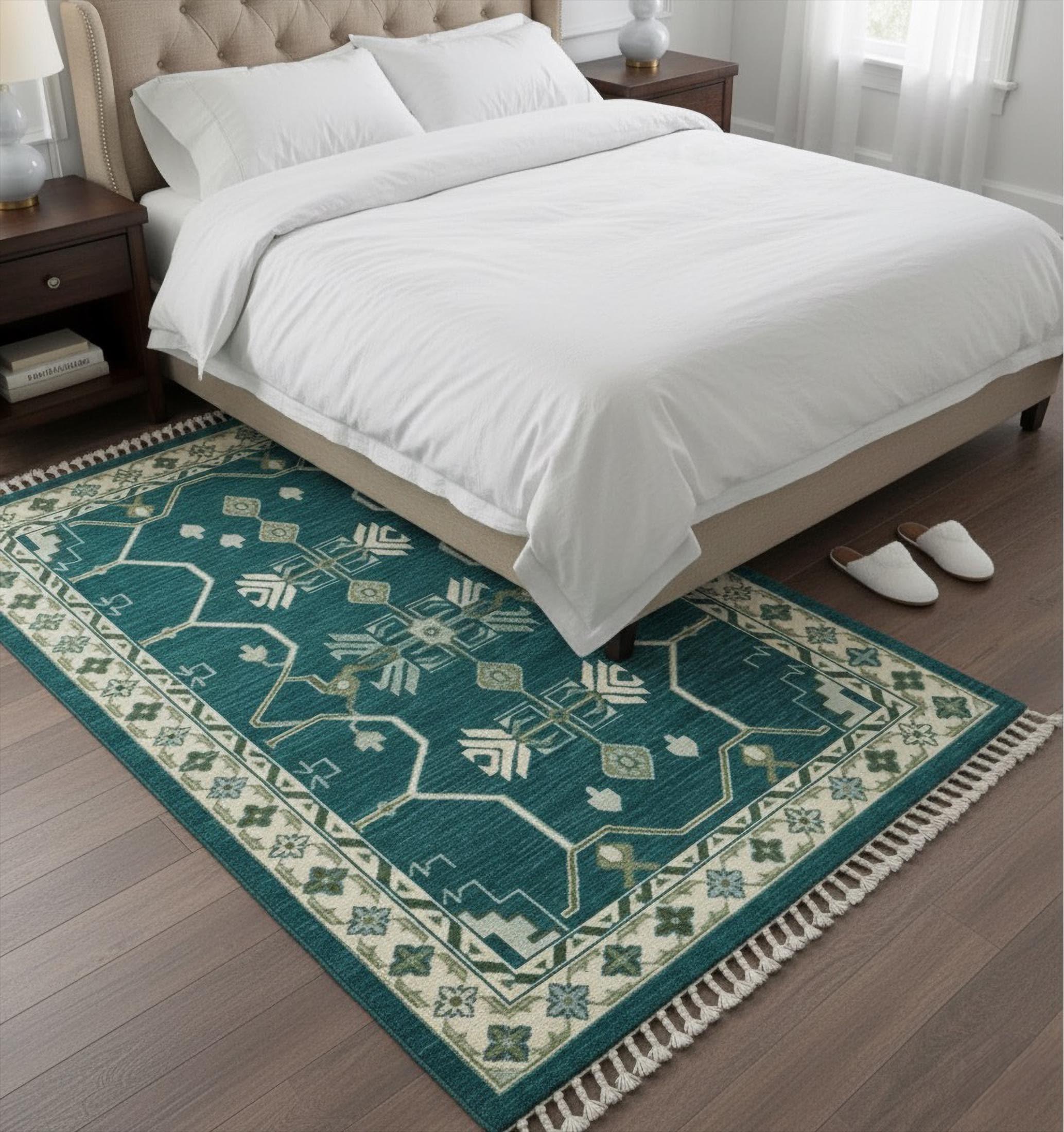 • Natural Dye Variability: The use of natural dyes means colors can vary slightly from one batch to another. Maintaining consistent shades of teal, off-white, and sage green across a large rug is a significant challenge.
