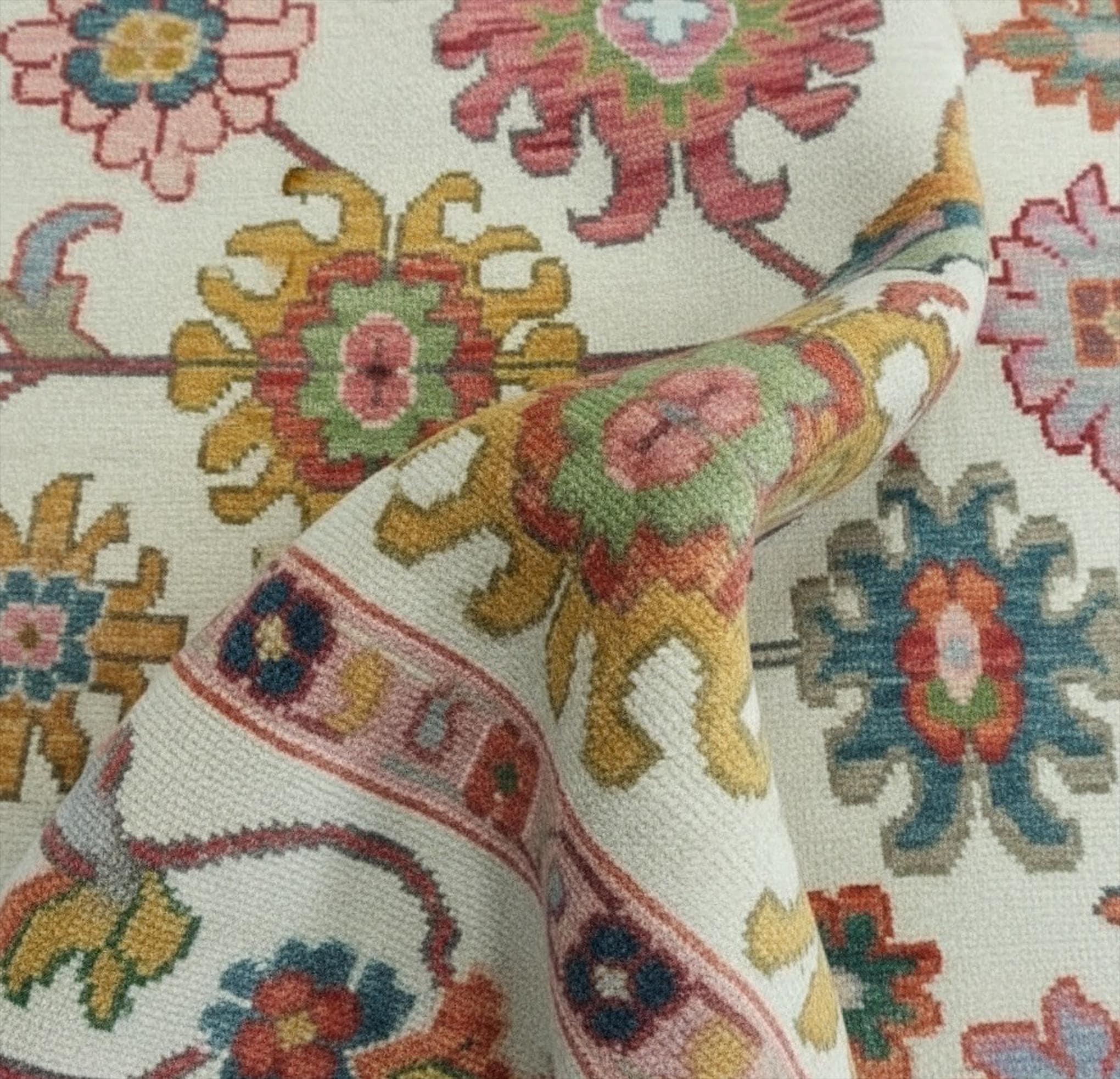 • Natural Dye Variability: The use of natural dyes means colors can vary slightly from one batch to another. Maintaining consistent shades of teal, off-white, and sage green across a large rug is a significant challenge.