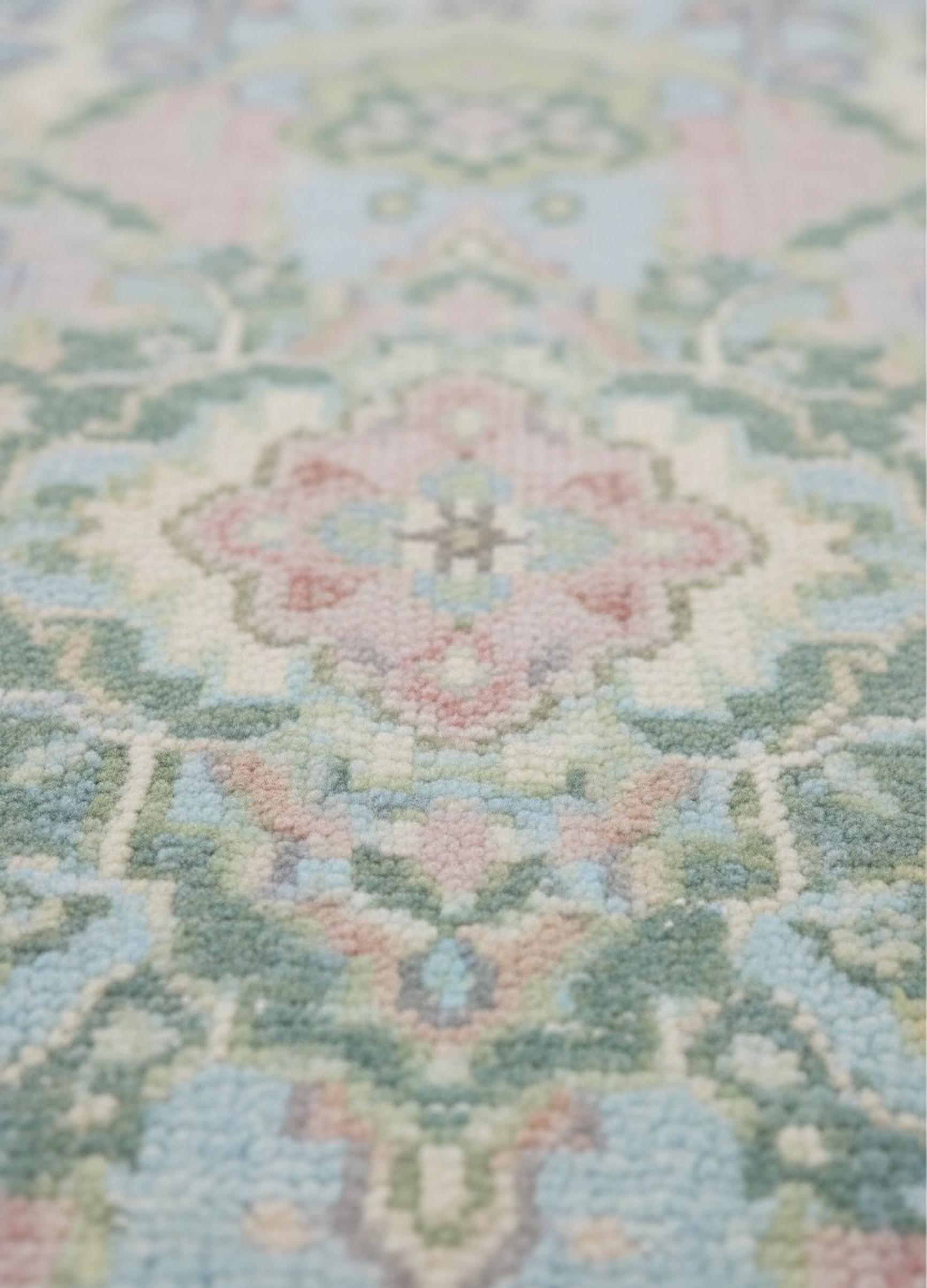 • Natural Dye Variability: The use of natural dyes means colors can vary slightly from one batch to another. Maintaining consistent shades of teal, off-white, and sage green across a large rug is a significant challenge.