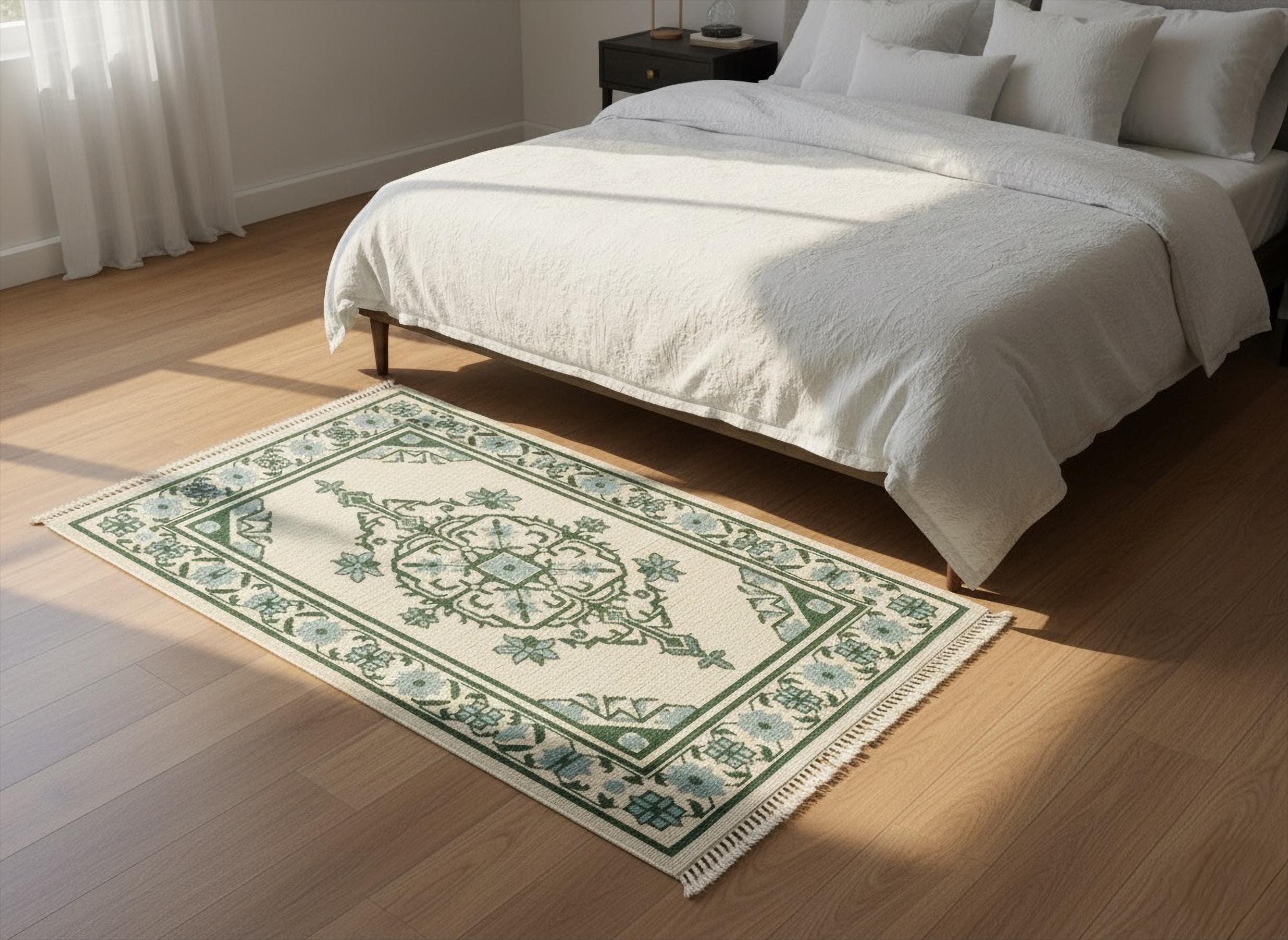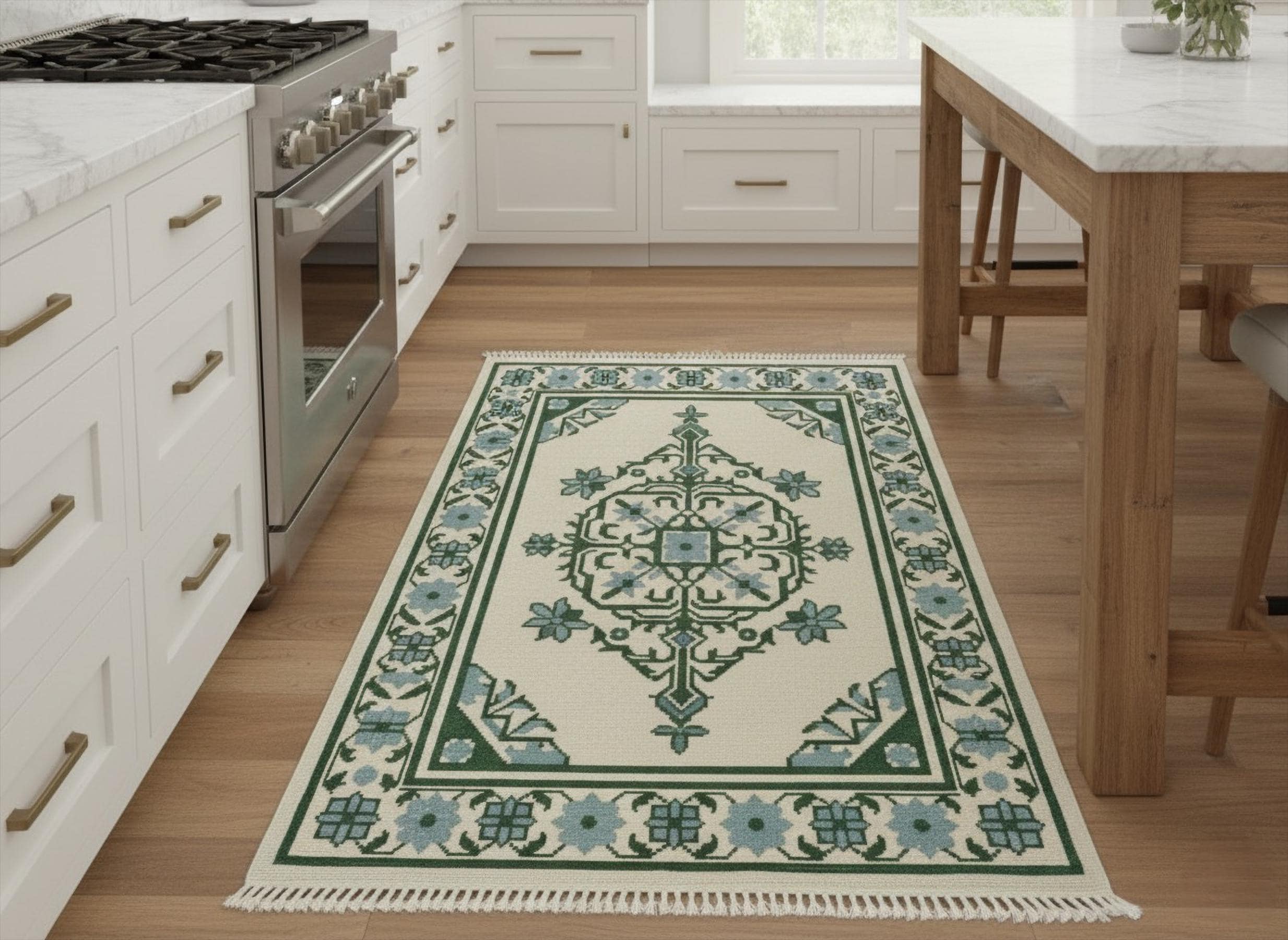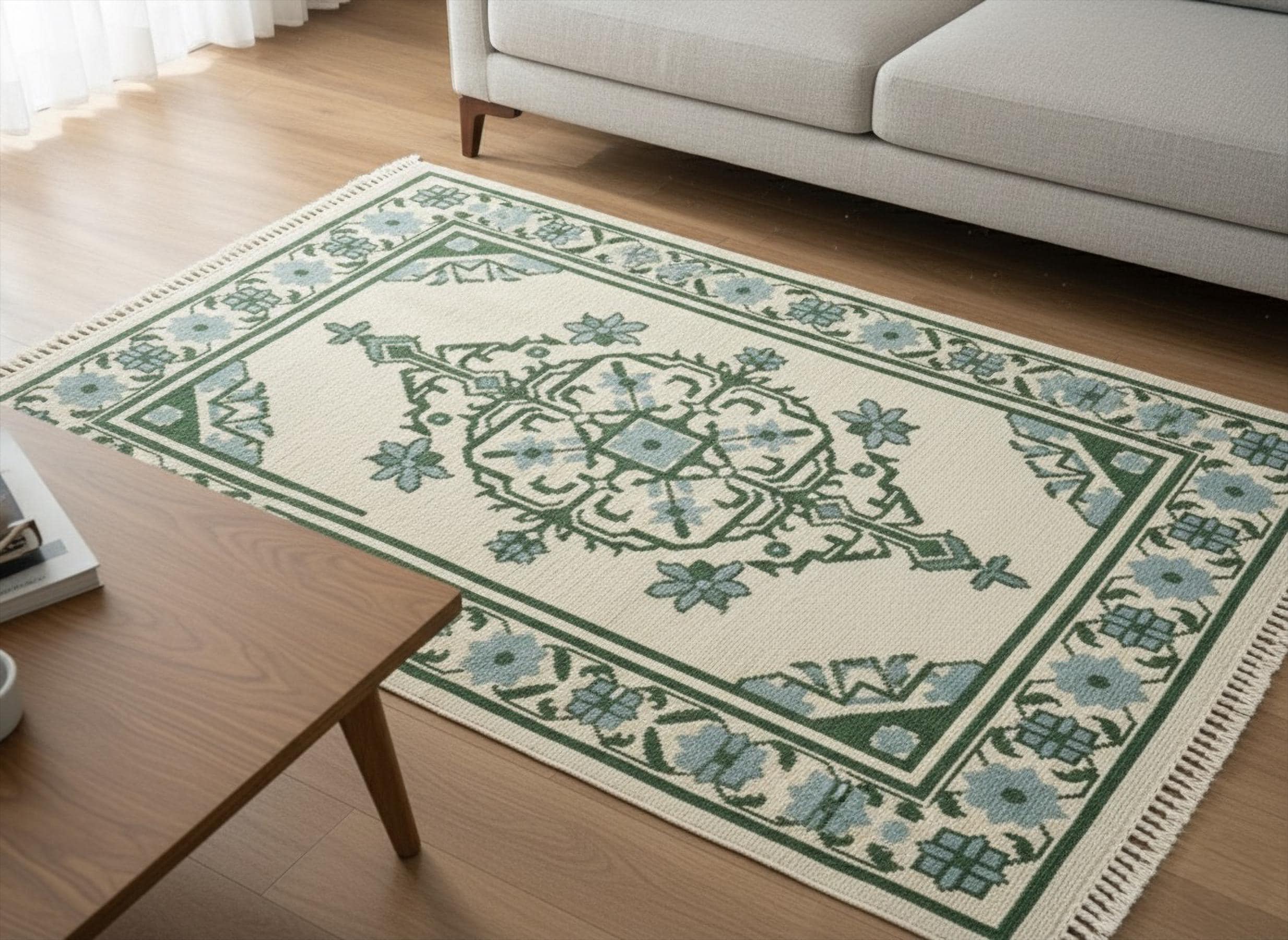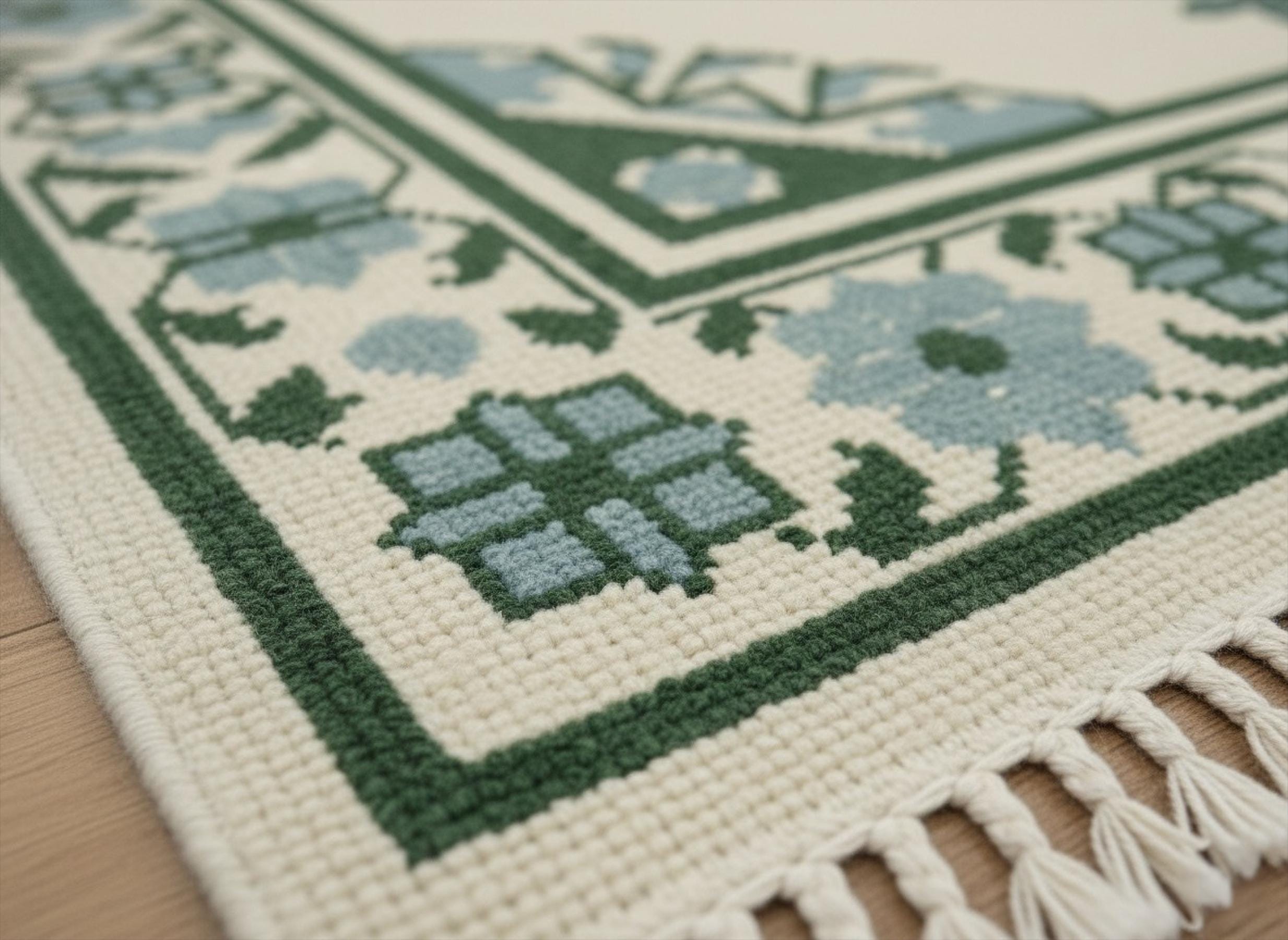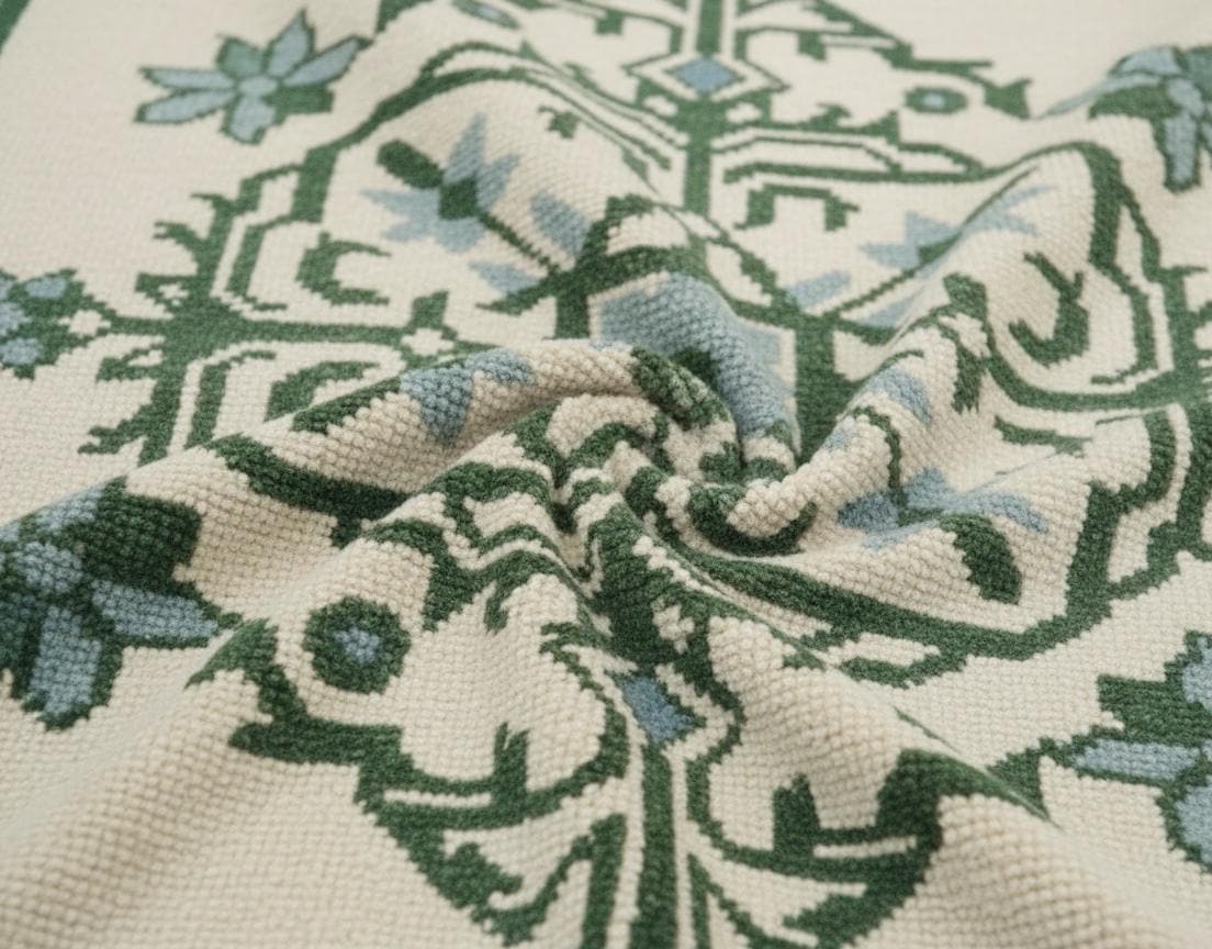 • Natural Dye Variability: The use of natural dyes means colors can vary slightly from one batch to another. Maintaining consistent shades of teal, off-white, and sage green across a large rug is a significant challenge.