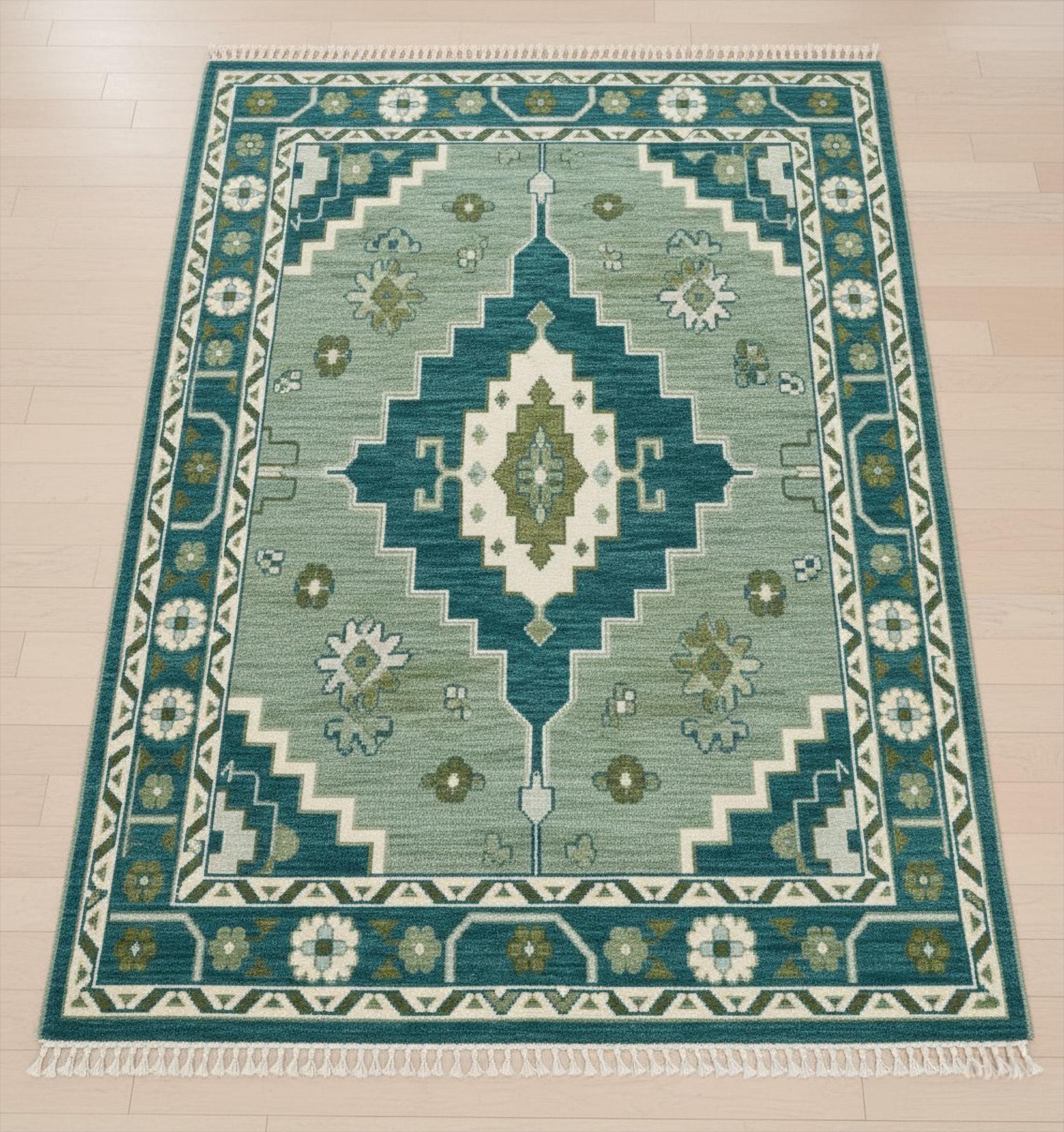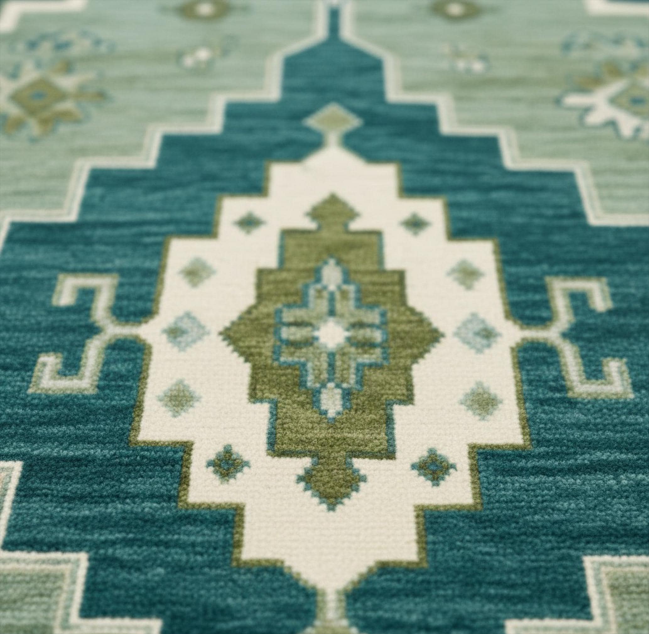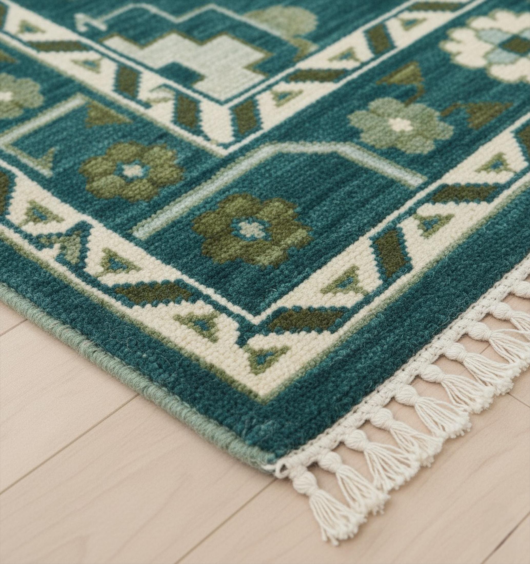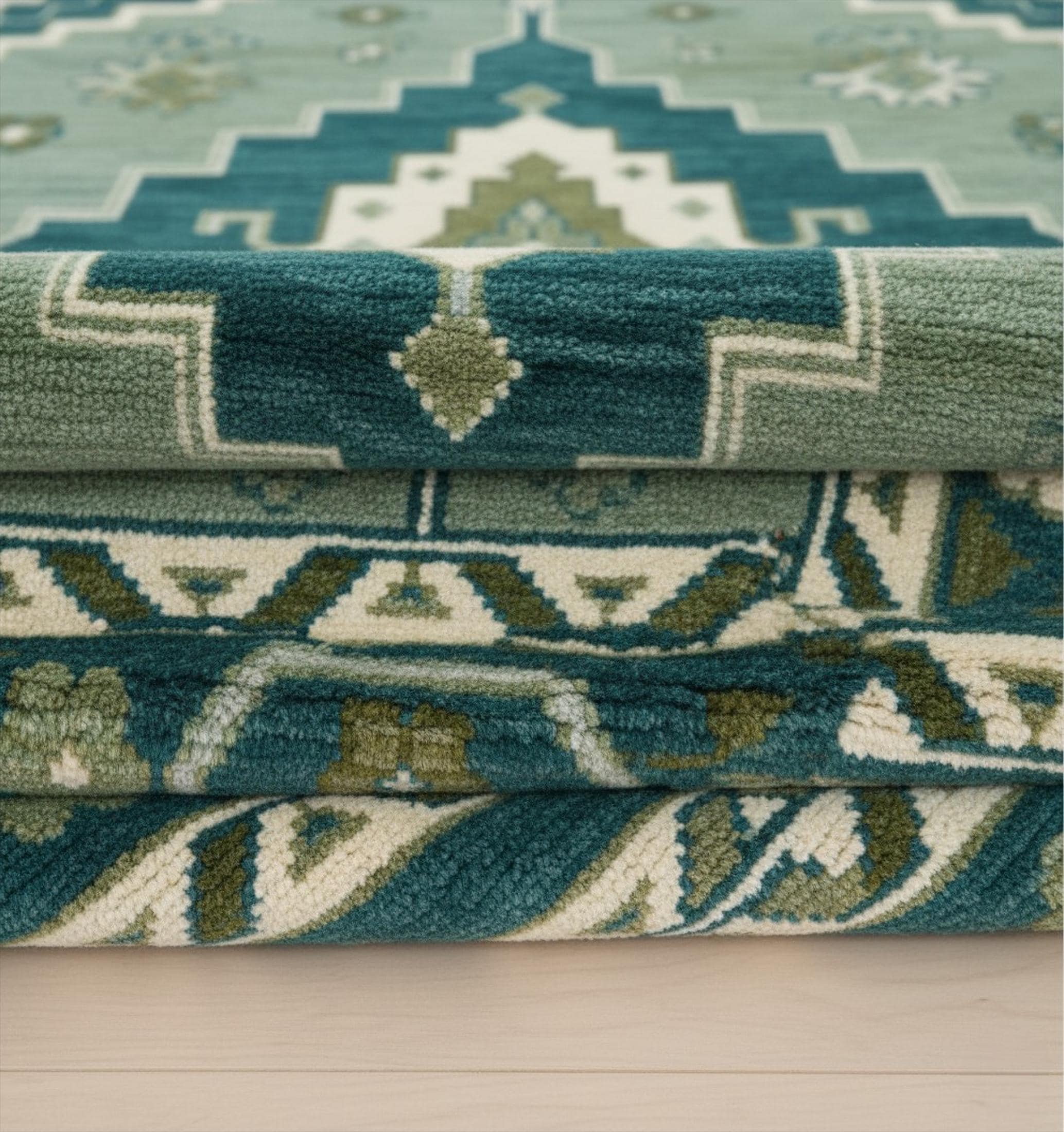 • Natural Dye Variability: The use of natural dyes means colors can vary slightly from one batch to another. Maintaining consistent shades of teal, off-white, and sage green across a large rug is a significant challenge.