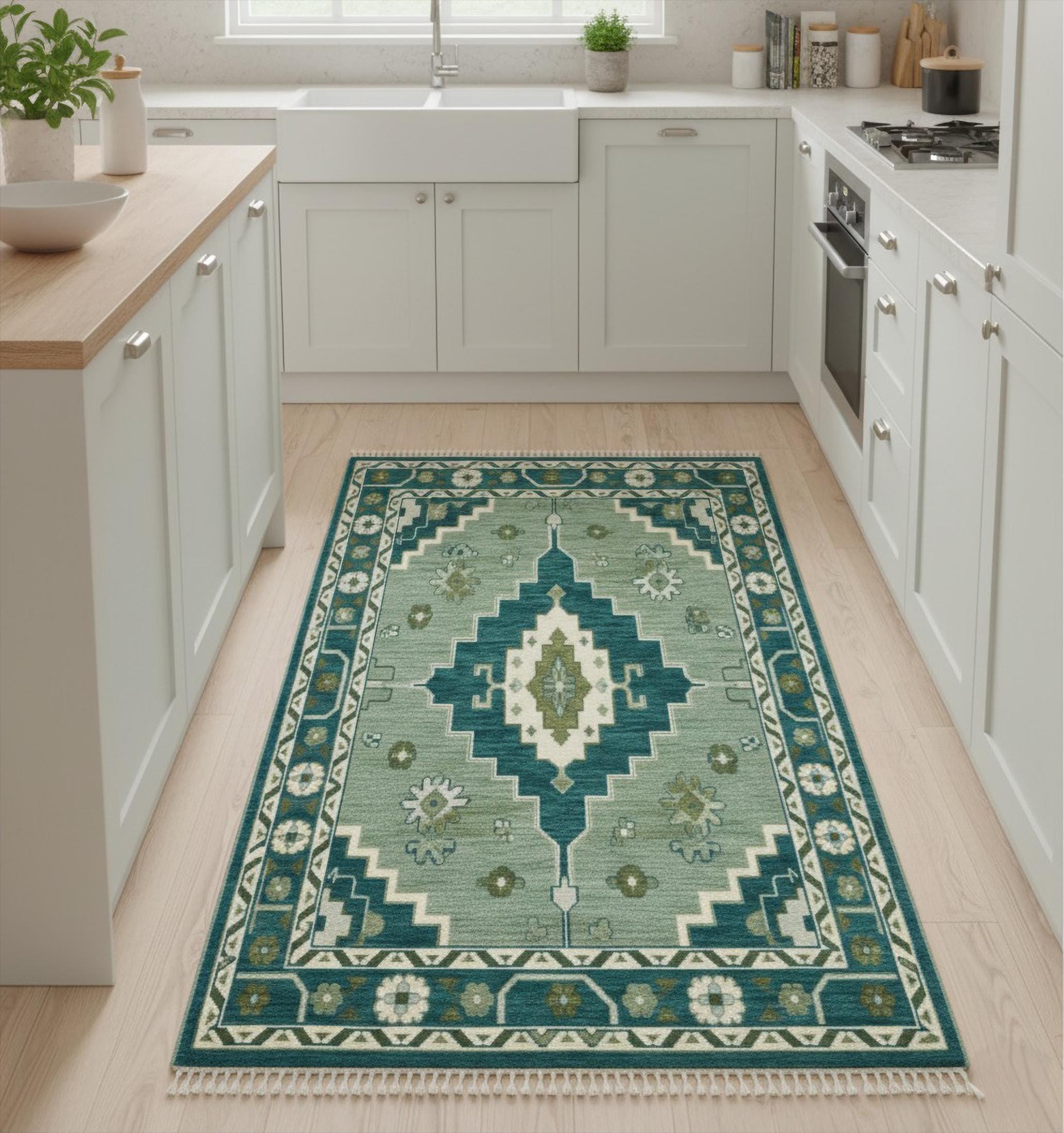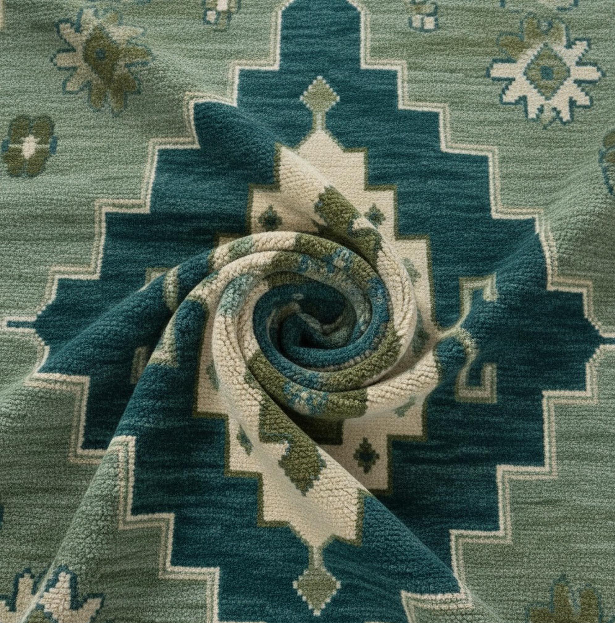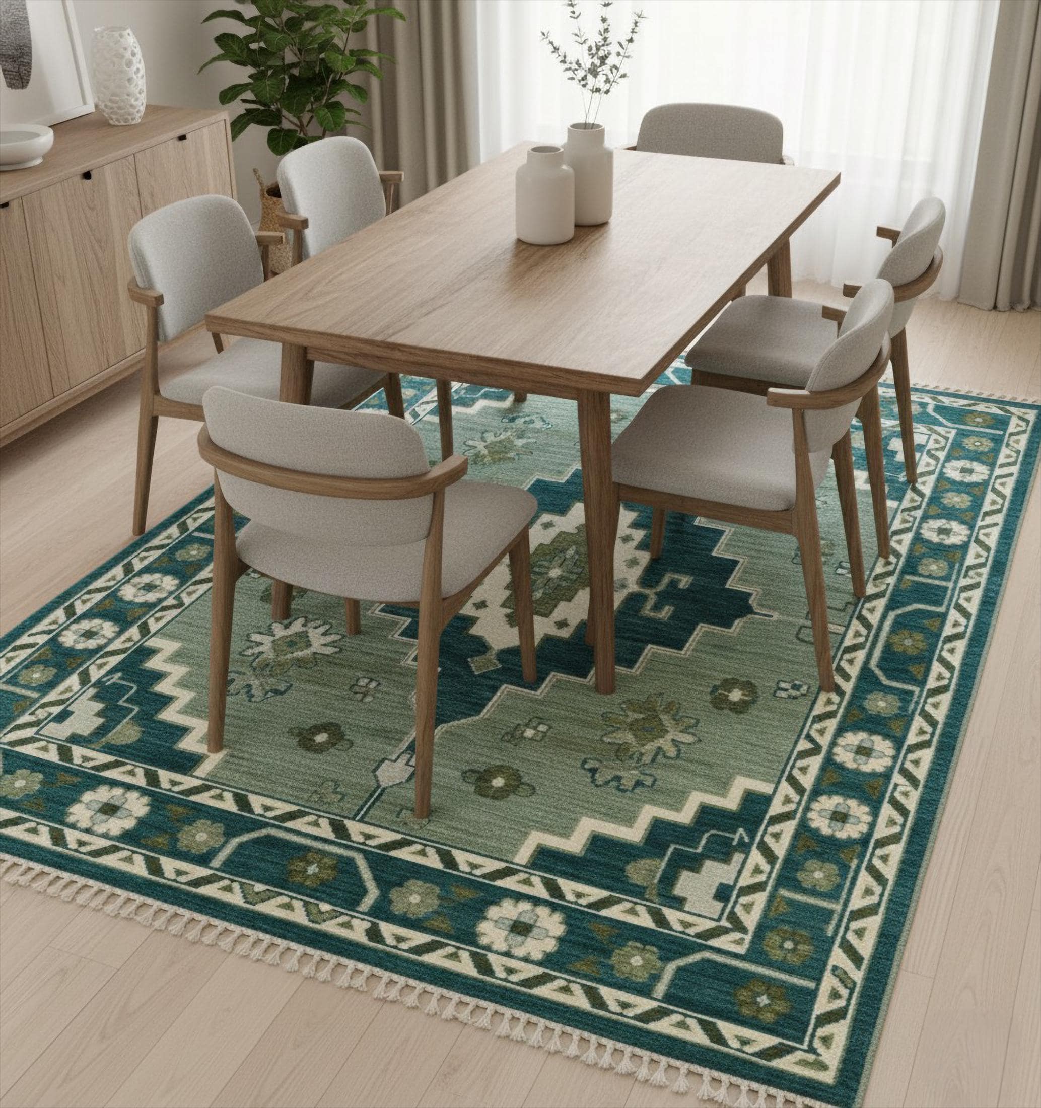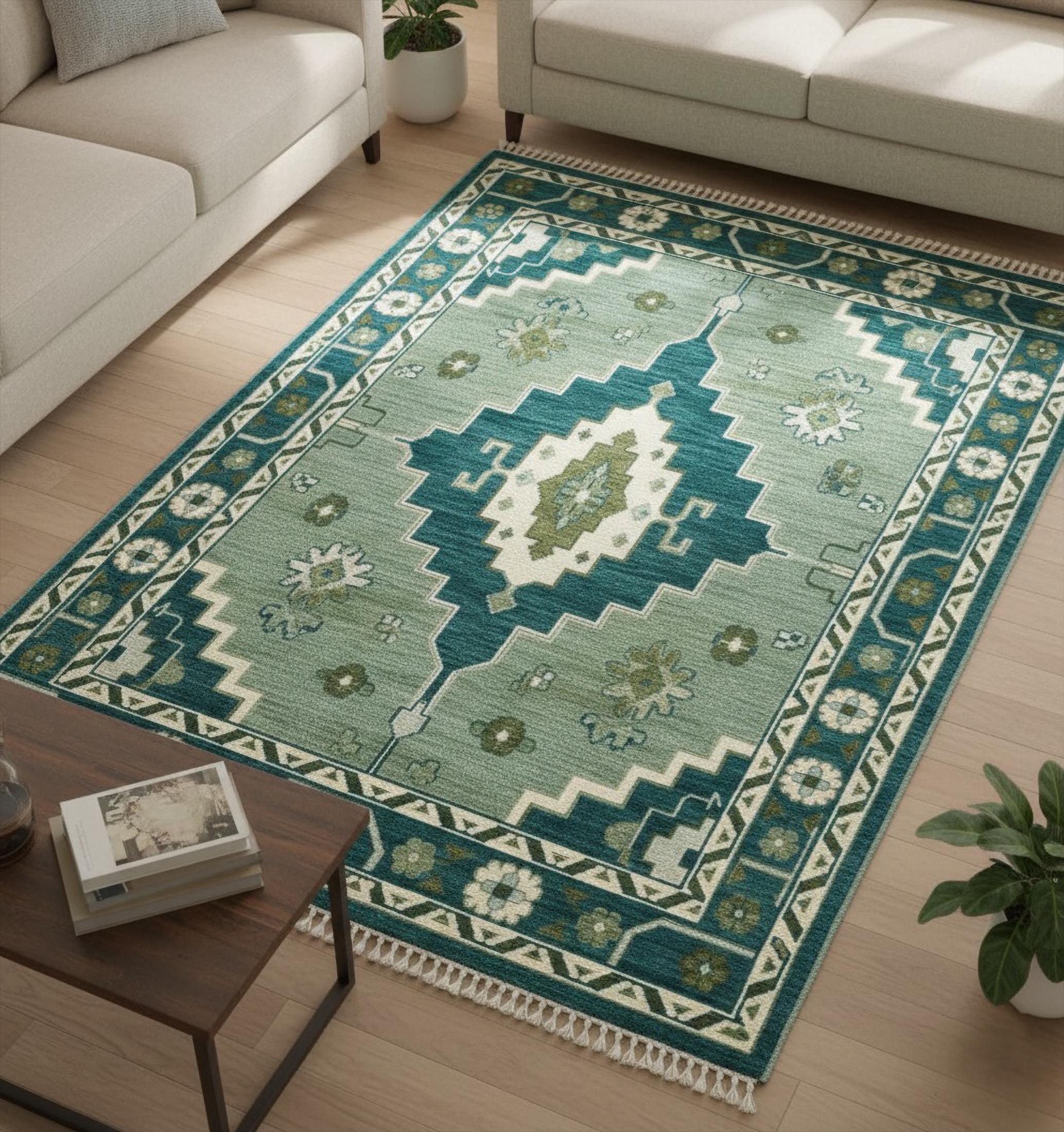 • Natural Dye Variability: The use of natural dyes means colors can vary slightly from one batch to another. Maintaining consistent shades of teal, off-white, and sage green across a large rug is a significant challenge.