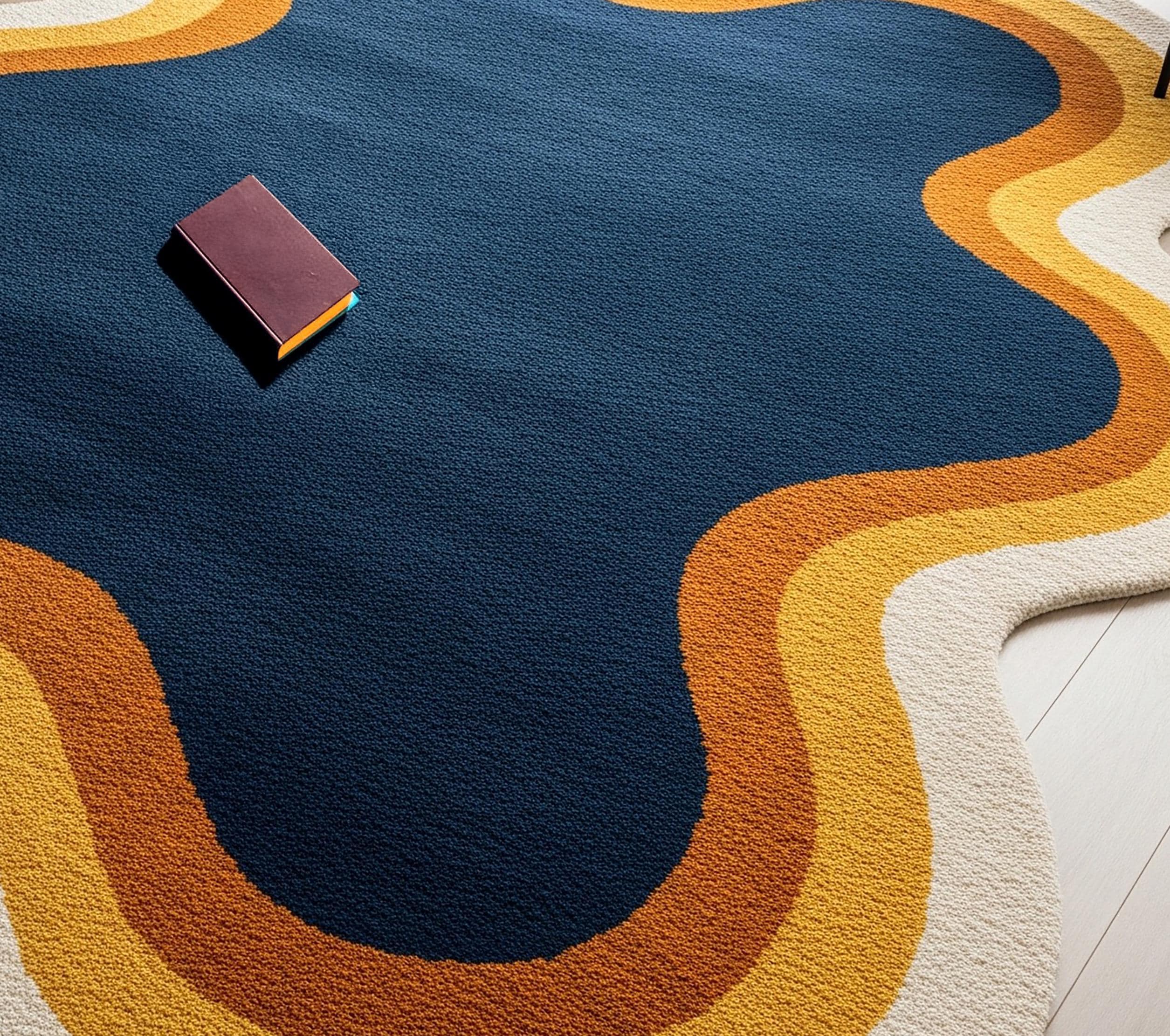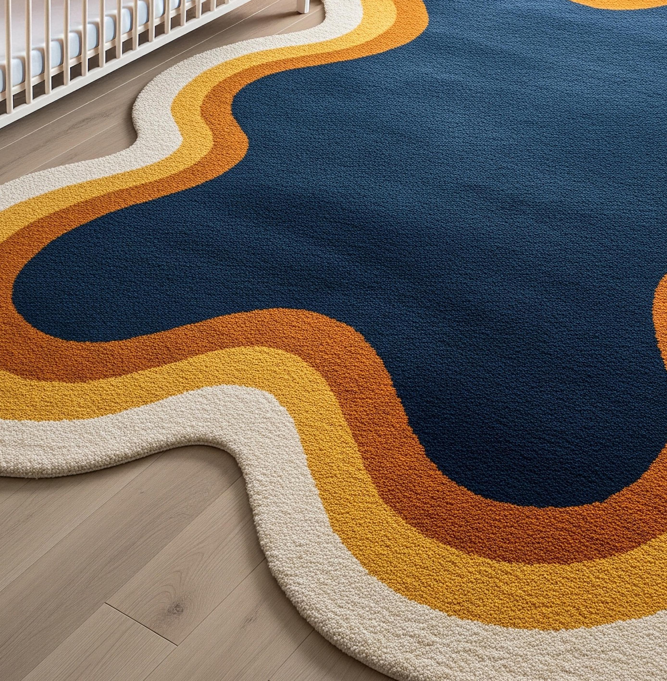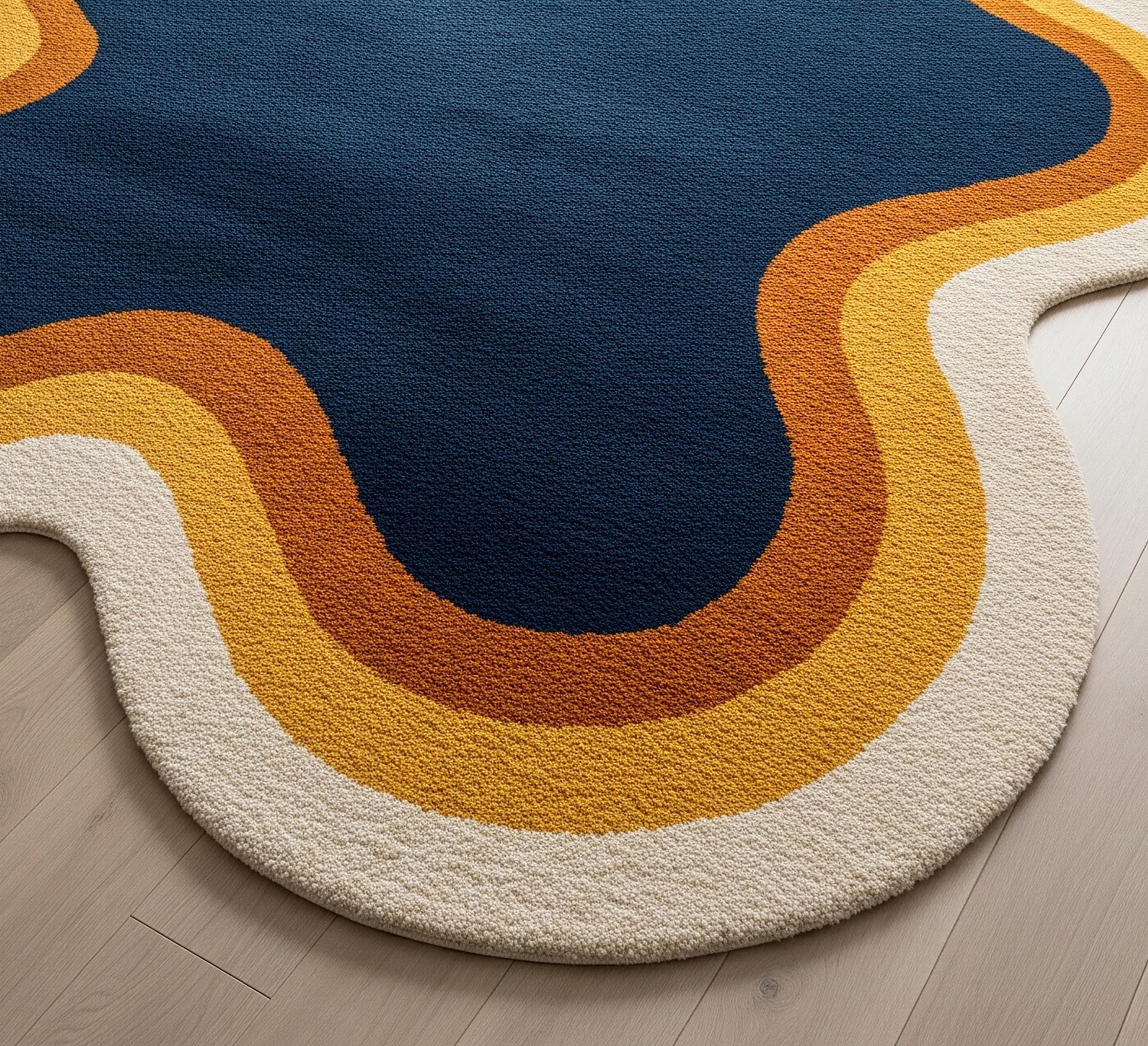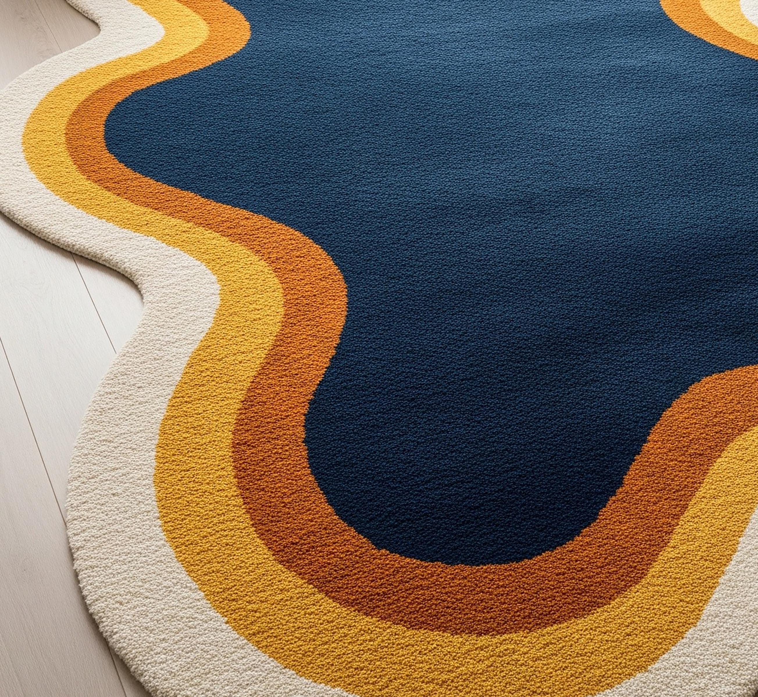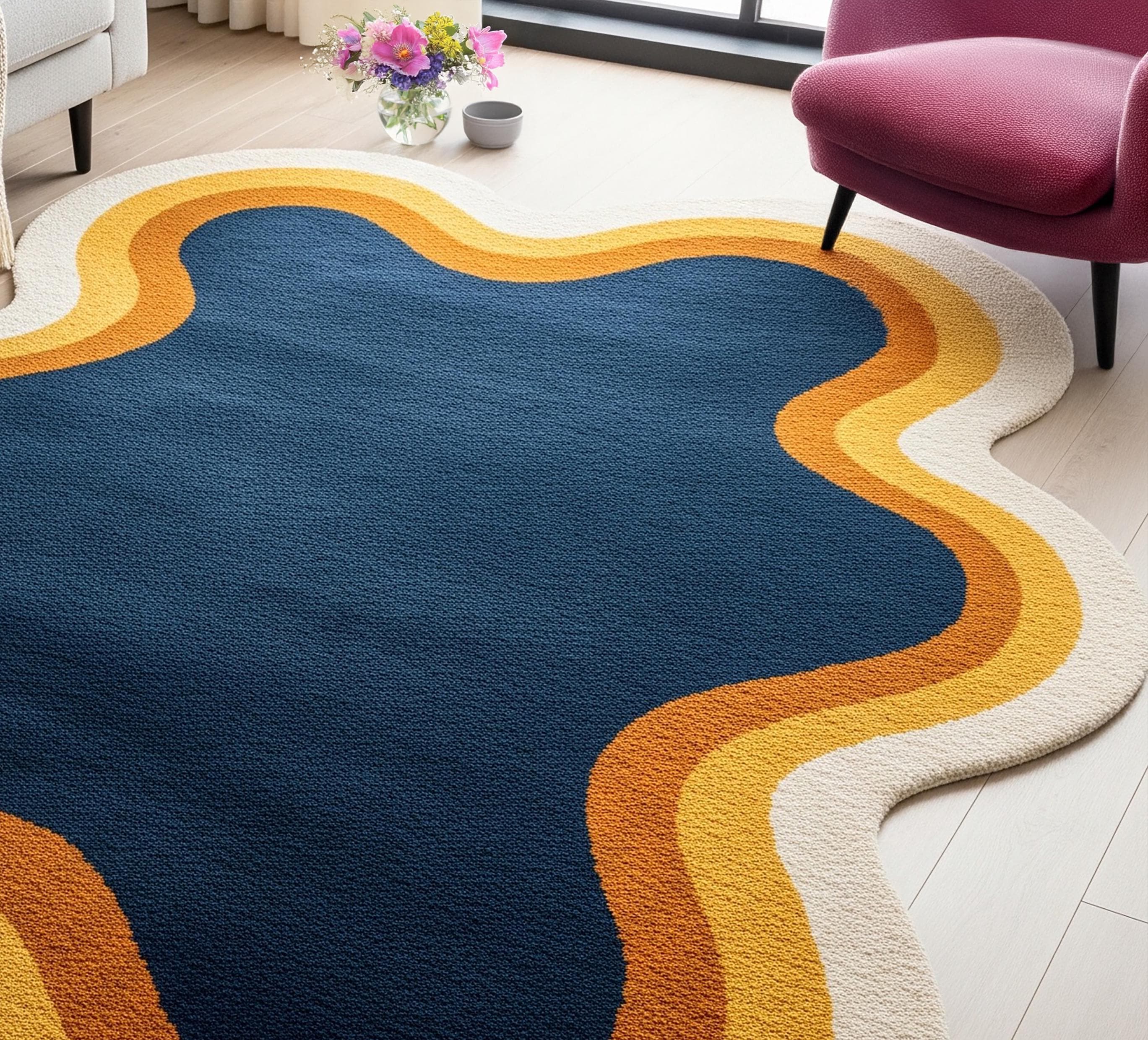 This hand tufted wool area rug. Its freeform, irregular shaped and vibrant Navy Blue center, framed by striking Gold, Orange, and Cream retro stripes, immediately draw the eye and inject a feeling of joy and creative energy into your space. Made from 100% natural, renewable wool, the medium pile offers a soft, comforting texture underfoot, delivering both cozy warmth and a bold style statement. Perfect for your Living Room or Bedroom, this indoor rug instantly transforms a bland space into a chic, Mid-Century Modern or Eclectic haven, making your home feel uniquely inspired.