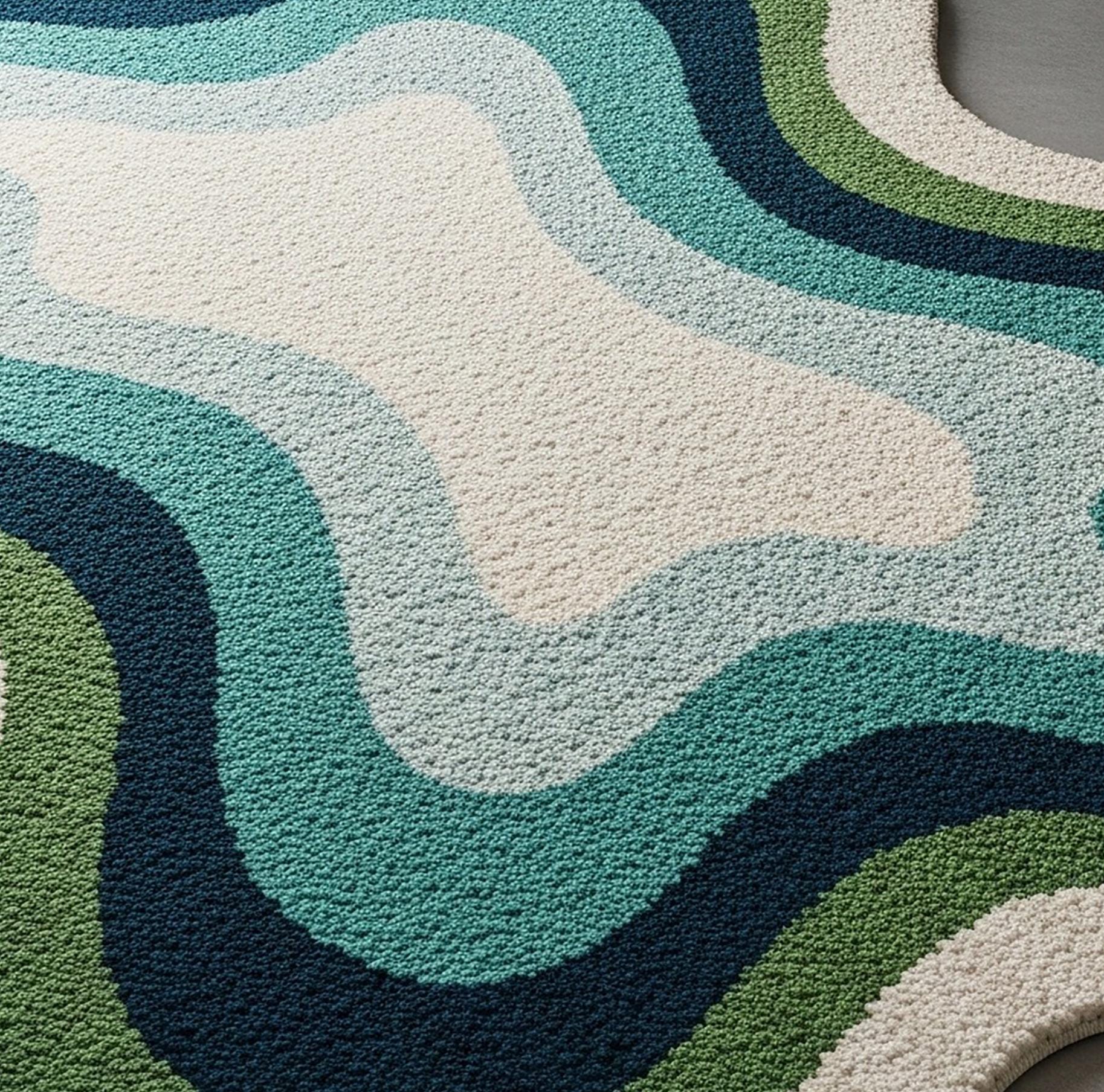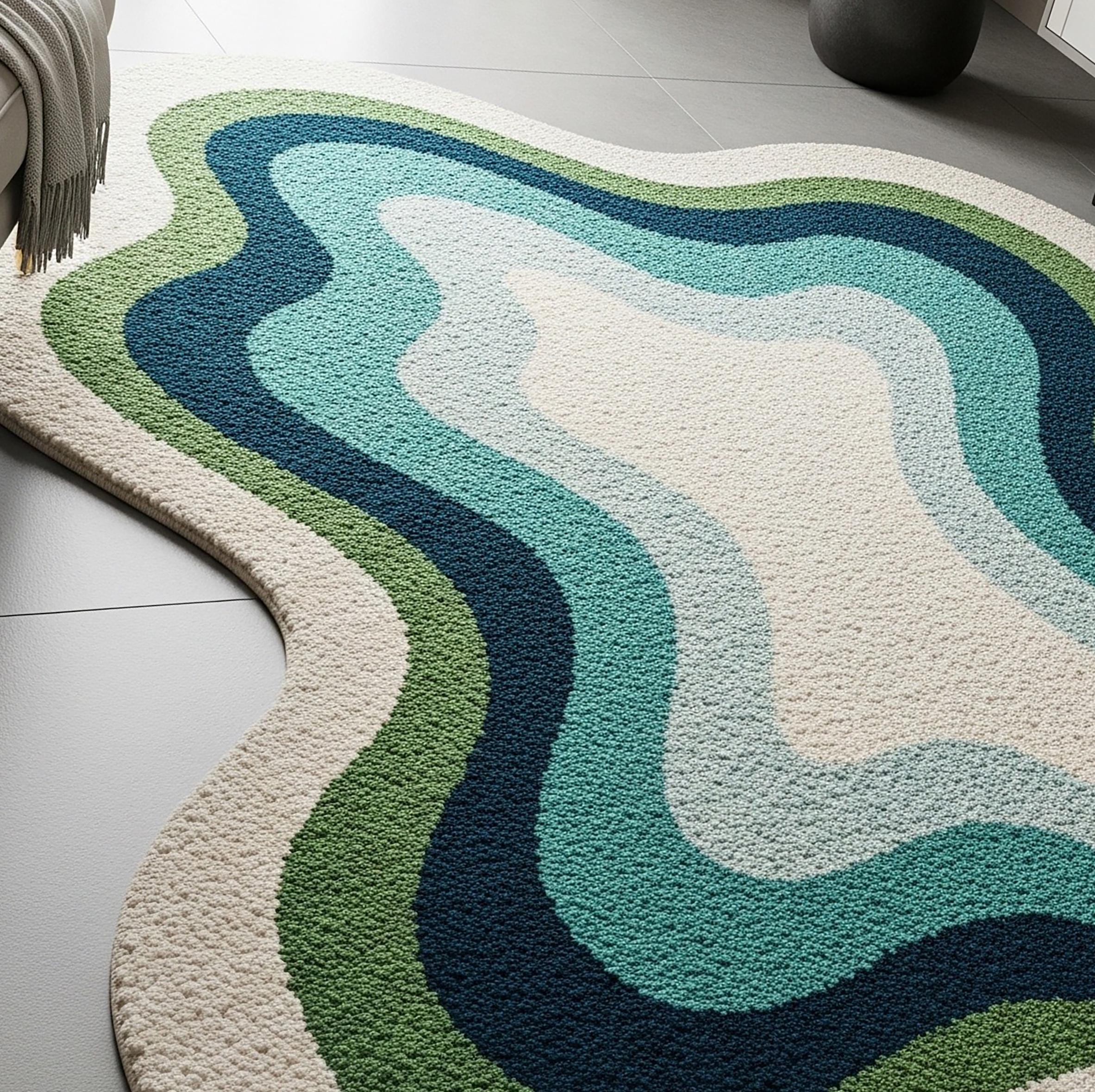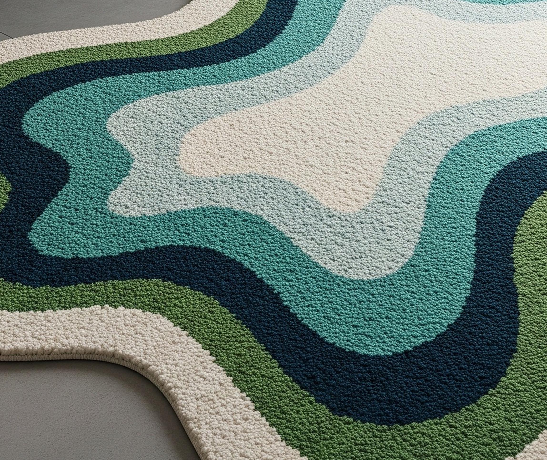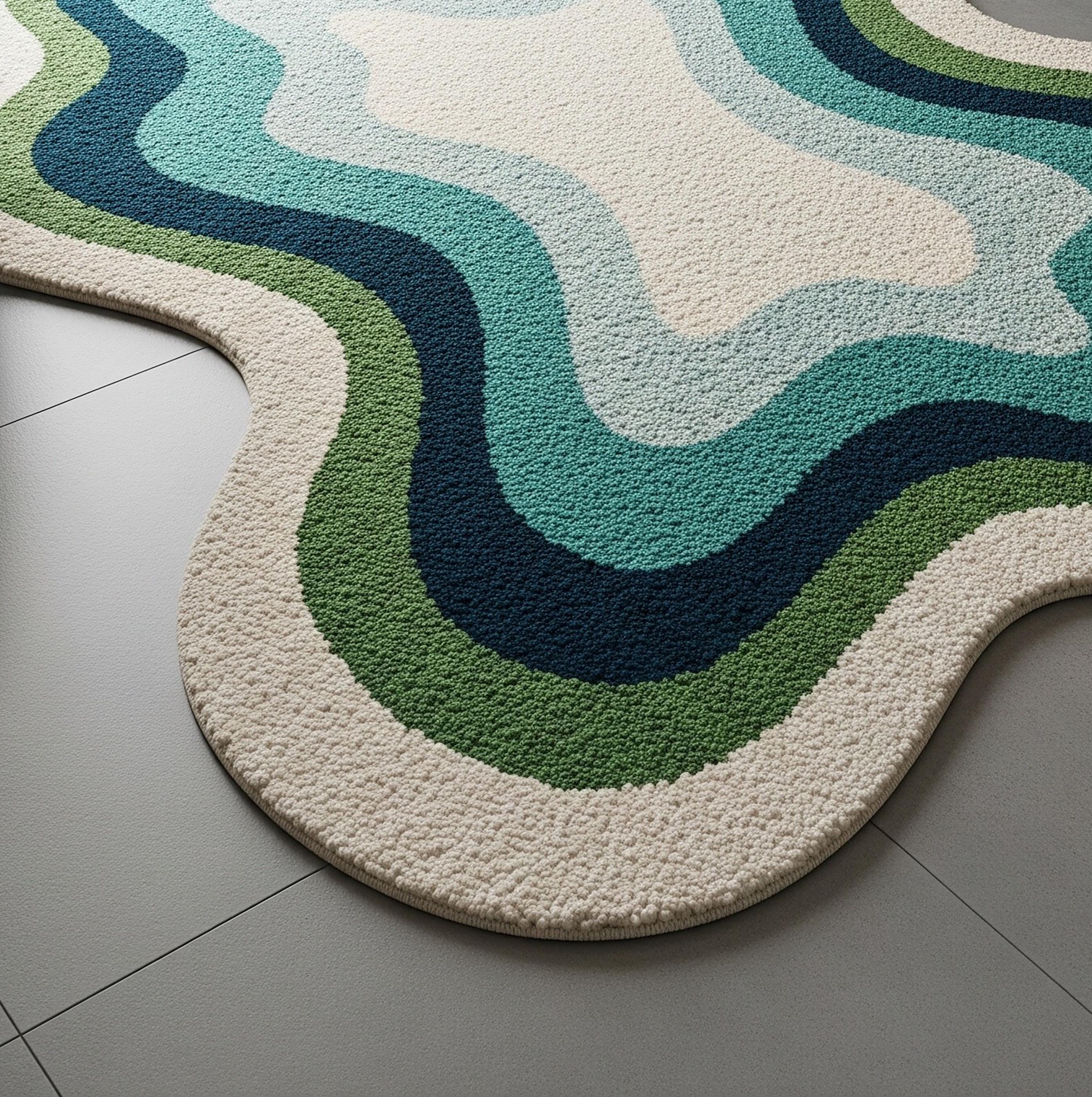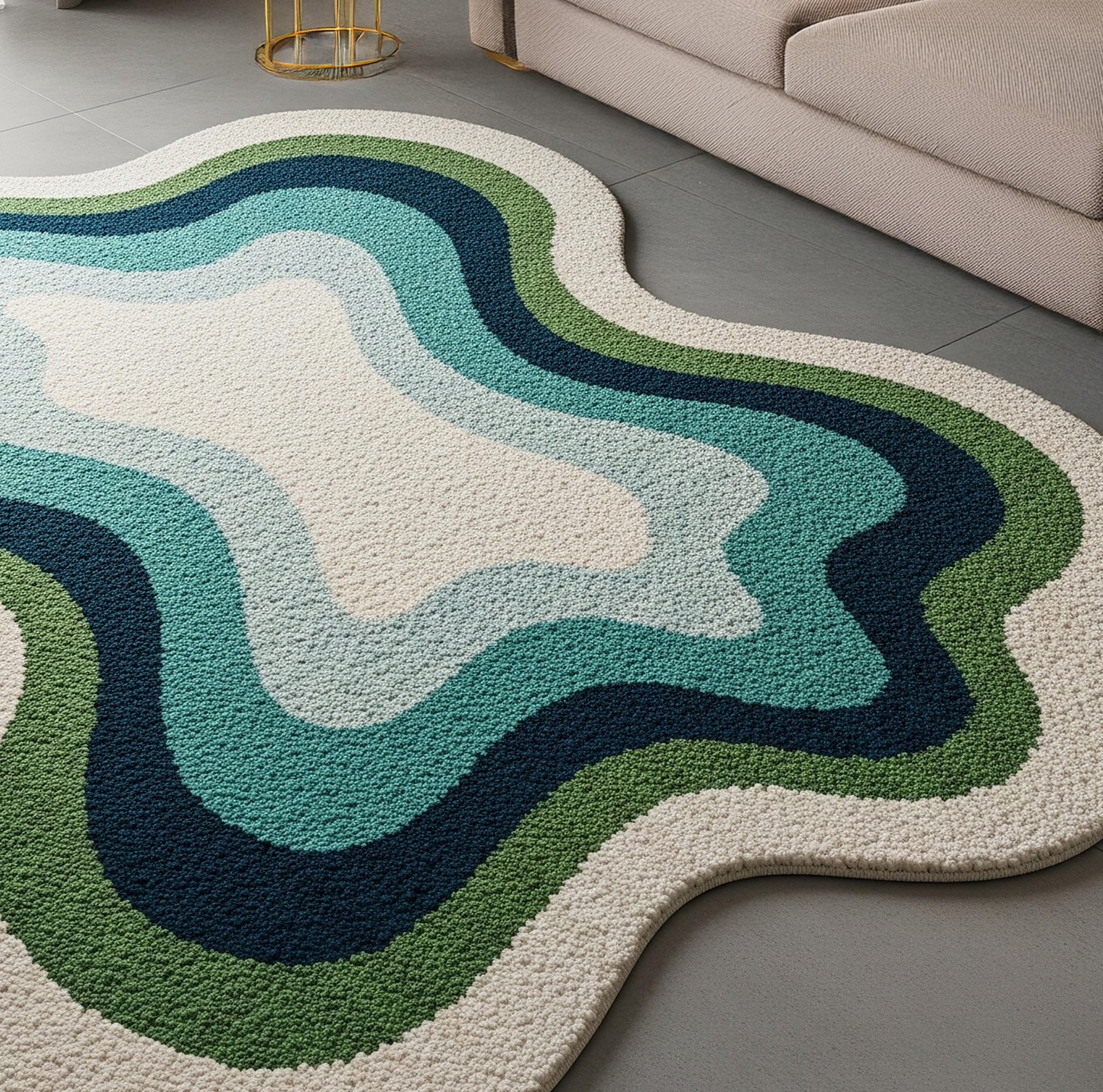 This hand-tufted wool rug features an organic, freeform shape with an abstract, wavy pattern in soothing greens and blues. Its plush, medium-pile texture crafted from natural, renewable fibers instantly adds a soft, Mid-Century Modern character and comfort to your room. It's a statement piece that promises both a visual focal point and a luxurious feel underfoot.