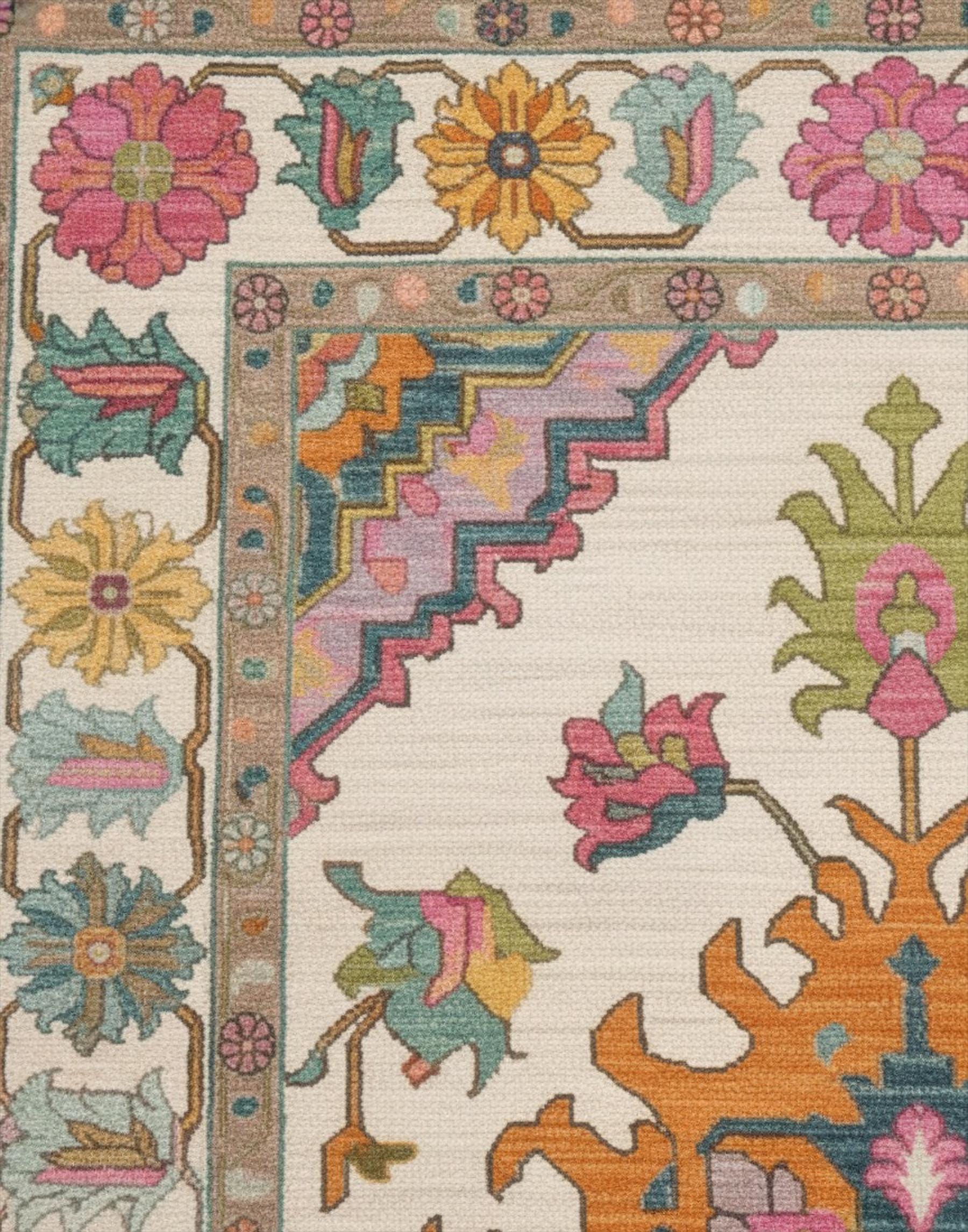 • Pattern: The traditional Turkish Oushak pattern employs Stylized Palmettes and Vine Scrolls with generous use of open space for an airy feel.