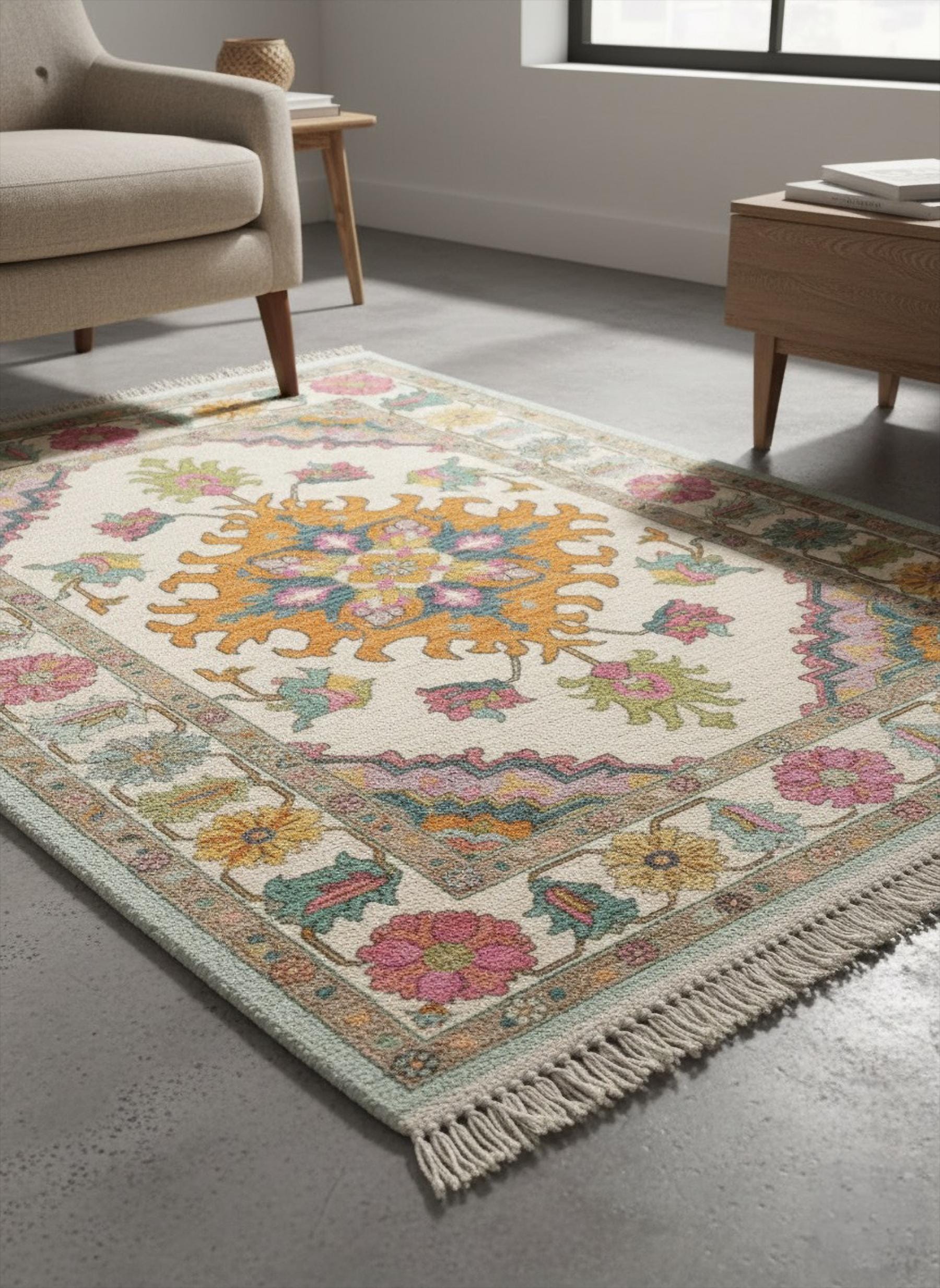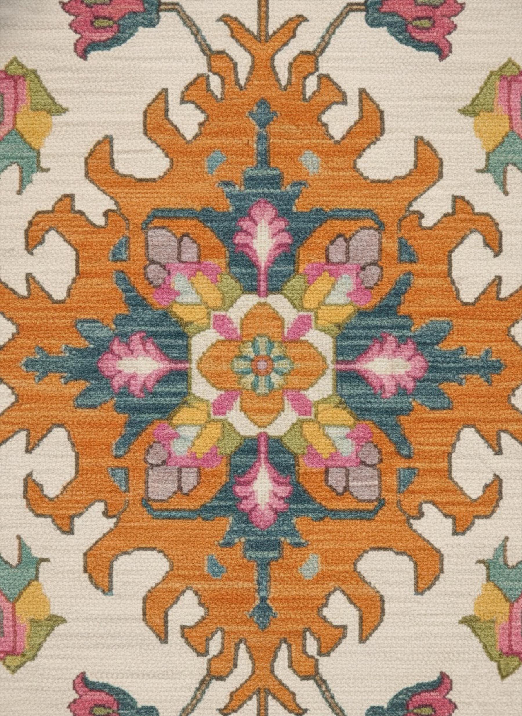 • Design: Characterized by a Large-Scale Open Pattern with simplified, oversized Floral Motifs, a distinct Central Medallion.