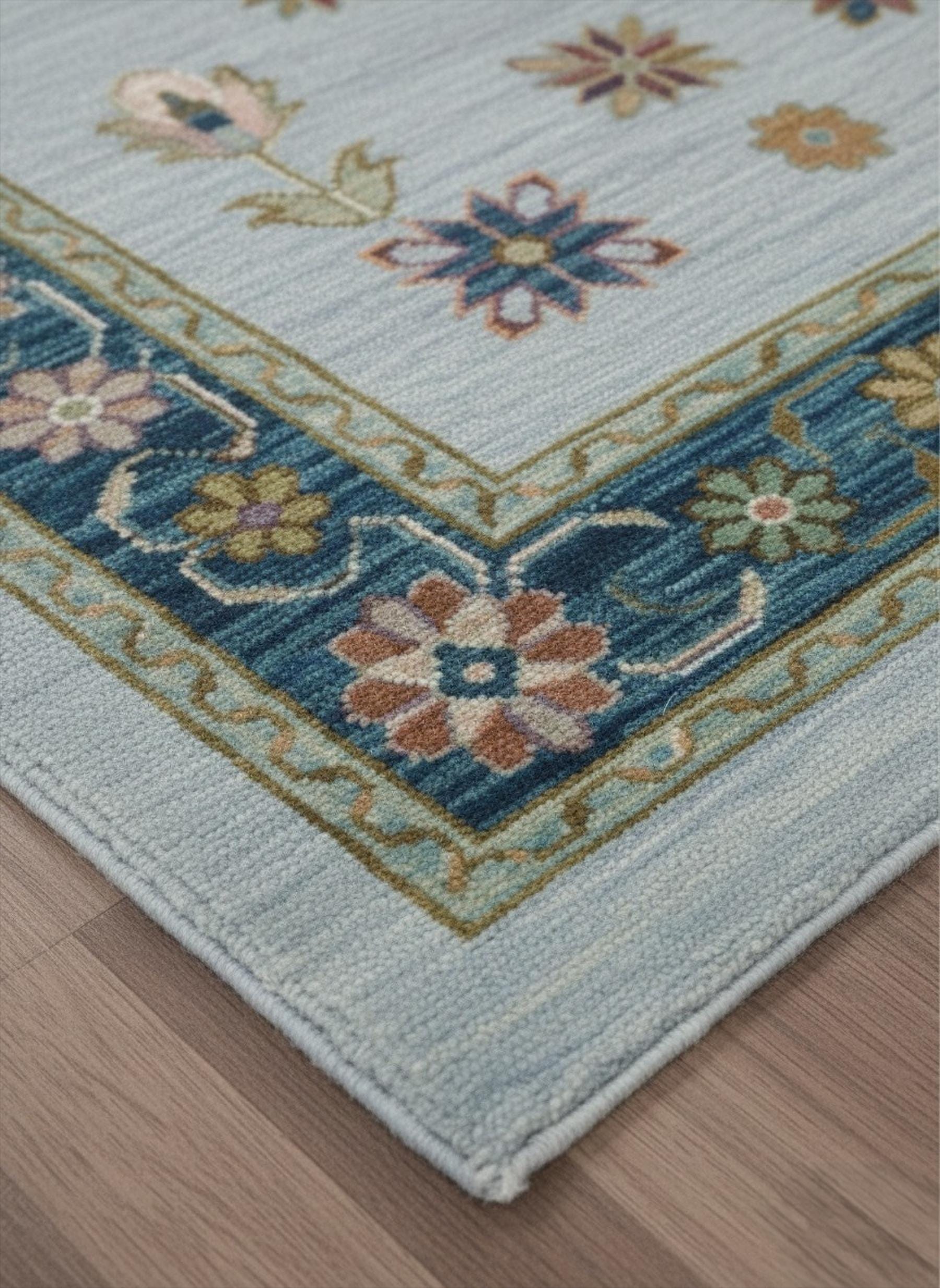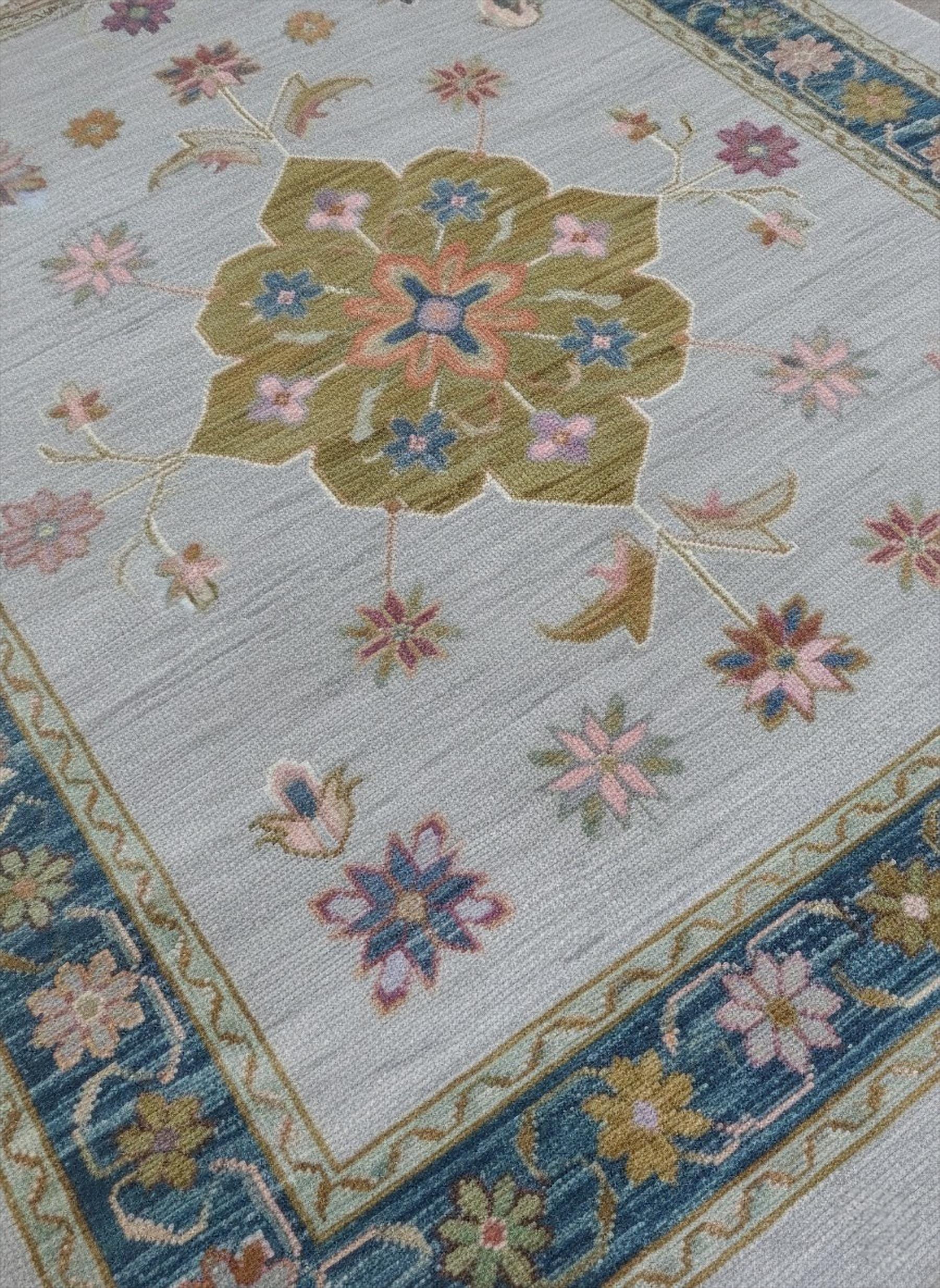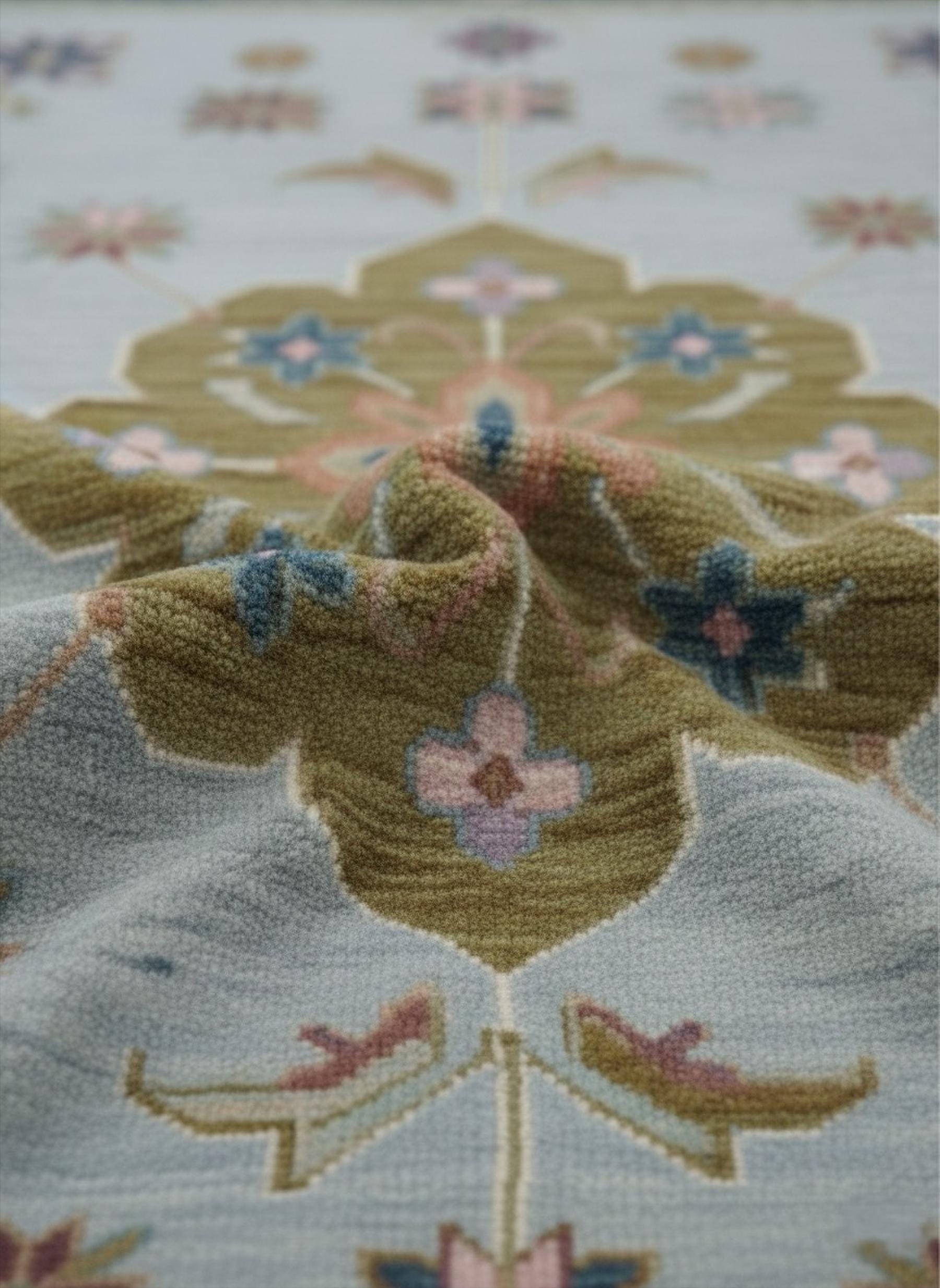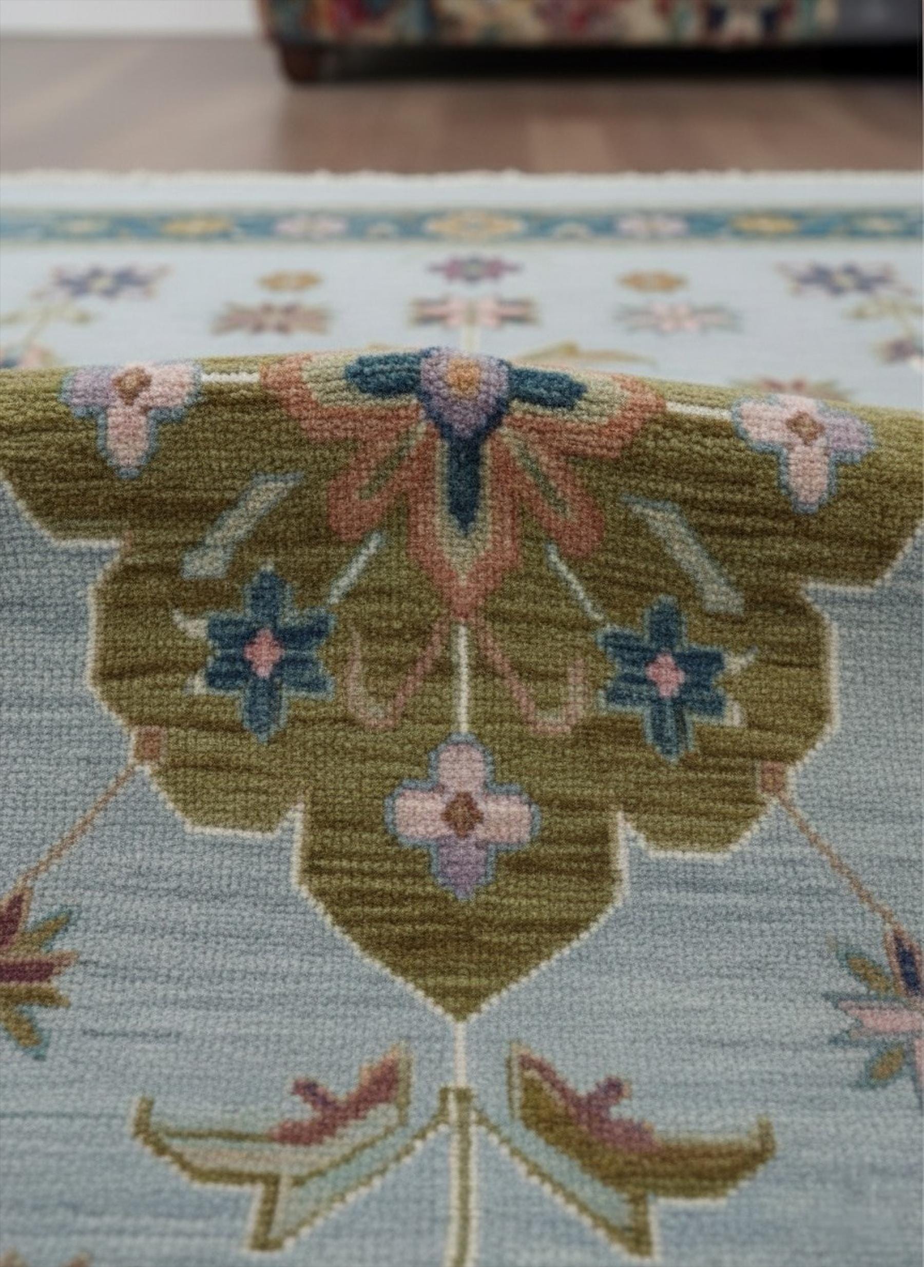 • Natural Dye Variability: The use of natural dyes means colors can vary slightly from one batch to another. Maintaining consistent shades of teal, off-white, and sage green across a large rug is a significant challenge.