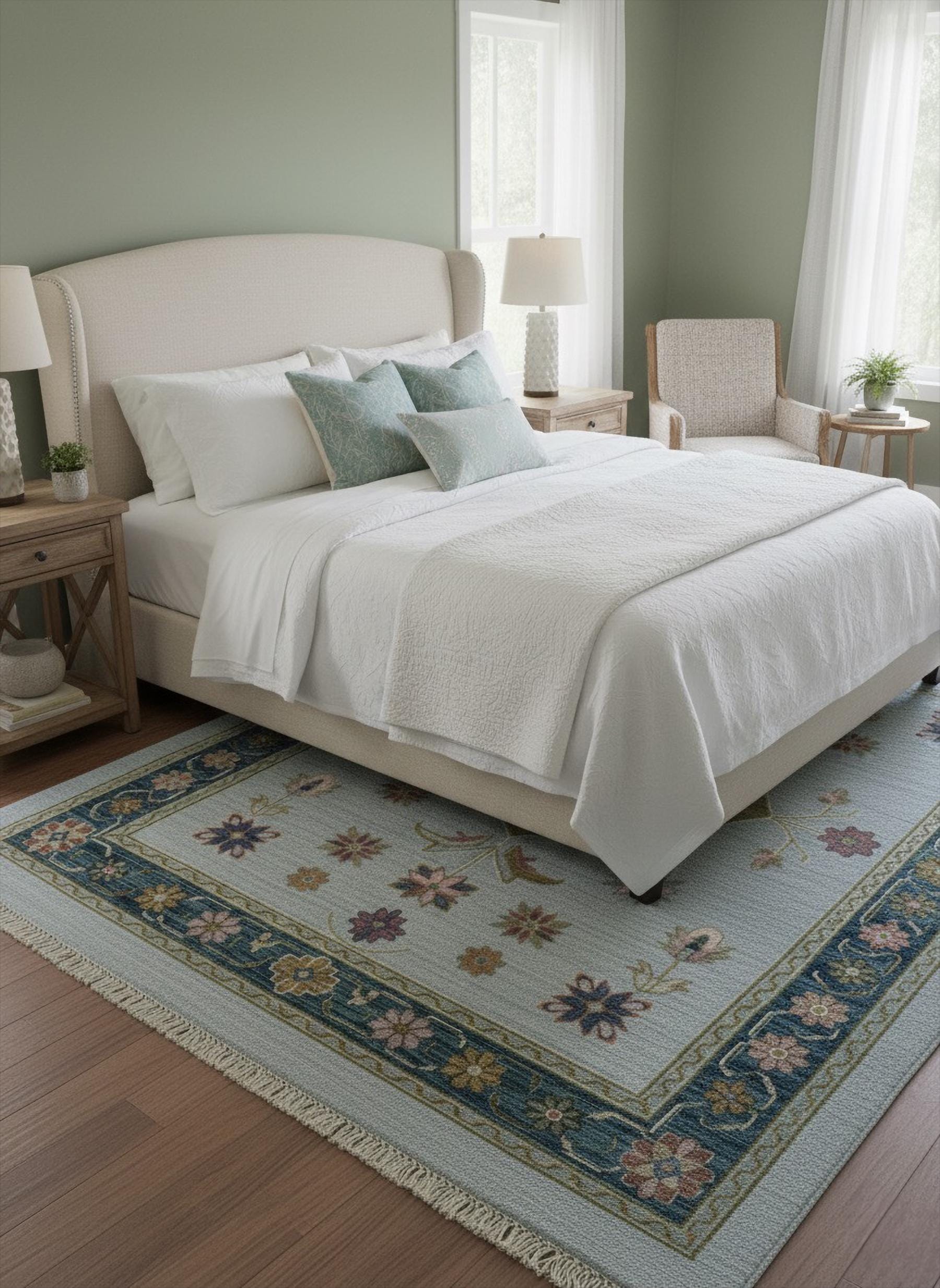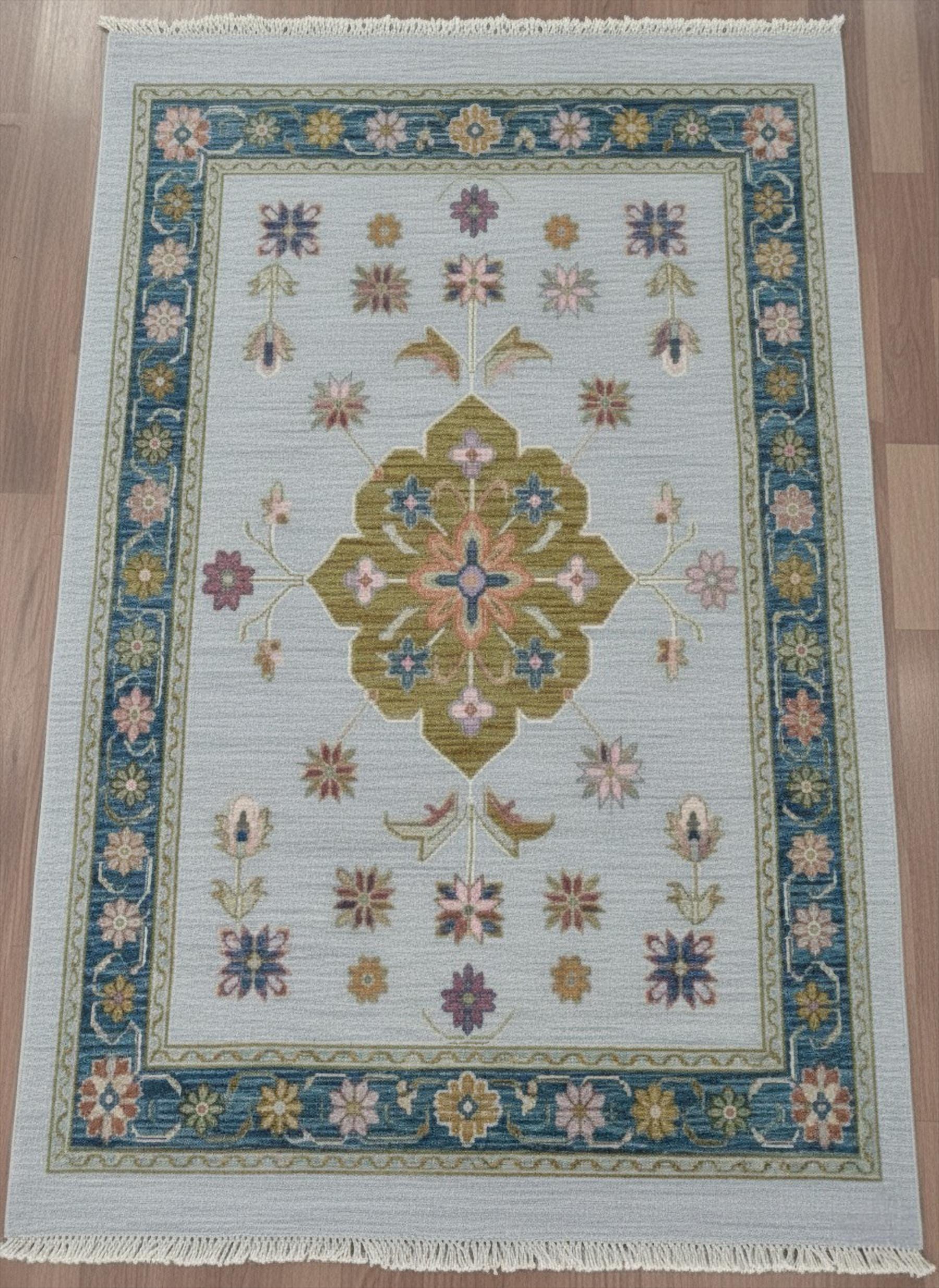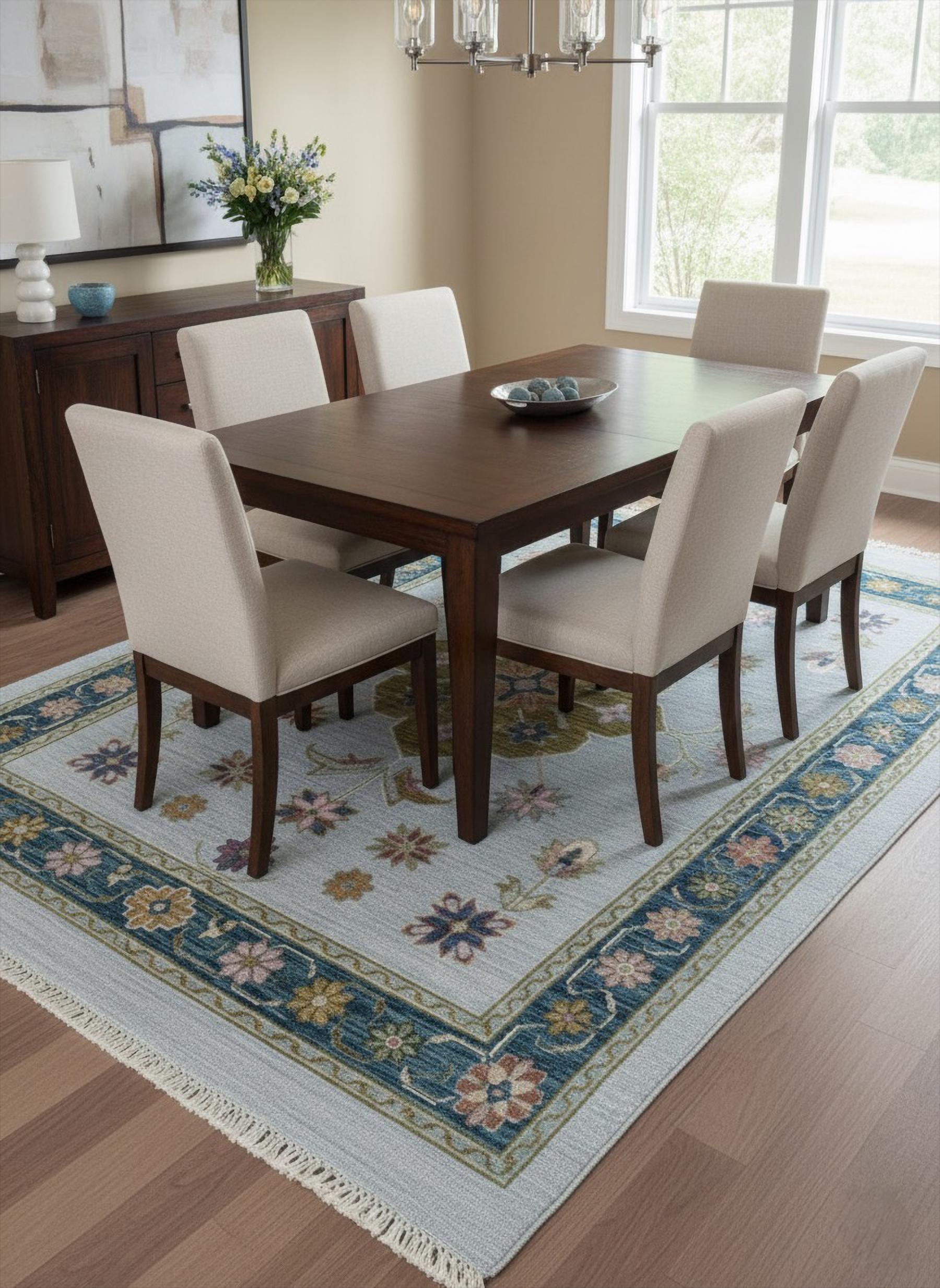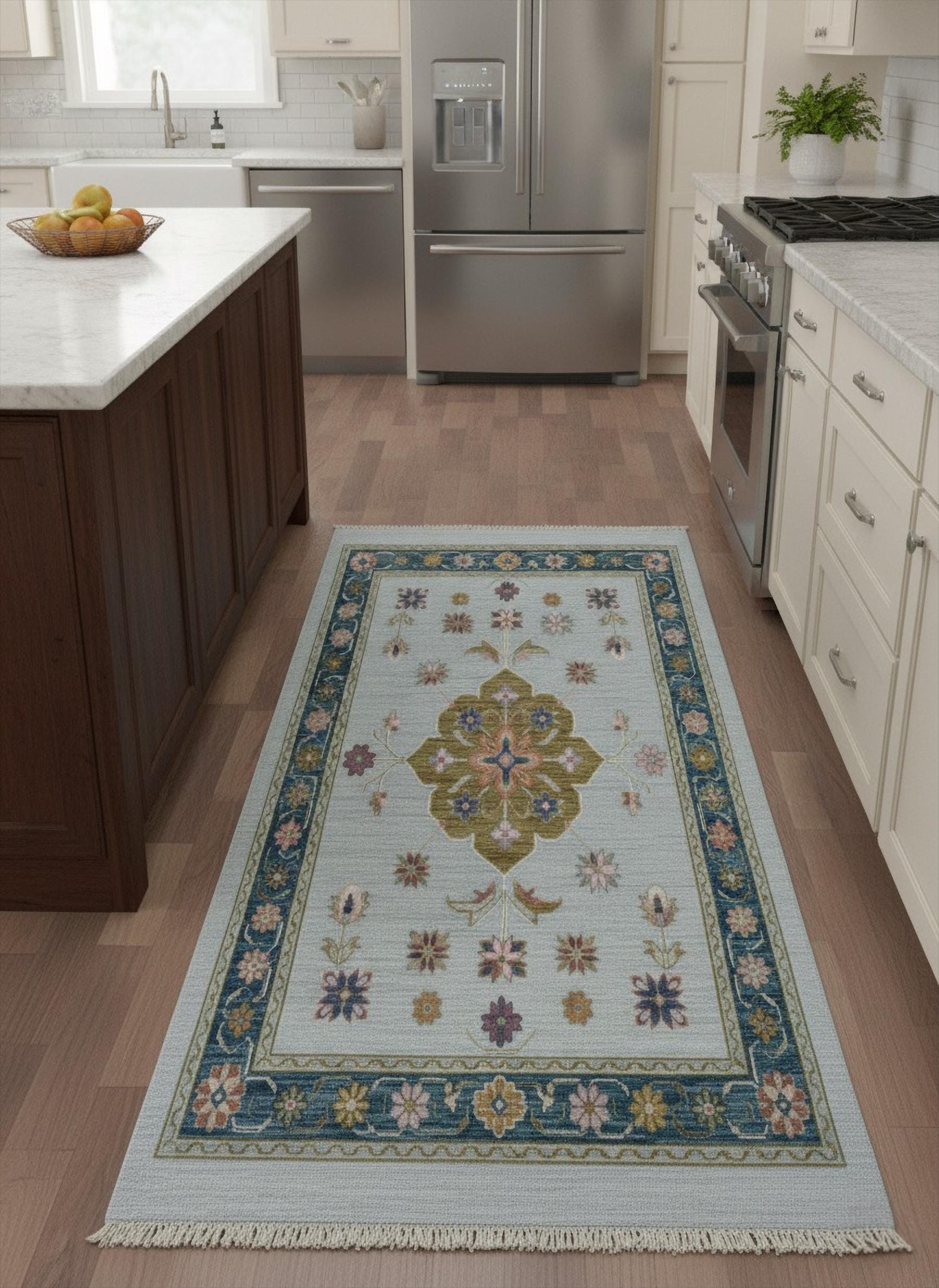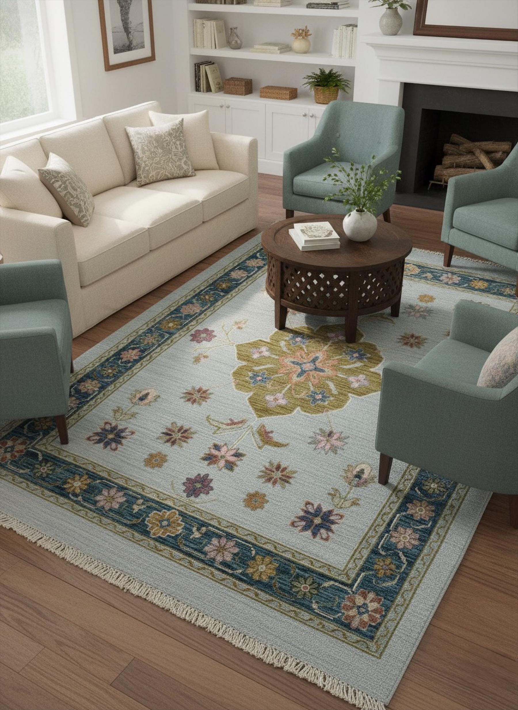 • Natural Dye Variability: The use of natural dyes means colors can vary slightly from one batch to another. Maintaining consistent shades of teal, off-white, and sage green across a large rug is a significant challenge.