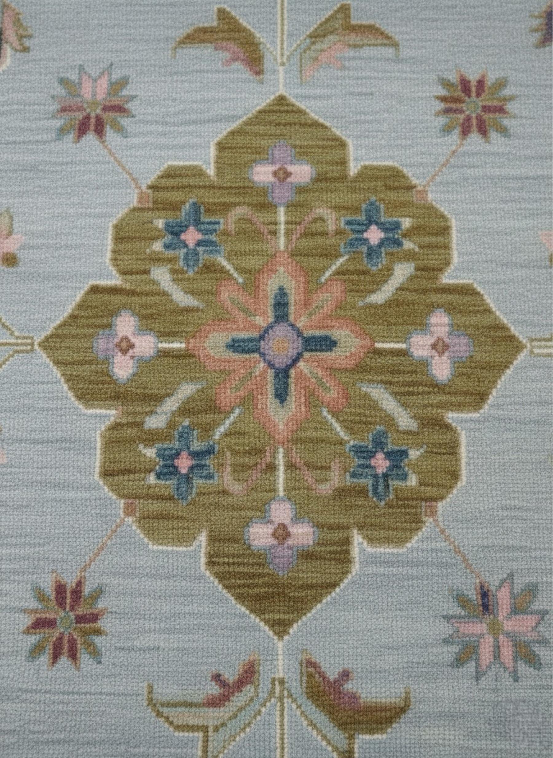 Hand Knotted Wool Oushak Rug, Pale Blue Floral Medallion, Traditional Carpet