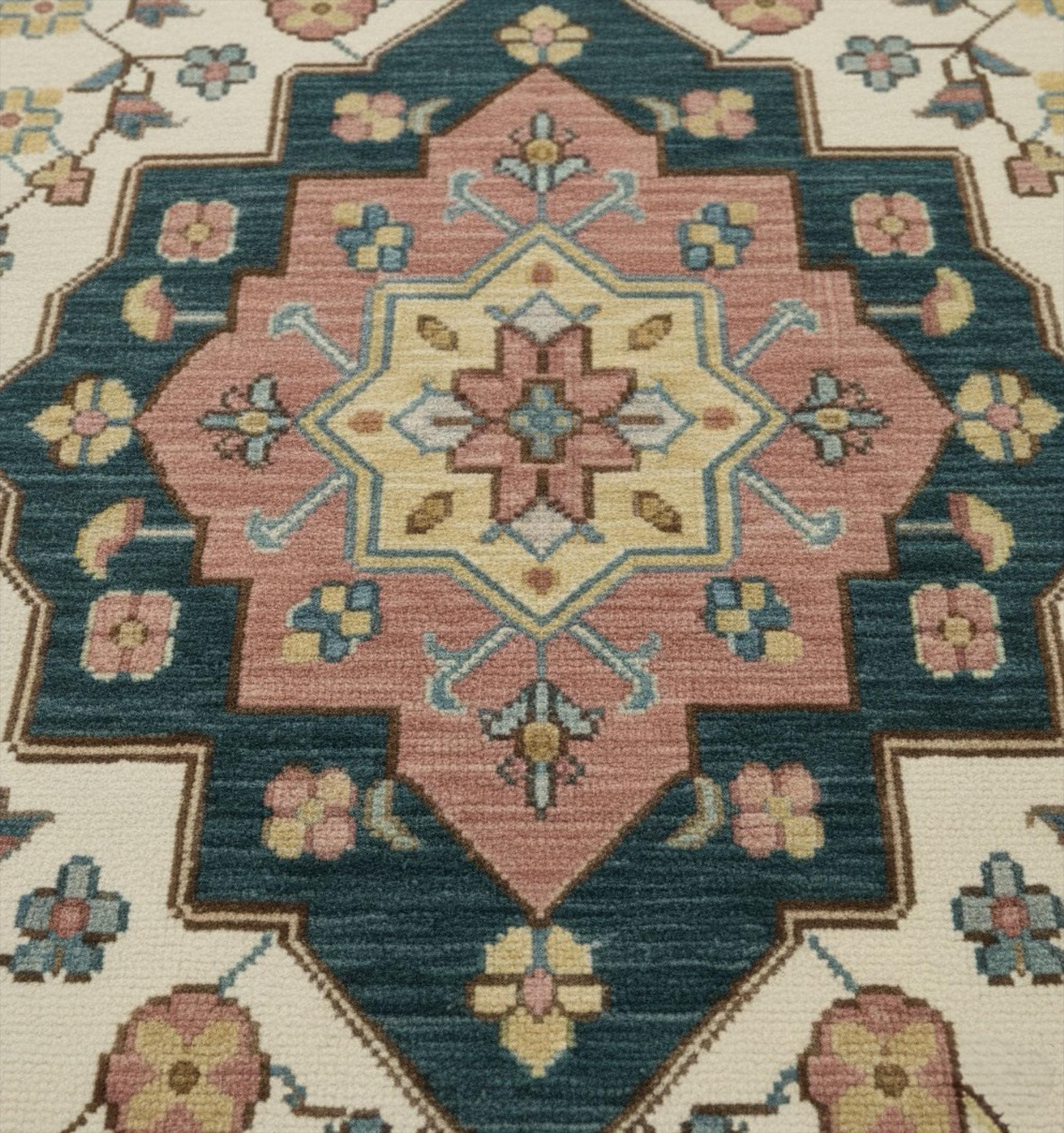 • Style: The rug appears to be an Oushak or contemporary style, known for its softer palette and stylized, large-scale floral and geometric elements.