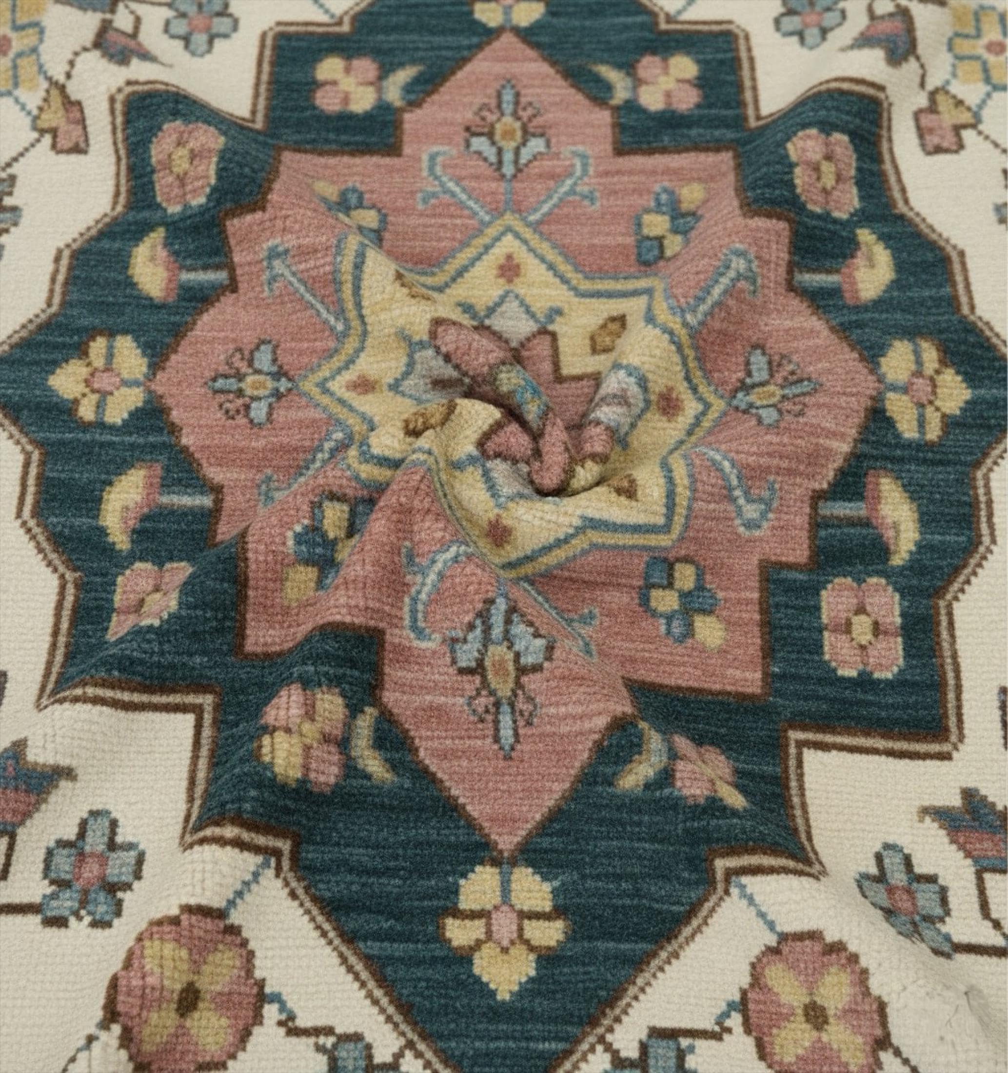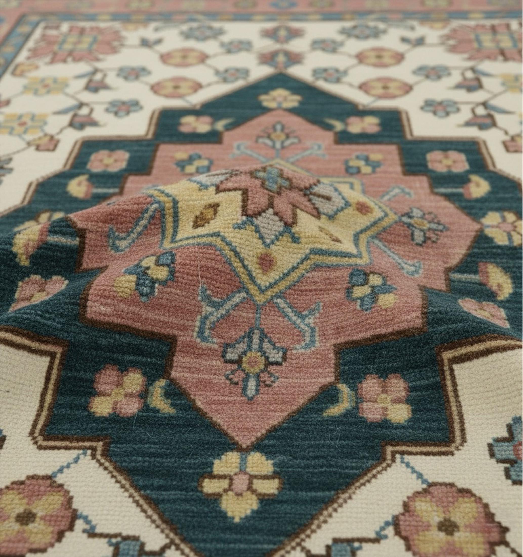 • Natural Dye Variability: The use of natural dyes means colors can vary slightly from one batch to another. Maintaining consistent shades of teal, off-white, and sage green across a large rug is a significant challenge.
