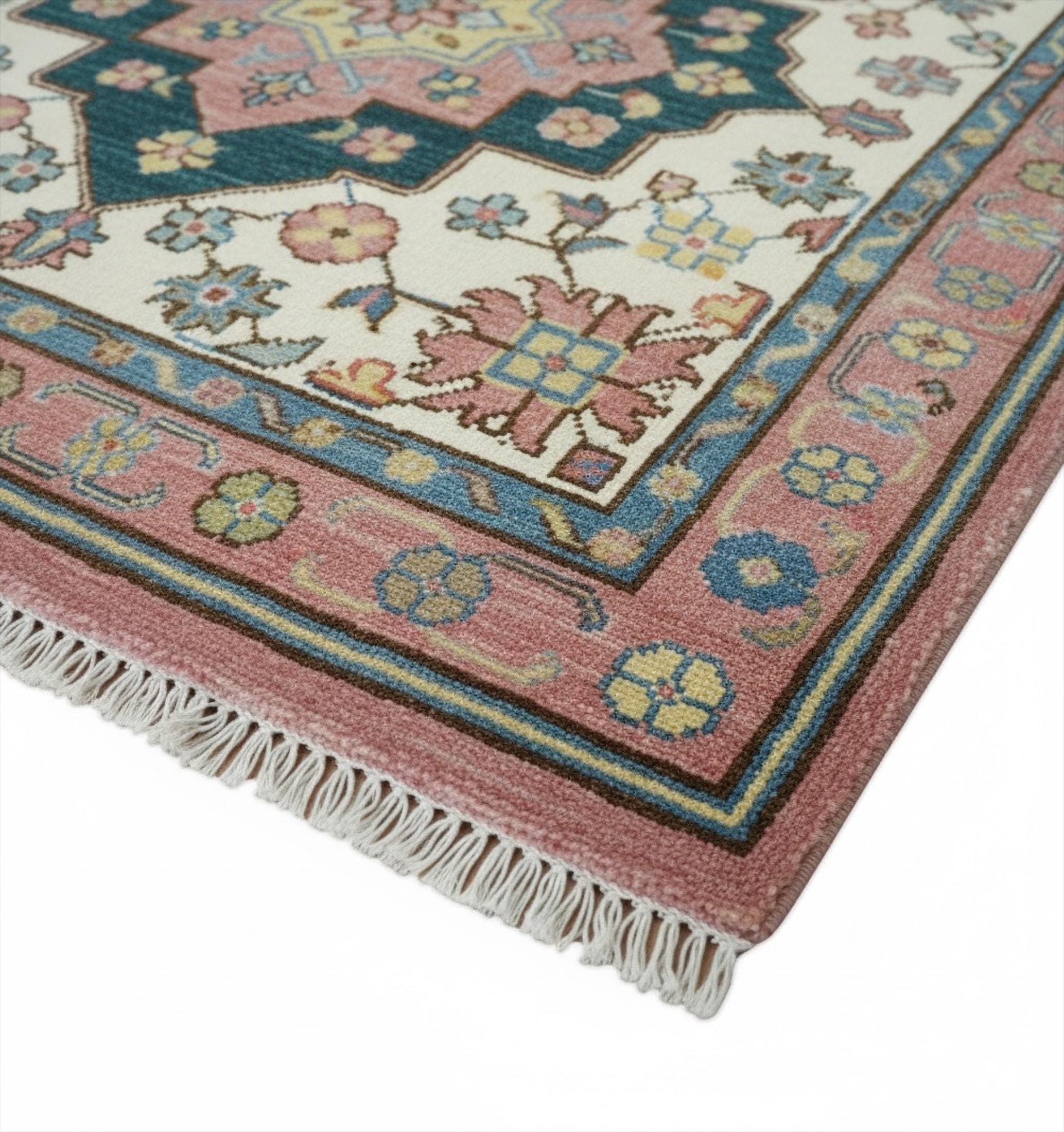 Hand Knotted Oushak Wool Rug, Ivory, Navy, and Pink Medallion, Oriental Rug