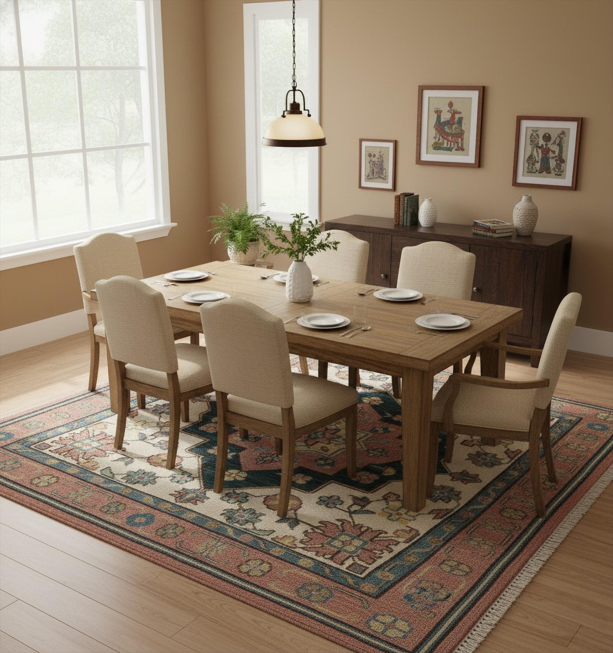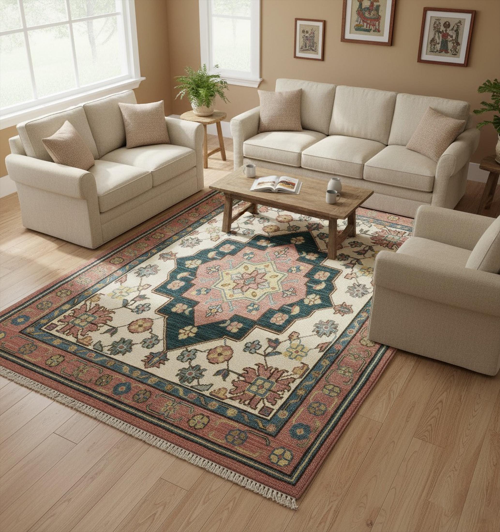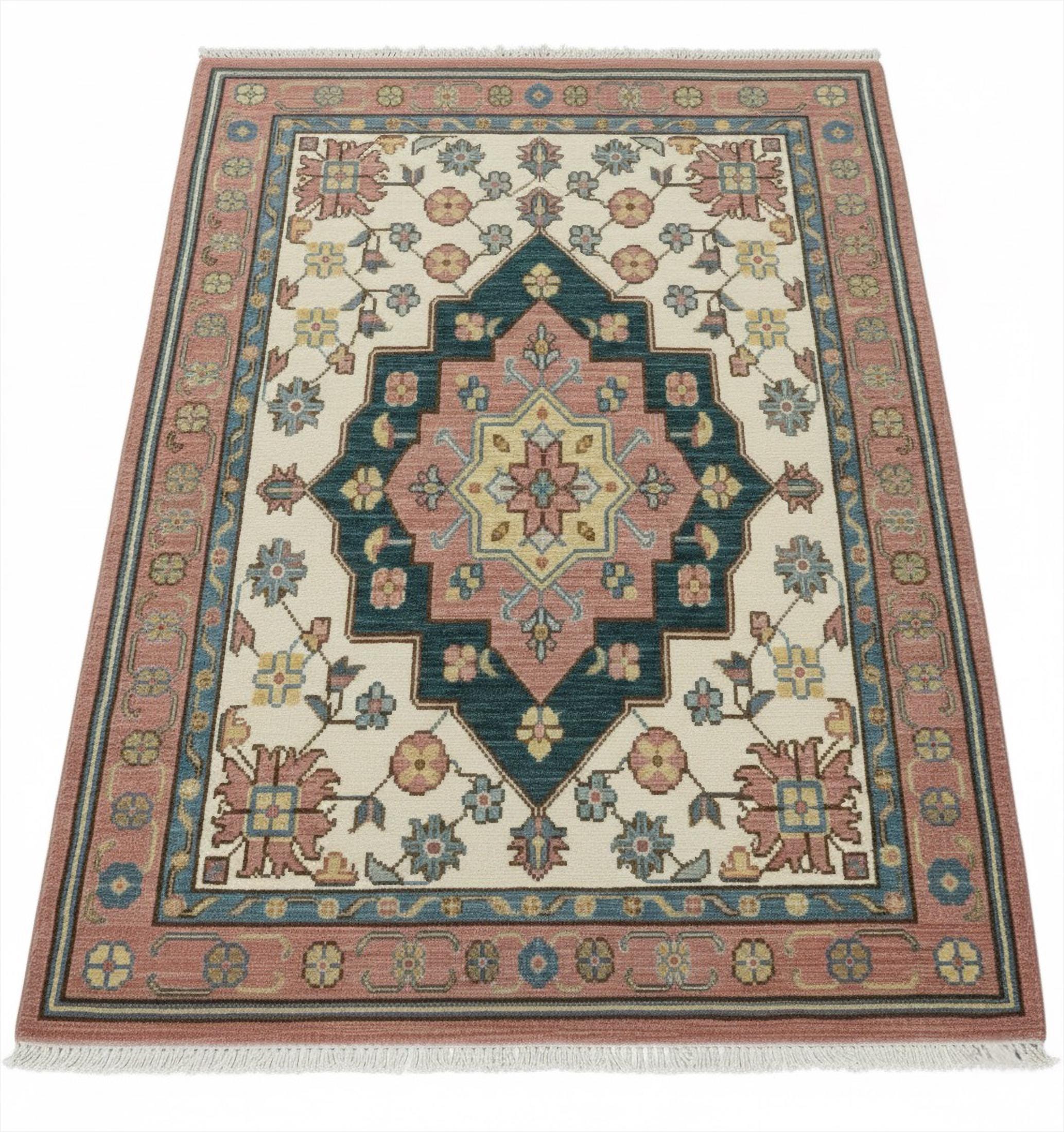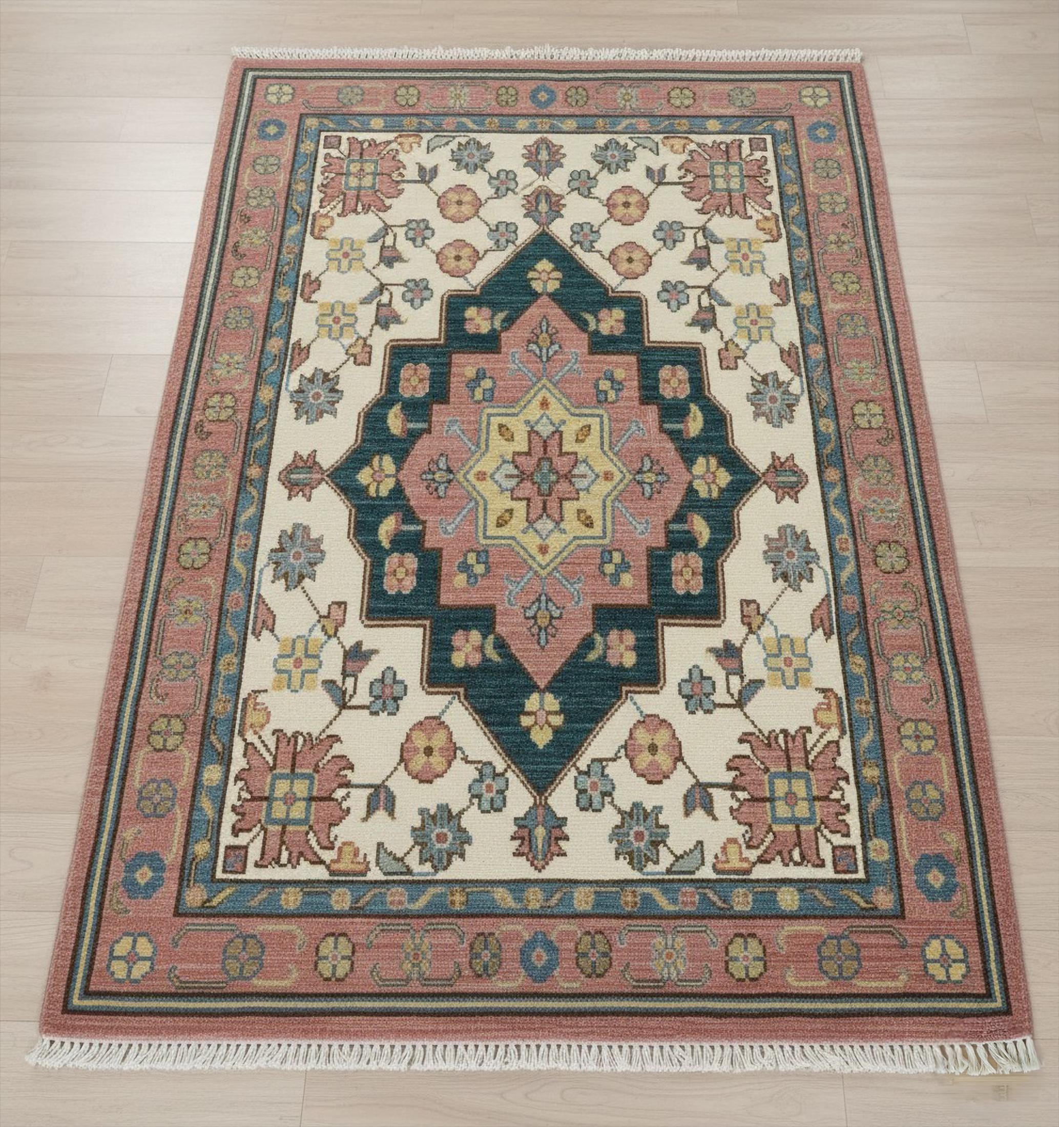 • Main Border & Accent: A deep, dusty pink frames the rug and features prominently in the central medallion.