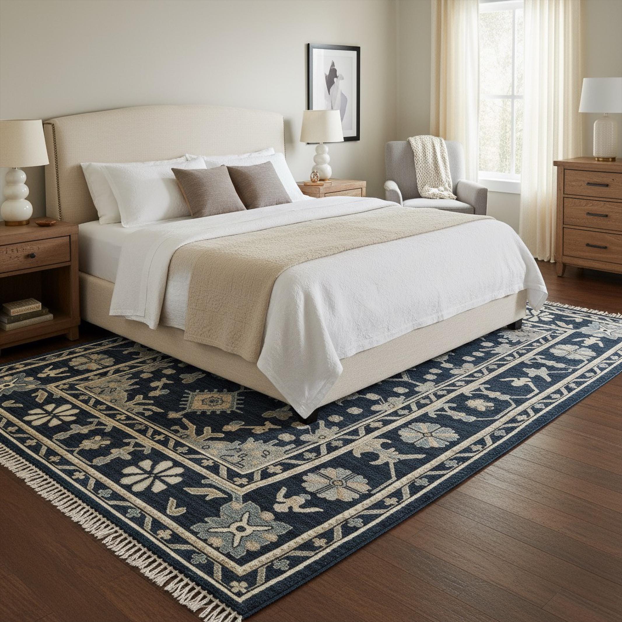 Navy Blue Ivory Oushak Wool Rug, Hand Knotted Floral Medallion Area Rugs for Bedroom