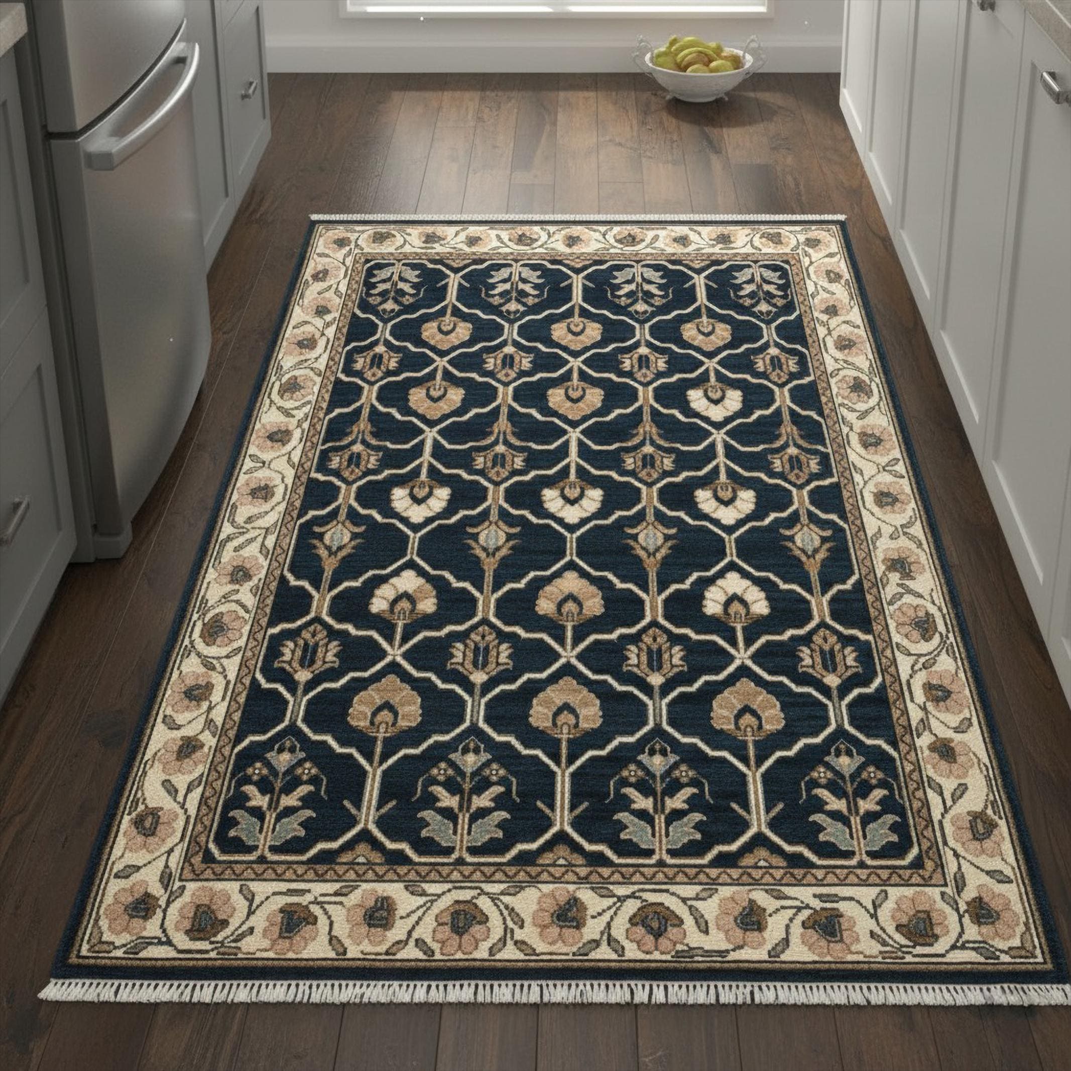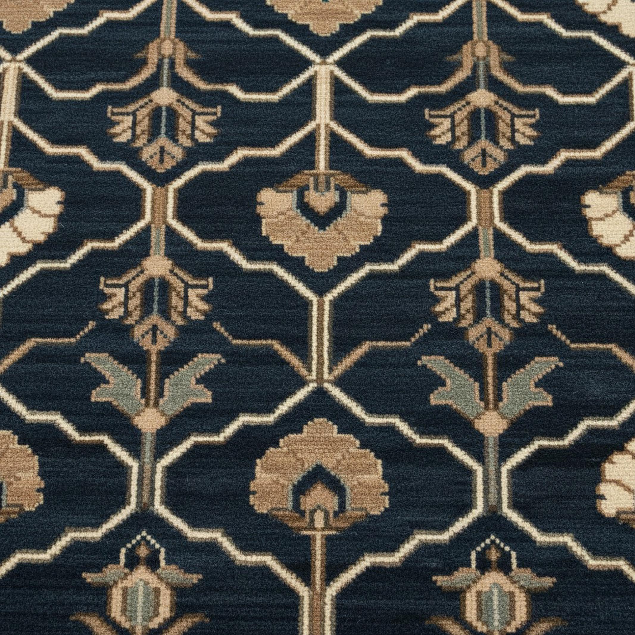 • Pattern: Traditional Oushak floral motifs arranged in a repeated lattice layout with a detailed floral border