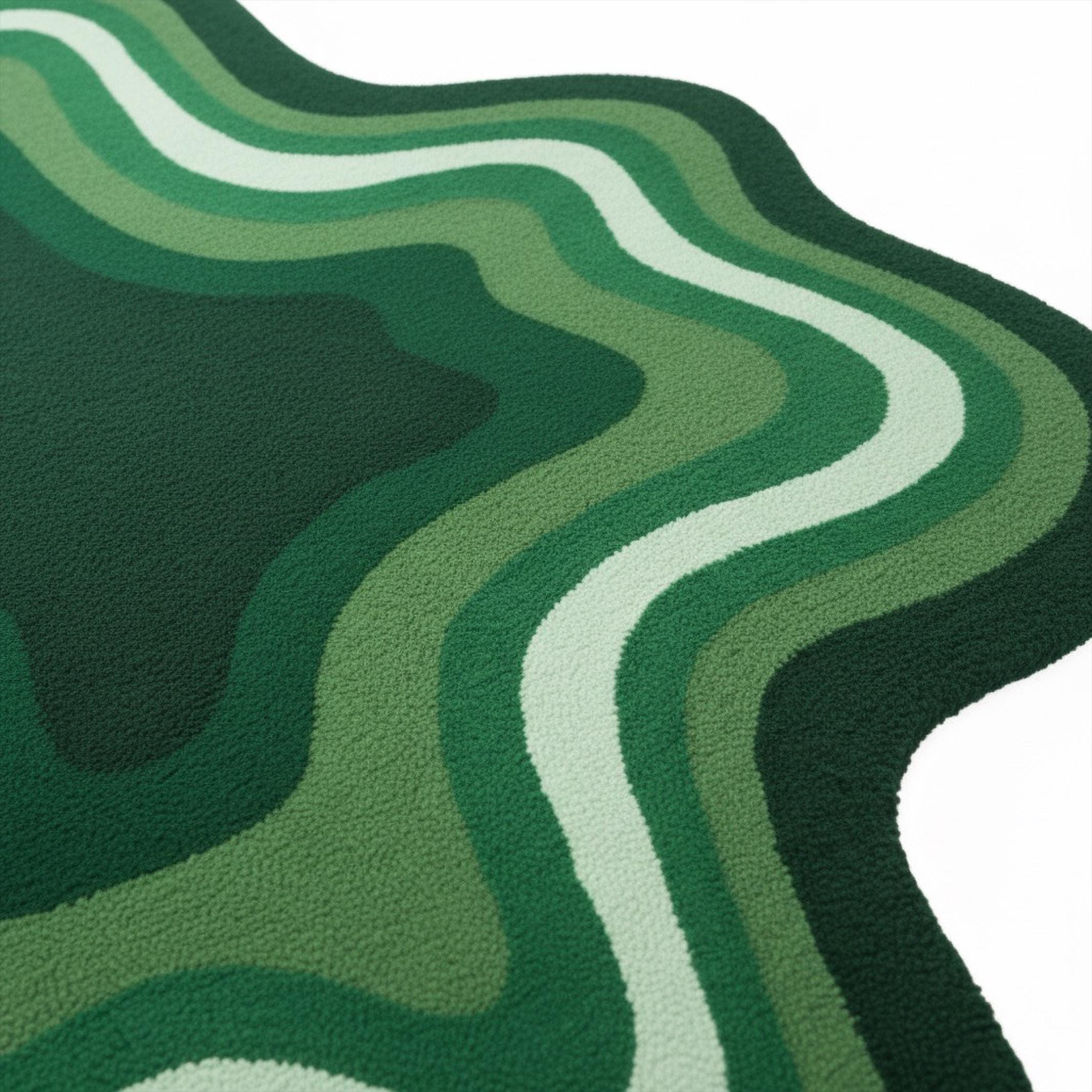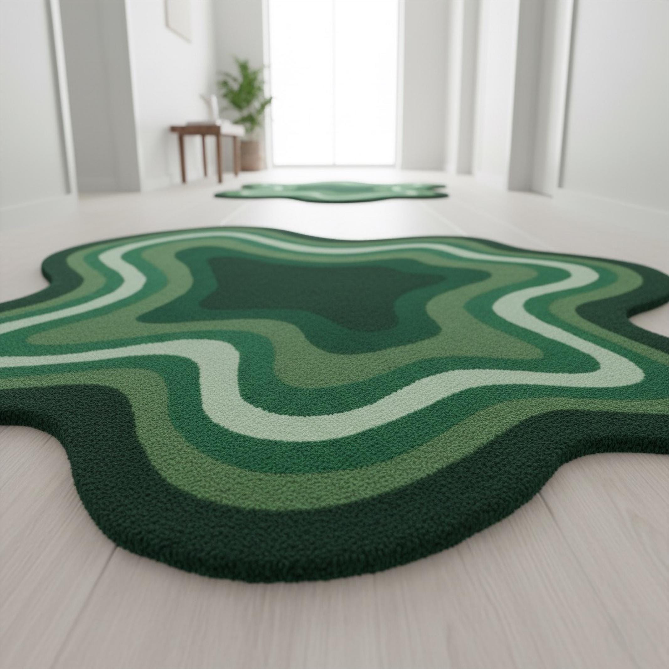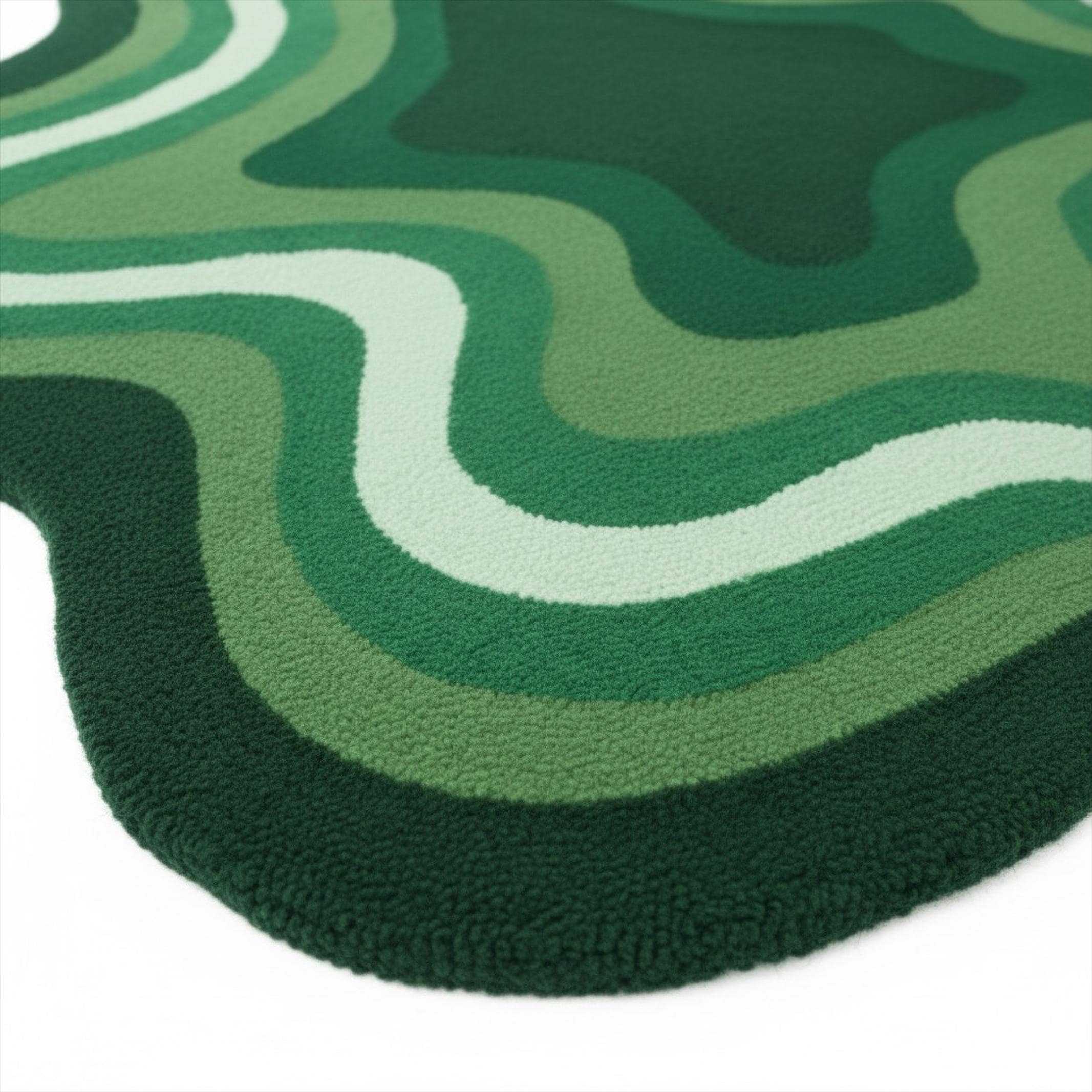 Bring bold, artistic energy into your space with this hand tufted wool rug, designed in a striking organic irregylar shape and layered with rich green tones. Its flowing, wavy pattern creates a contemporary, nature-inspired look that instantly transforms any modern home.