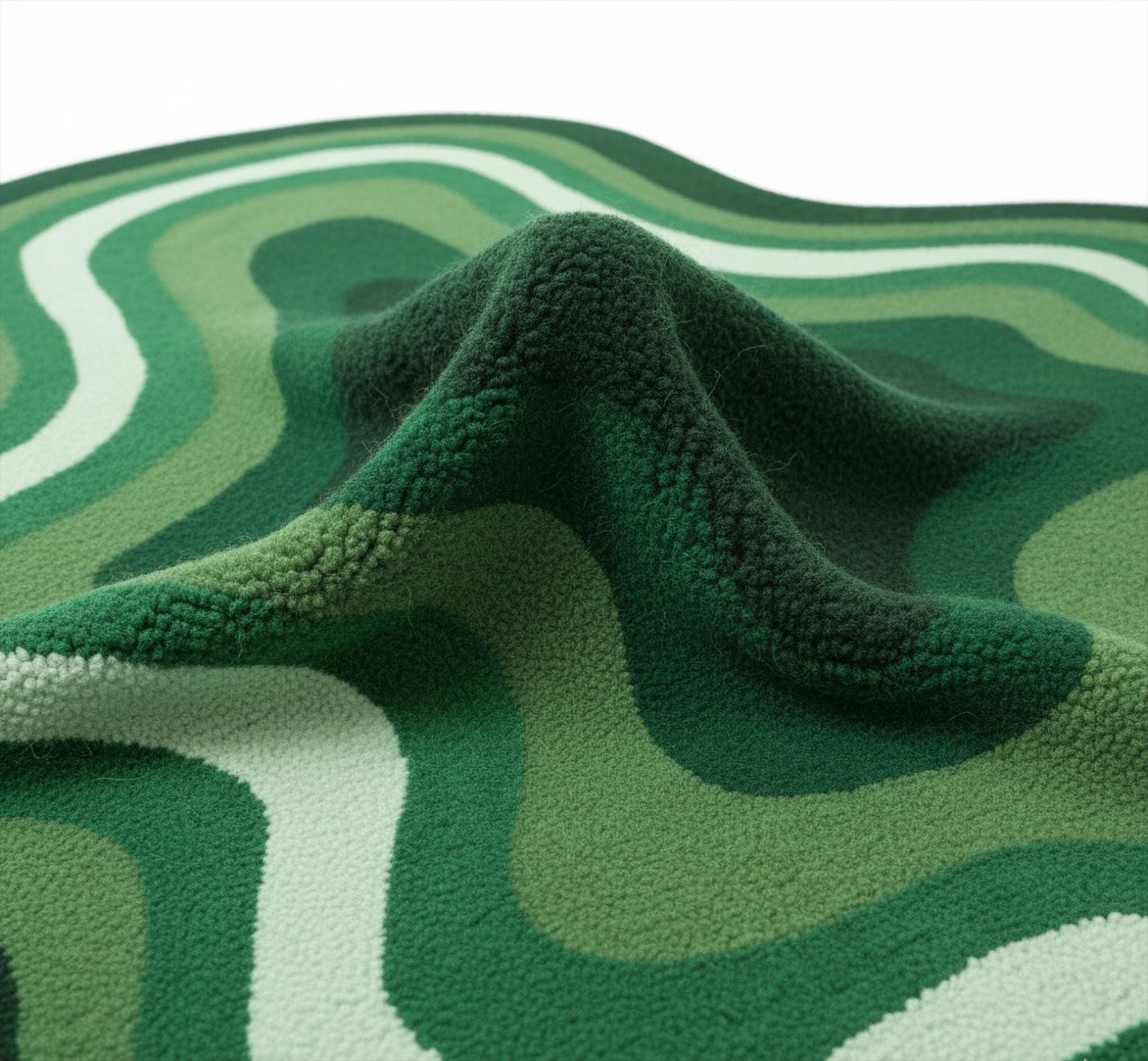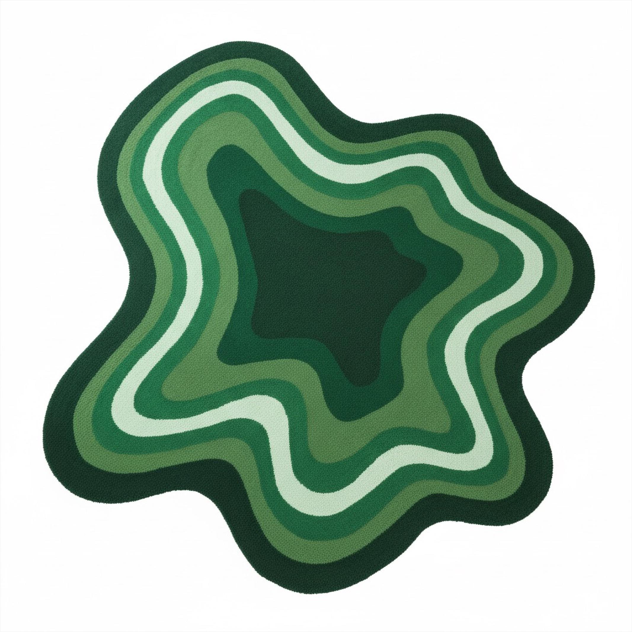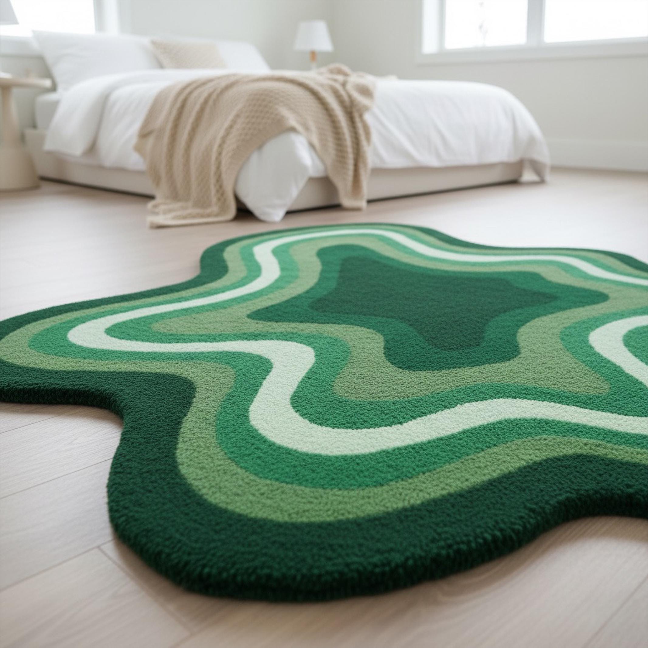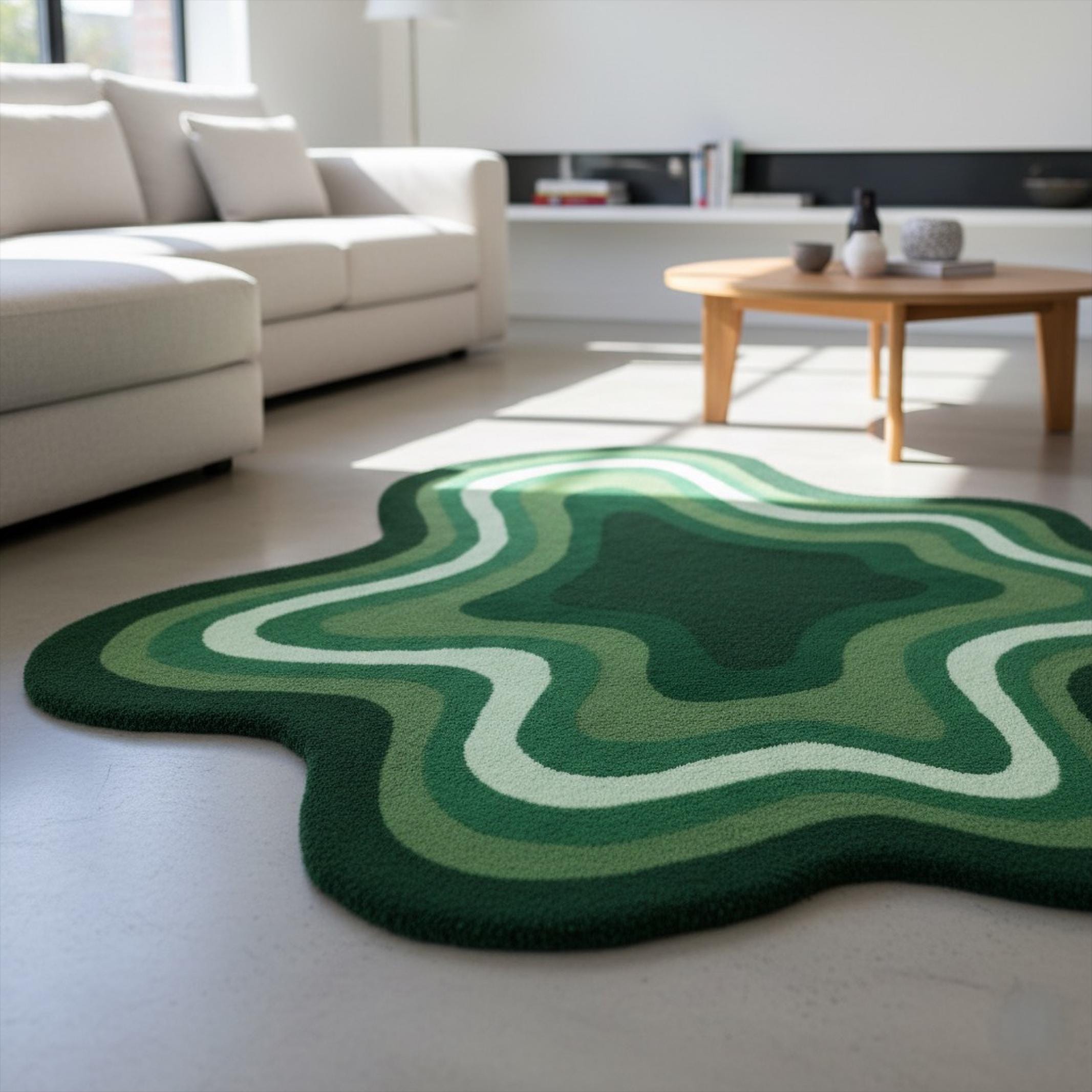 Bring bold, artistic energy into your space with this hand tufted wool rug, designed in a striking organic irregylar shape and layered with rich green tones. Its flowing, wavy pattern creates a contemporary, nature-inspired look that instantly transforms any modern home.