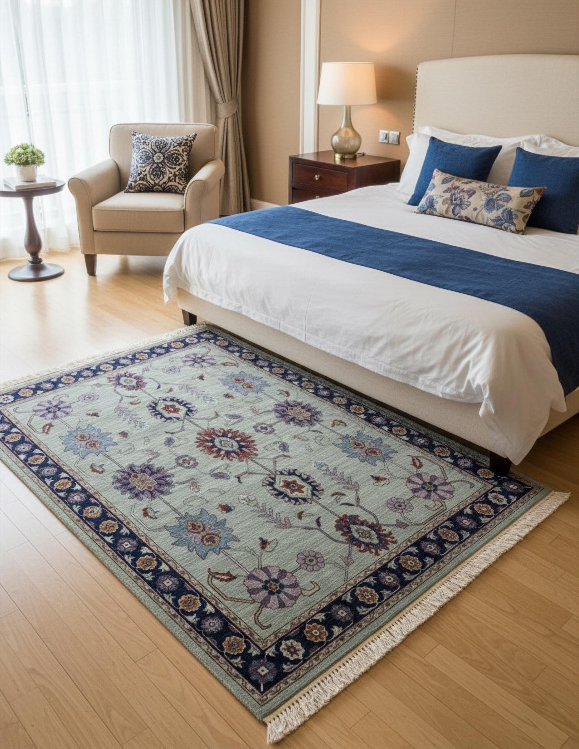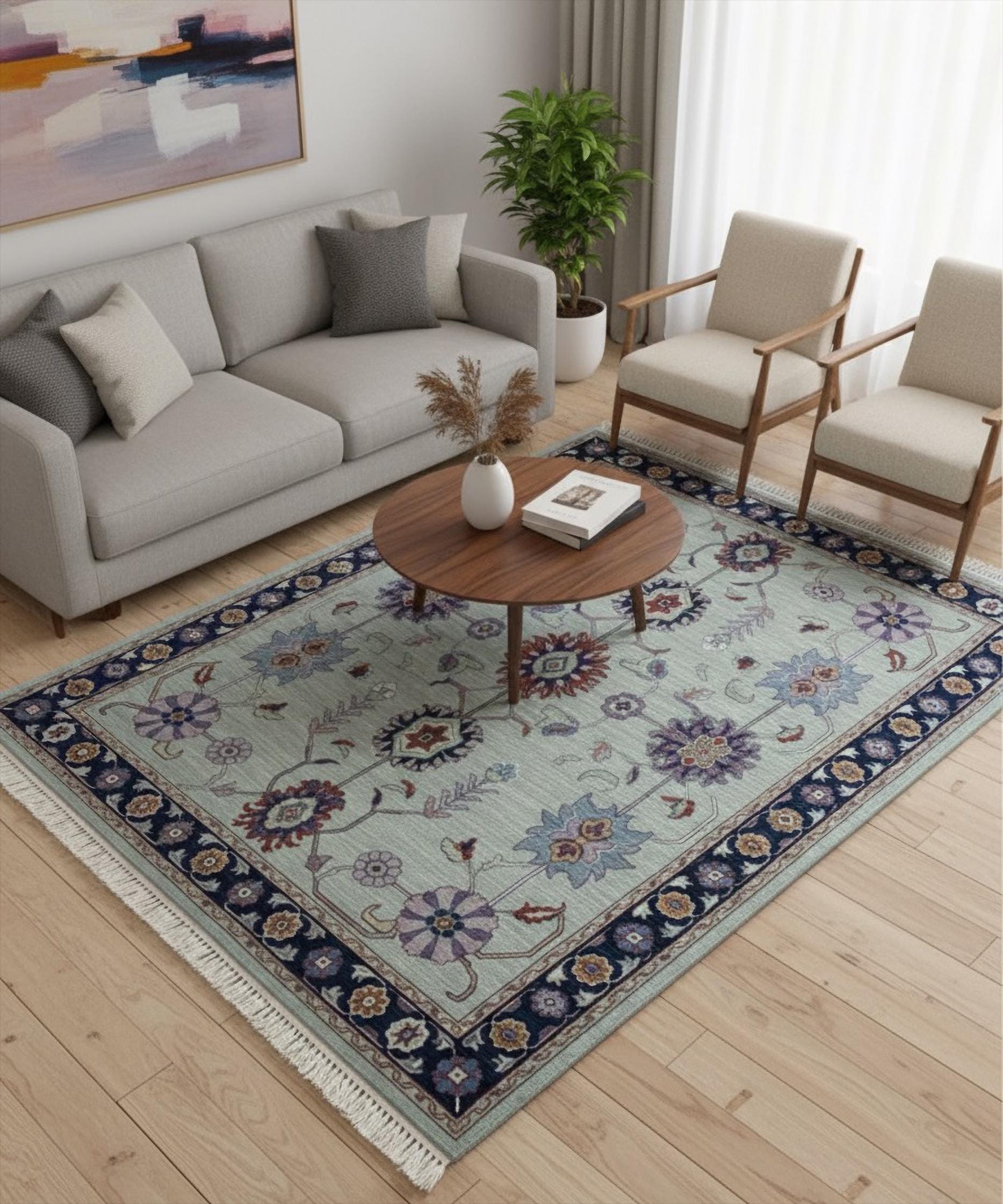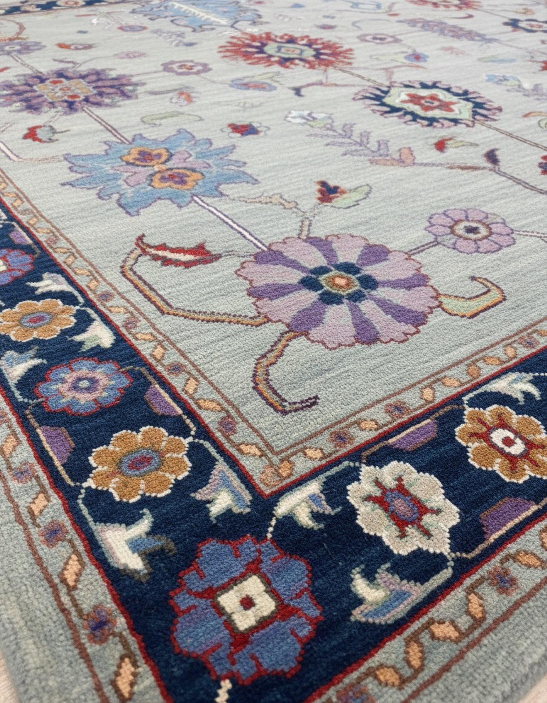• Pattern: Traditional Oushak floral design with symmetrical botanical motifs and a detailed navy border
