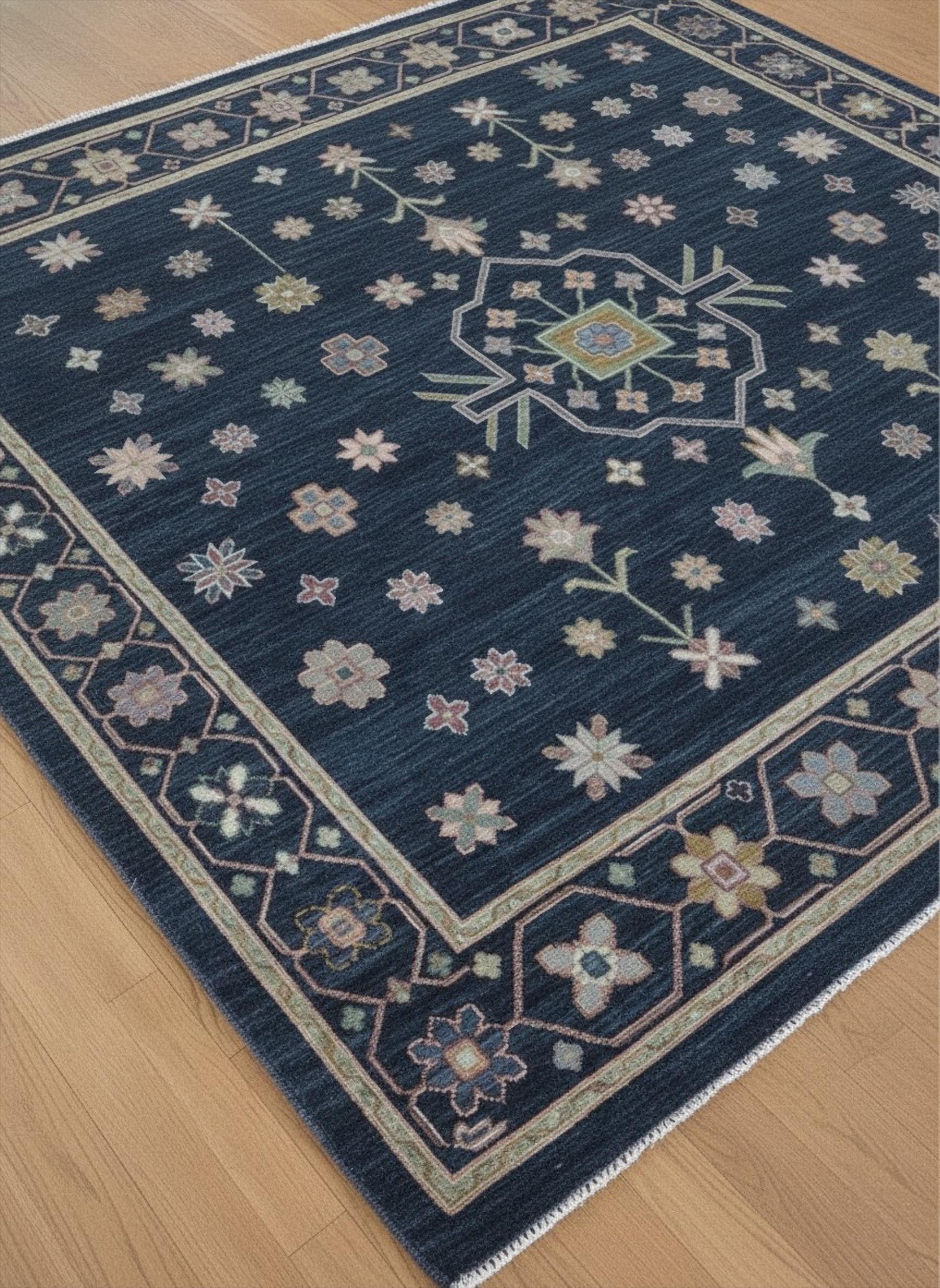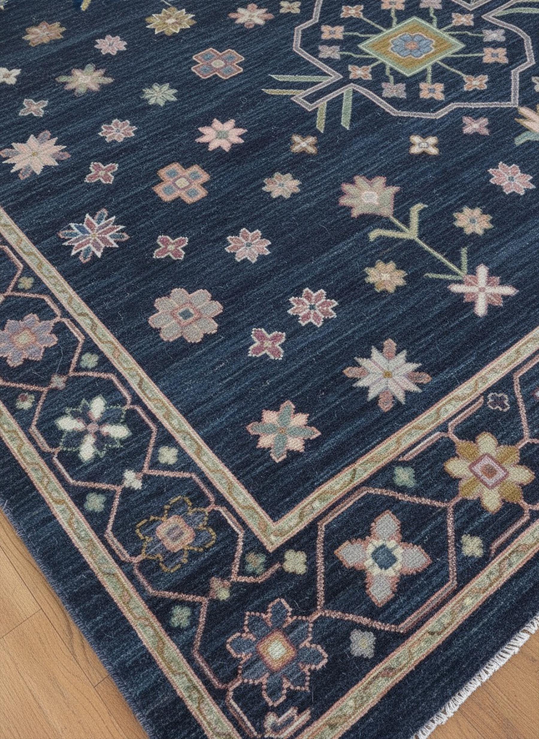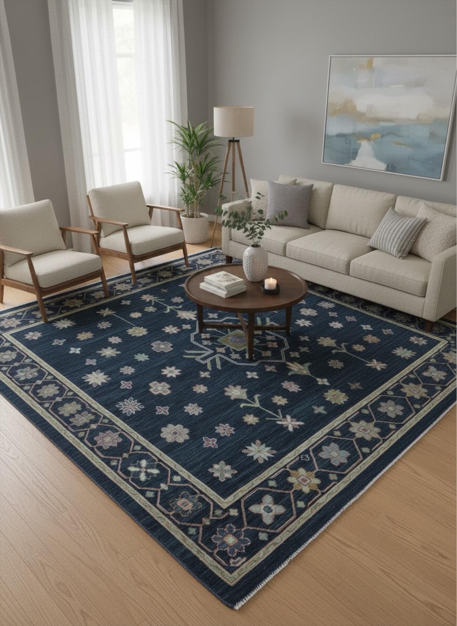 Step into a room that feels instantly calmer, warmer, and more inviting. This hand knotted Oushak wool rug brings a sense of comfort the moment you lay it down. Its deep navy blue base and soft floral accents create a soothing, timeless look that makes your space feel thoughtfully styled and effortlessly cozy. If you love décor that tells a story, this rug is the piece that completes your home.