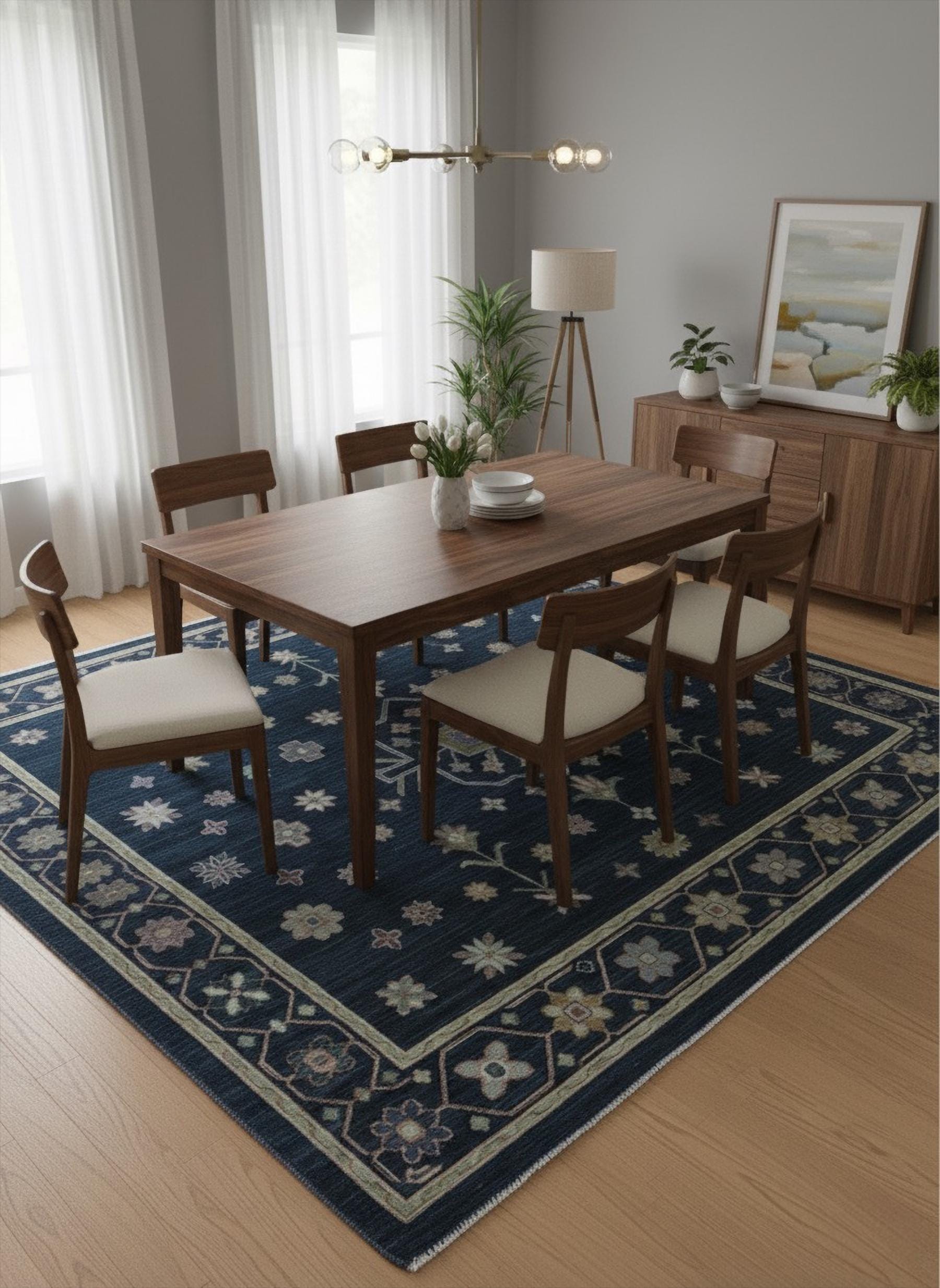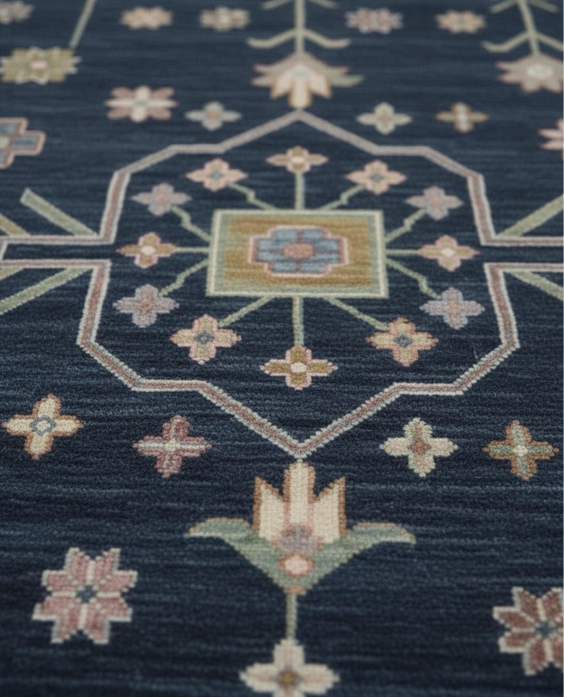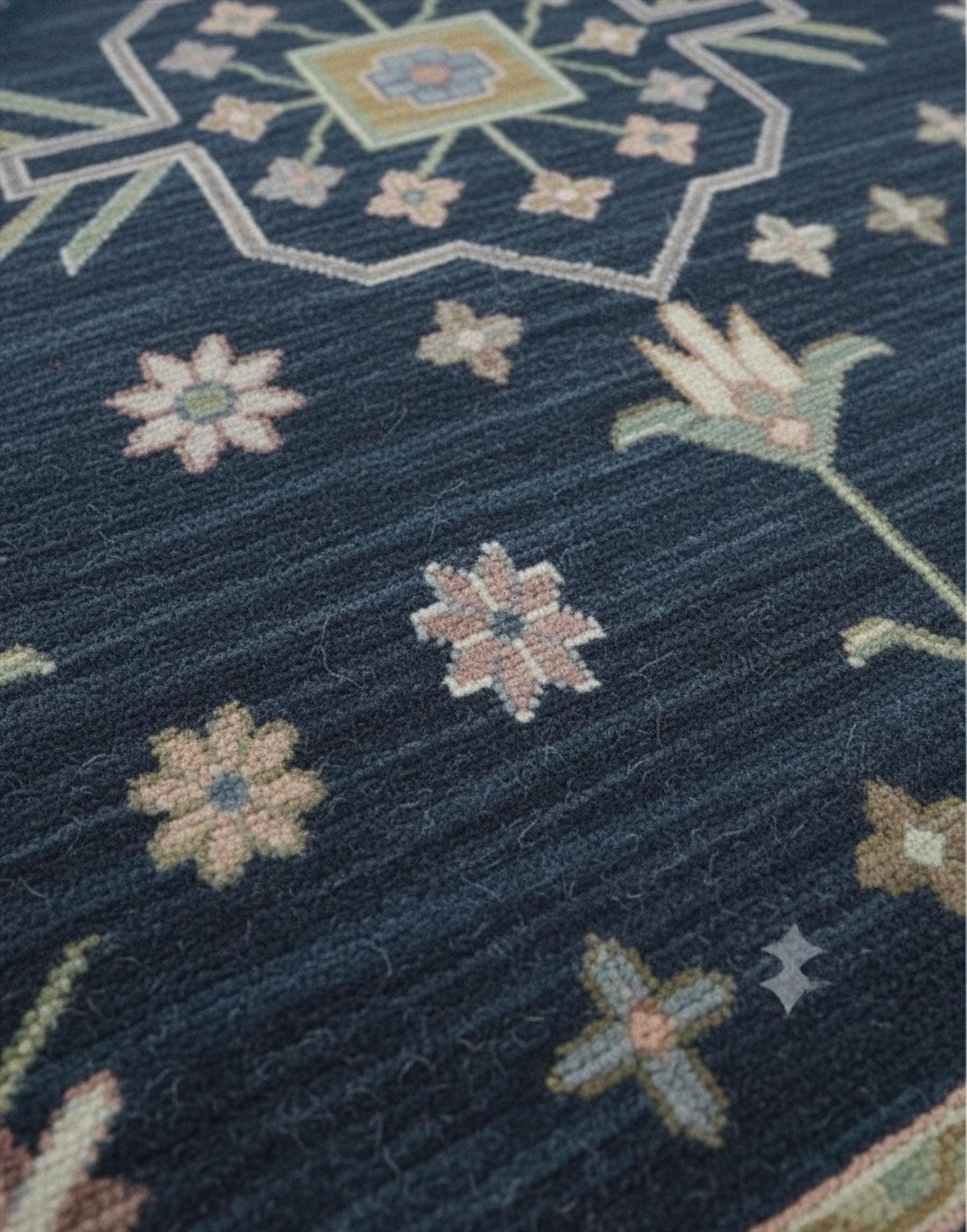 Step into a room that feels instantly calmer, warmer, and more inviting. This hand knotted Oushak wool rug brings a sense of comfort the moment you lay it down. Its deep navy blue base and soft floral accents create a soothing, timeless look that makes your space feel thoughtfully styled and effortlessly cozy. If you love décor that tells a story, this rug is the piece that completes your home.