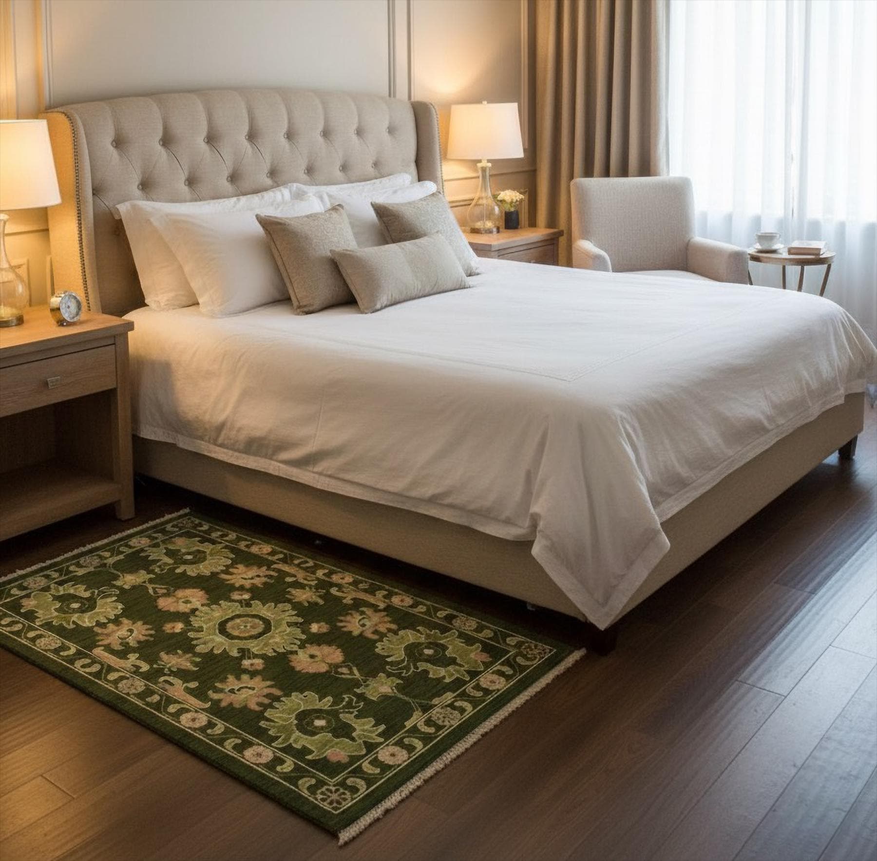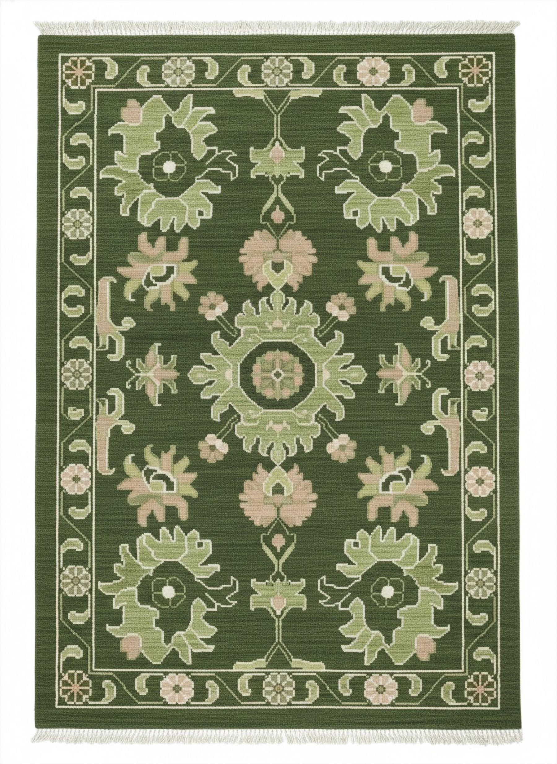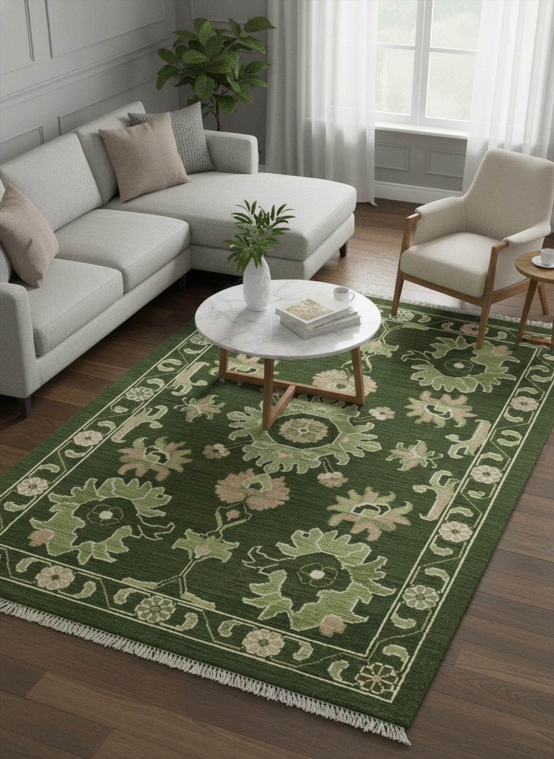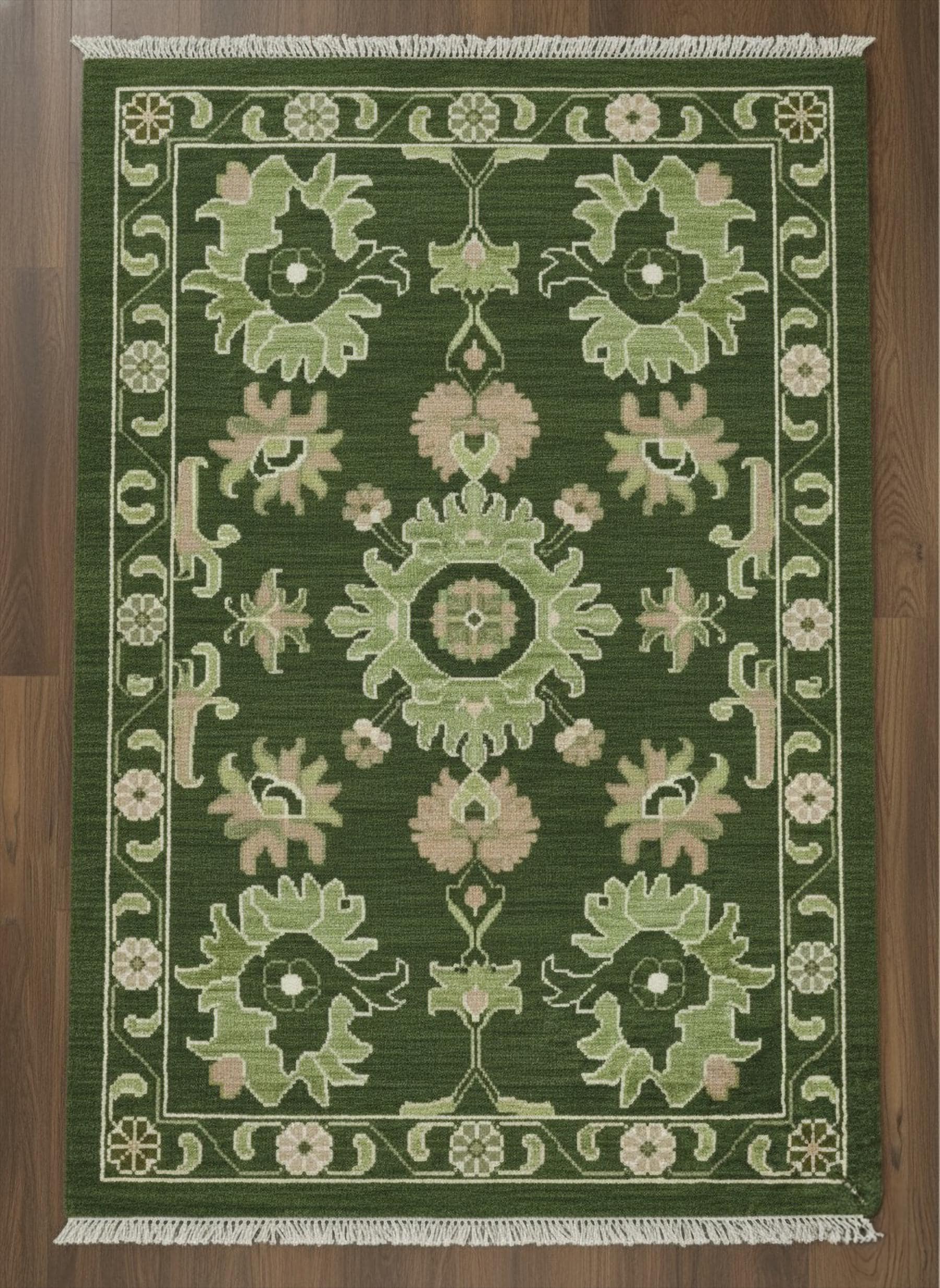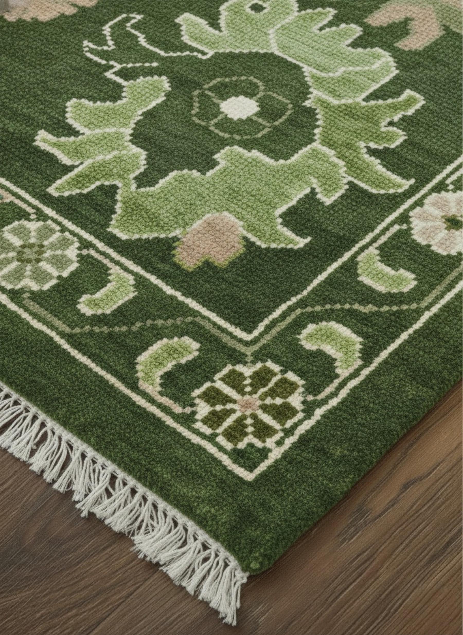 Bring timeless elegance into your home with this beautifully hand knotted Oushak wool rug. Featuring a rich olive green base with soft floral details, this rug adds warmth, character, and heritage charm to any space. Carefully crafted by skilled artisans using natural wool, it offers lasting durability, cozy comfort, and a classic look that never goes out of style. Perfect for creating a welcoming, refined atmosphere in your living room or bedroom.